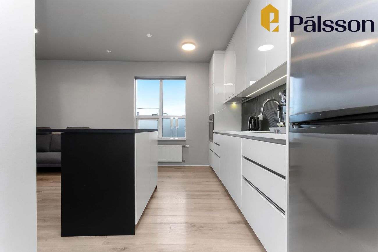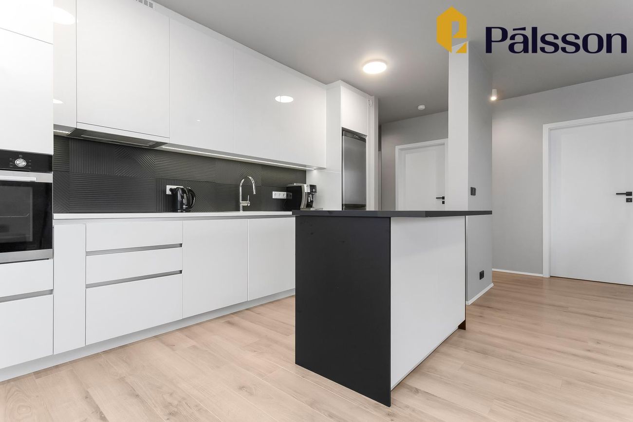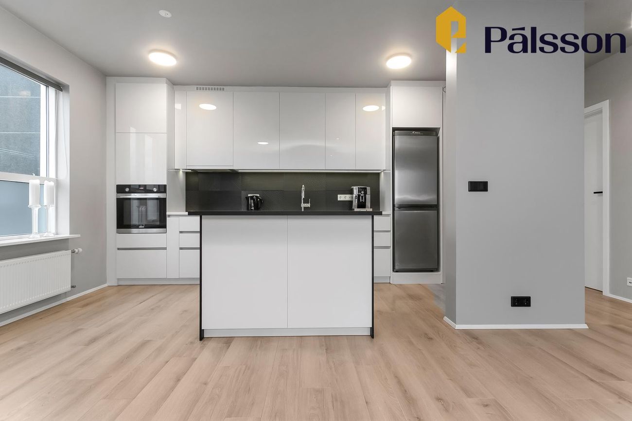 Eldhús með ljósri innréttingu, dökkar flísar á milli, ofn í vinnuhæð, innbyggð uppþvottavél og lausa eyja. Parket á gólfi.