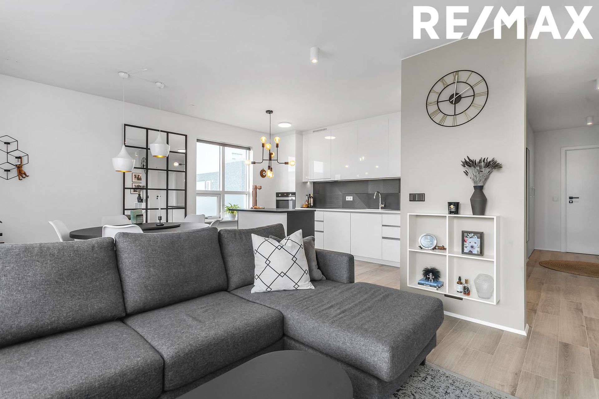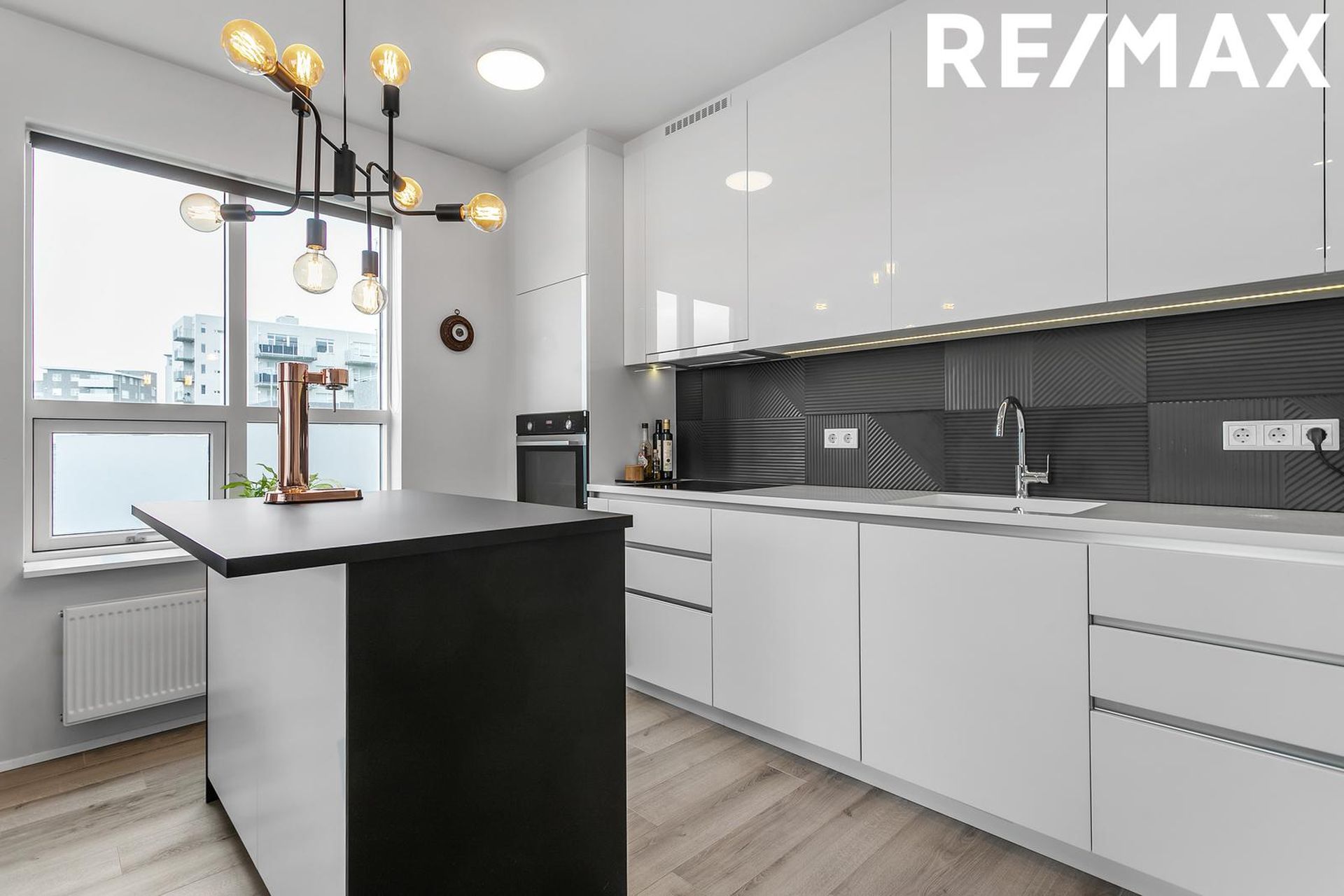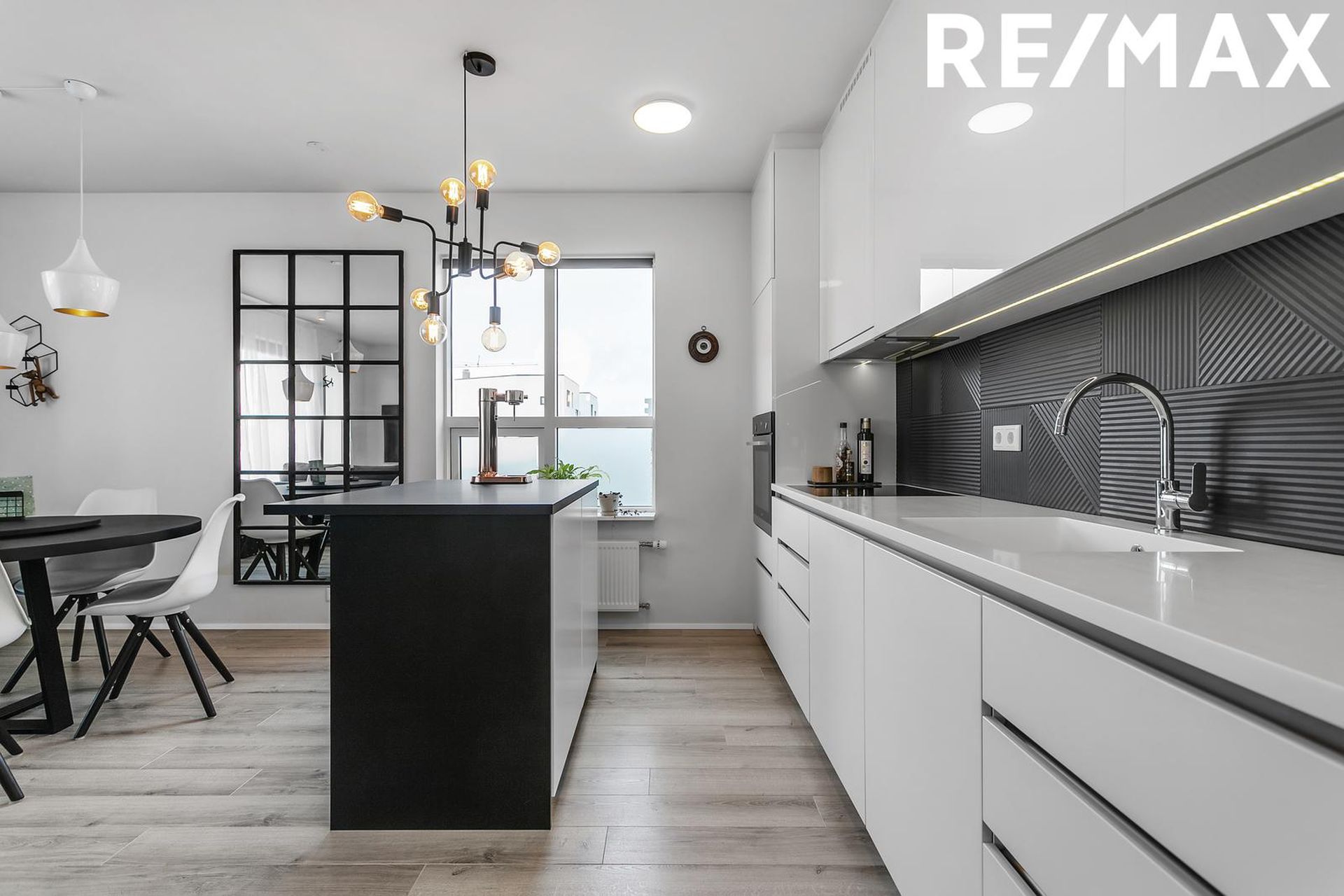 Eldhús með ljósri innréttingu, dökkar flísar á milli, ofn í vinnuhæð, innbyggð uppþvottavél og lausa eyja. Parket á gólfi.