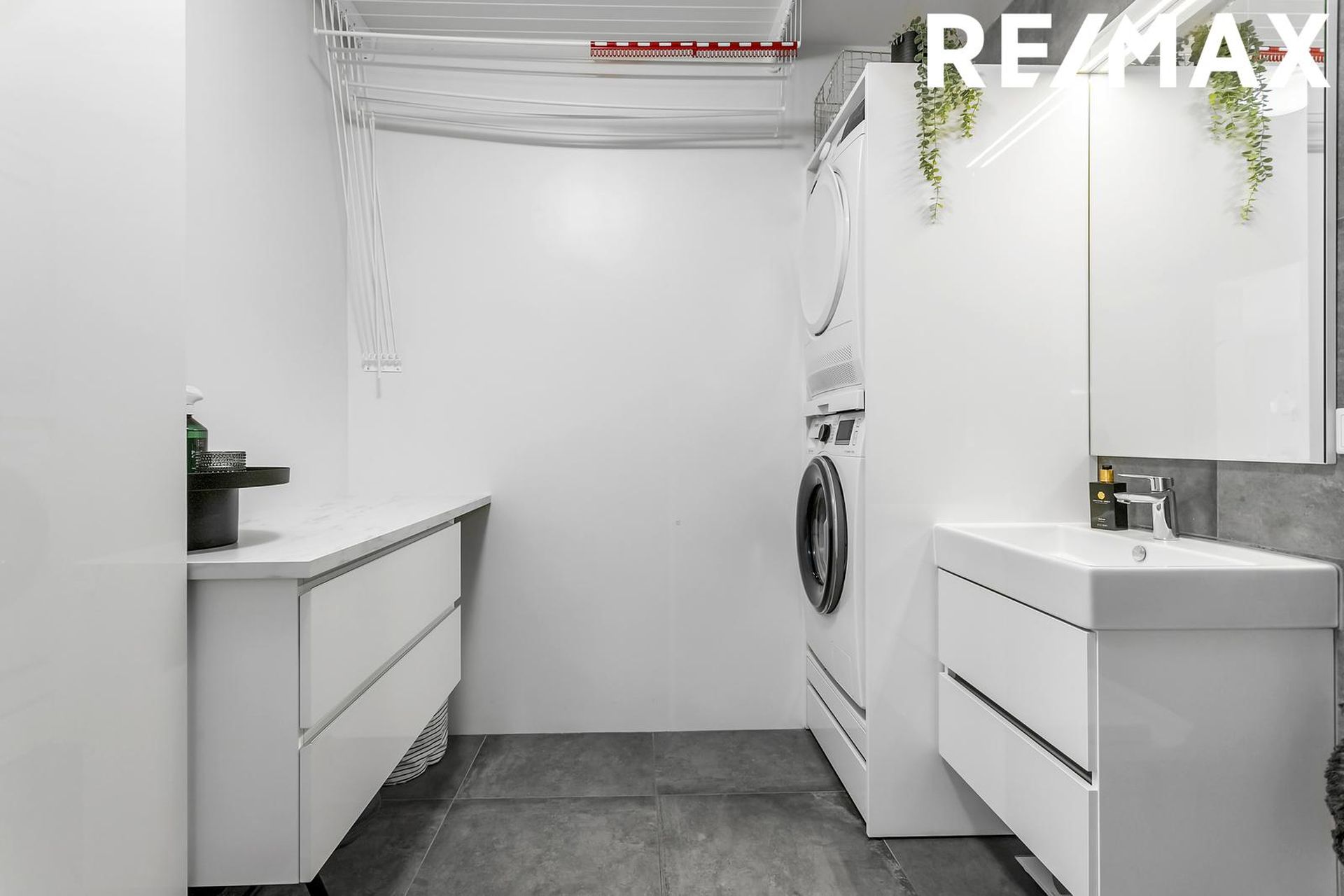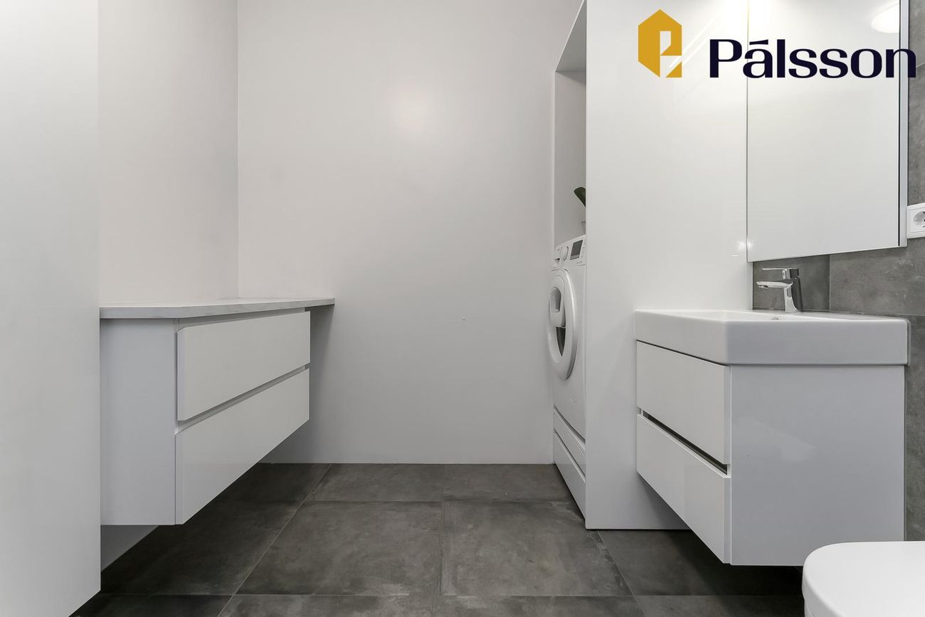 Þvottahús inní íbúðinni, staðsett í baðherbergi með þvottaaðstöðu.