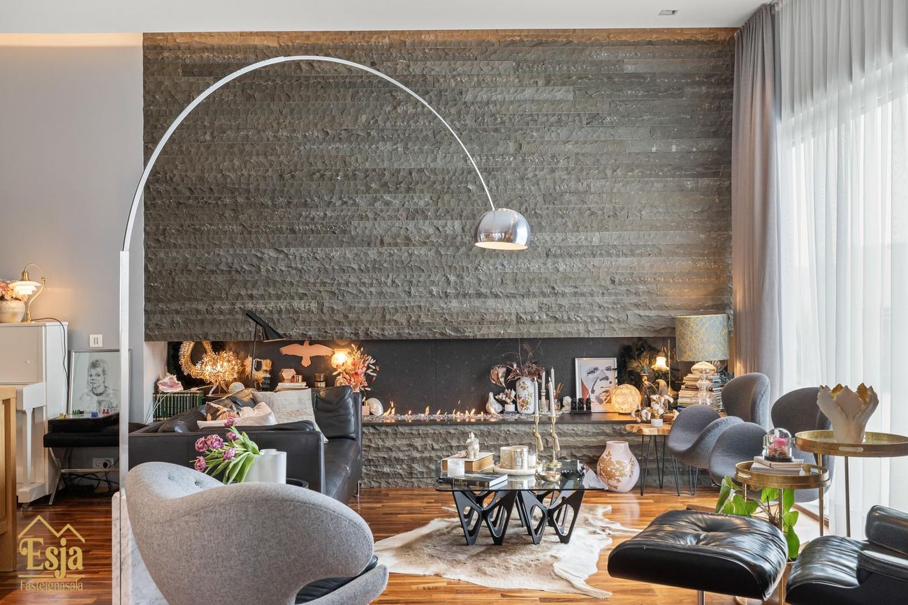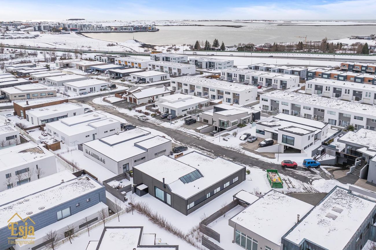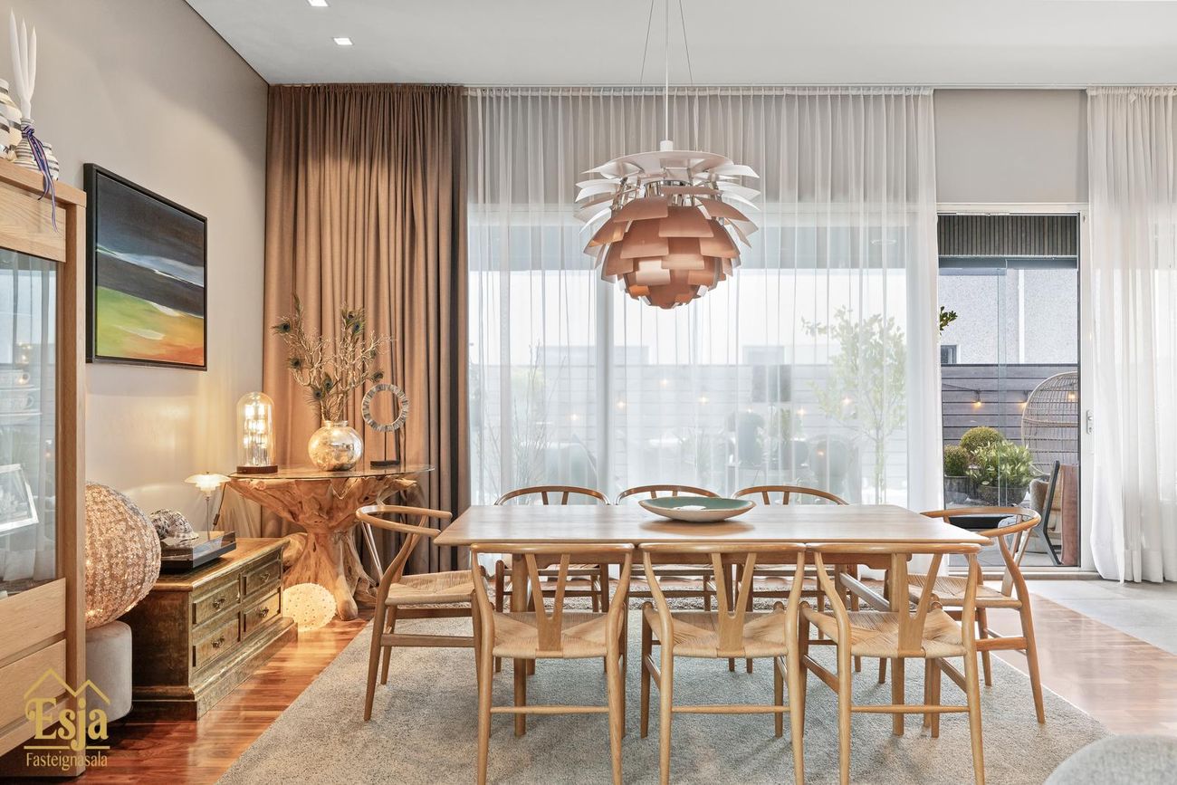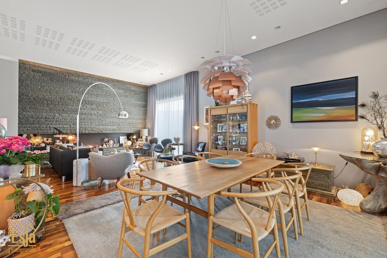 Stofurnar eru stórar og glæsilegar með mikili lofthæð, hljóðvistarplötur og innfelld lýsng í lofti og glæsilegur arinn sem felldur er inn í steini klæddan vegg setur sterkan svip á rýmið. Setustofa og borðstofa eru í einu flæði, borðstofan og eldhús eru samhliða með gólfsíðum gluggum með stórri rennihurð út í nýlega garðstofu (18,6 fm) sem flæðir áfram út á verönd meðfram vesturhlið hússins og út í afgirtan garðinn. Þetta hús er sannkallað veisluhús með góðri aðstöðu og flæði fyrir gesti og heimafólk.