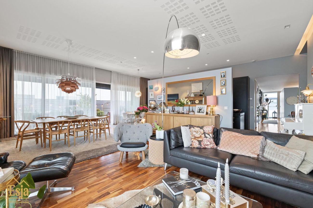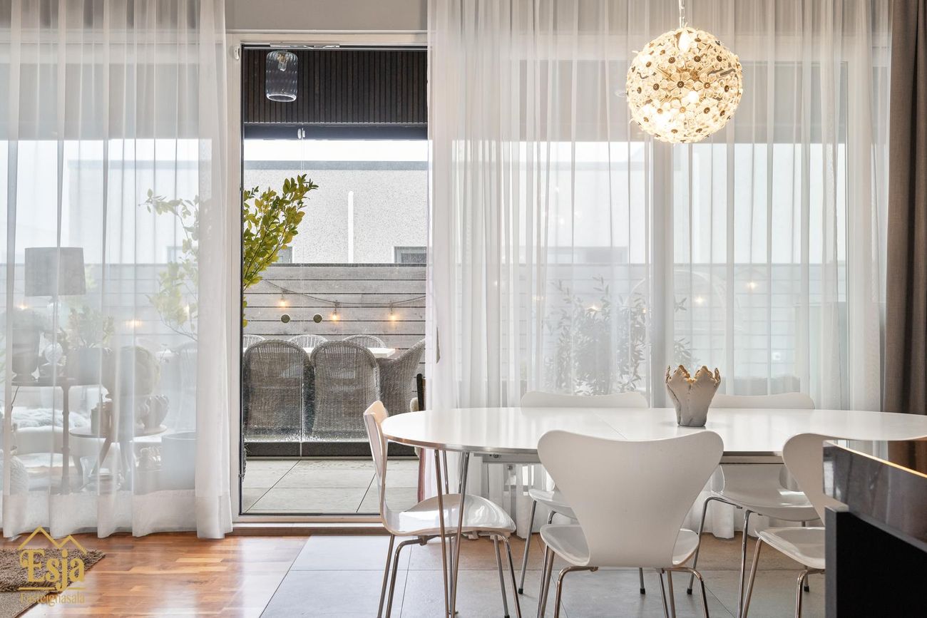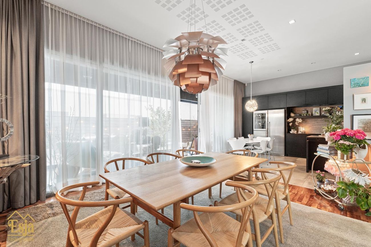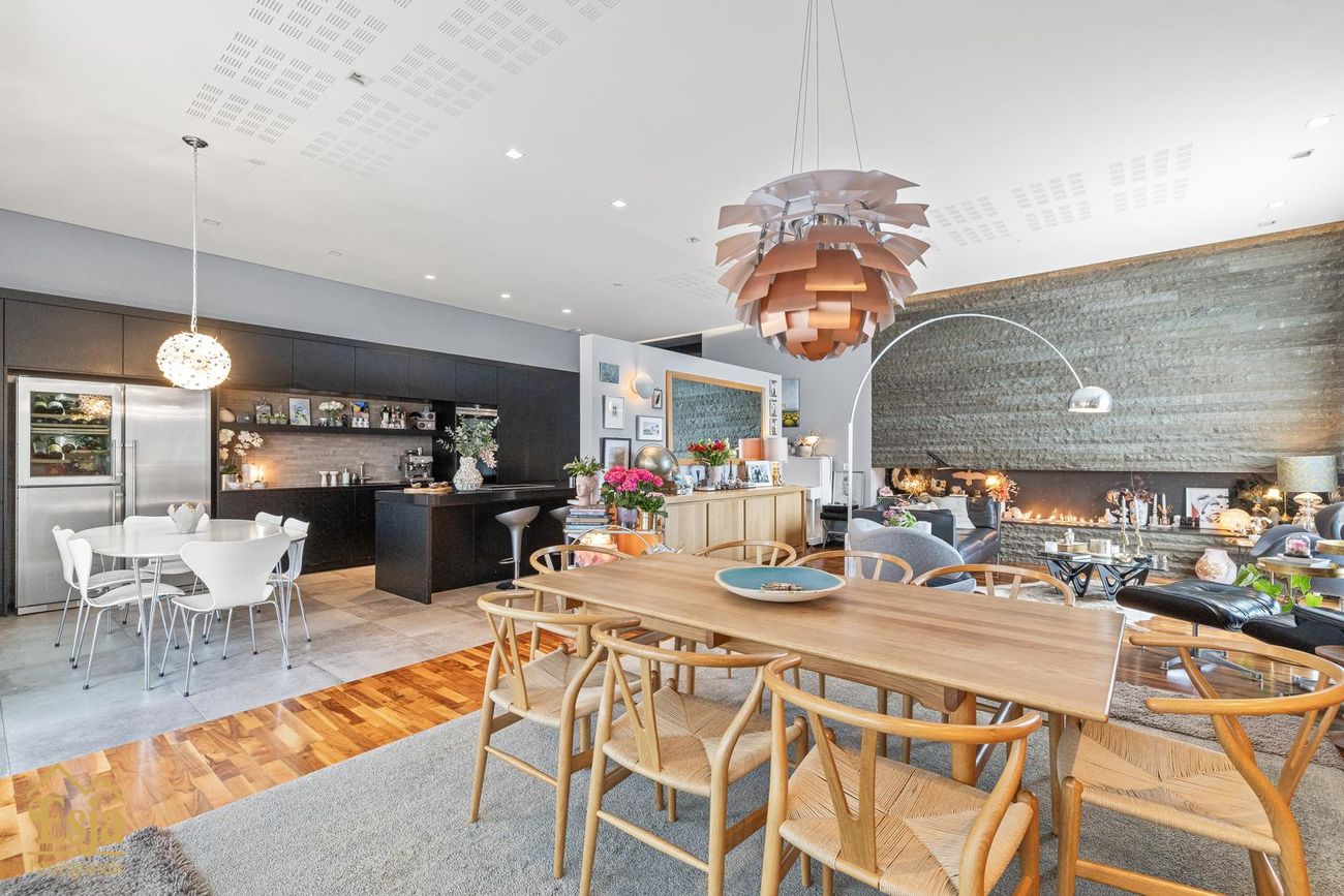 Stofurnar eru stórar og glæsilegar með mikili lofthæð, hljóðvistarplötur og innfelld lýsng í lofti og glæsilegur arinn sem felldur er inn í steini klæddan vegg setur sterkan svip á rýmið. Setustofa og borðstofa eru í einu flæði, borðstofan og eldhús eru samhliða með gólfsíðum gluggum með stórri rennihurð út í nýlega garðstofu (18,6 fm) sem flæðir áfram út á verönd meðfram vesturhlið hússins og út í afgirtan garðinn. Þetta hús er sannkallað veisluhús með góðri aðstöðu og flæði fyrir gesti og heimafólk.