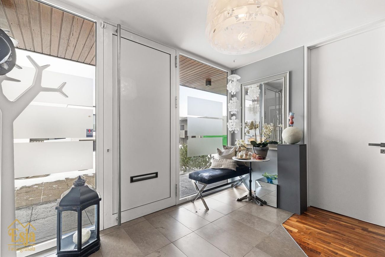 Allt efnisval hefur samhljóm, sérsmíðaðar innréttingar í eldhúsi og forstofu eru frá Hegg, vandað, gegnheilt hnotuparket á gólfum þar sem ekki eru flísar (votrými og eldhús), innihurðir eru með aukinni hæð.