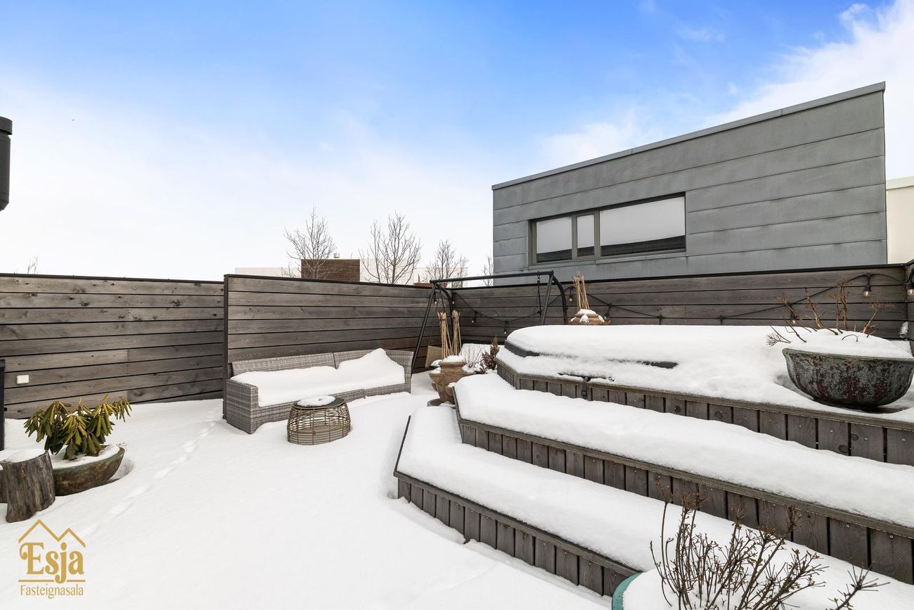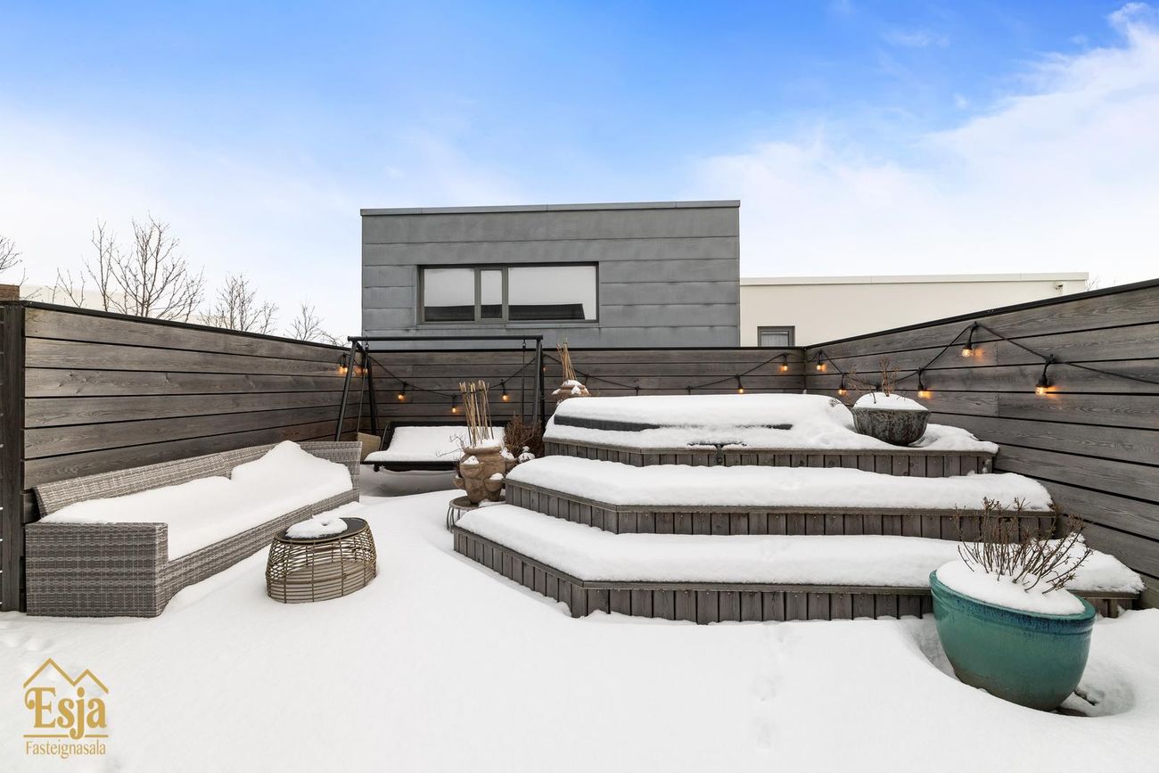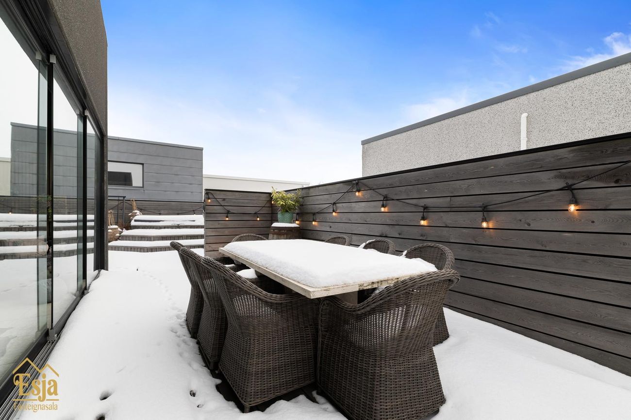 Garðurinn er glæsilegur og fullbúinn, garðstofan klædd náttúrusteini og hljóðvistarplötum, þykkar steinhellur/flísar eru samsvarandi og á palli fyrir framan húsið. Vandaður pallar úr viðhaldsfríu lerki með innbyggðri lýsingu og skjólveggjum skapa framhald af húsinu, þar er heitur pottur og gott útisvæði, lagt hefur verið fyrir útisturtu, 4 fm. útigeymsla fellur inn í skjólvegg fyrir aftan húsið.