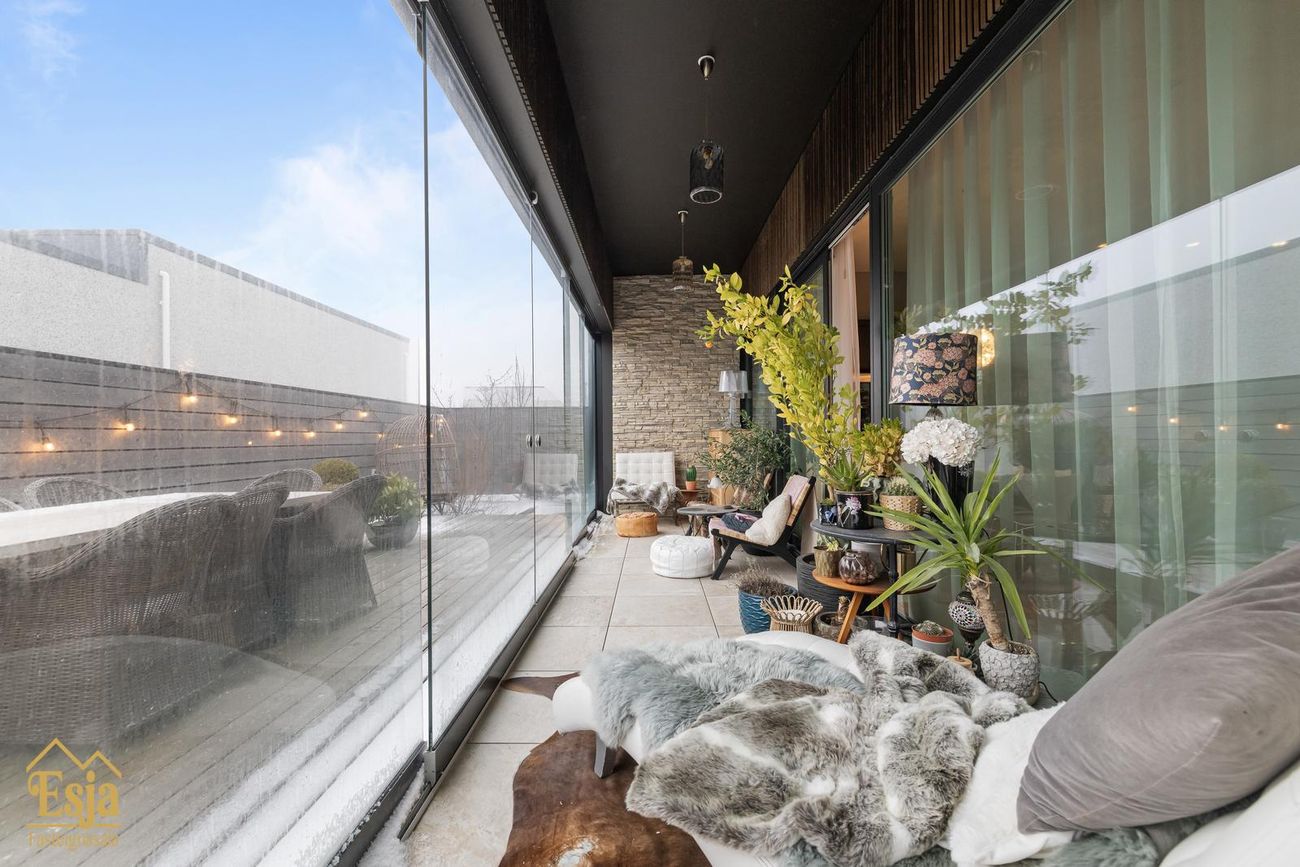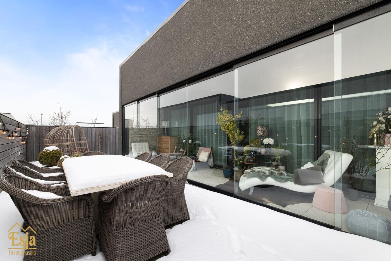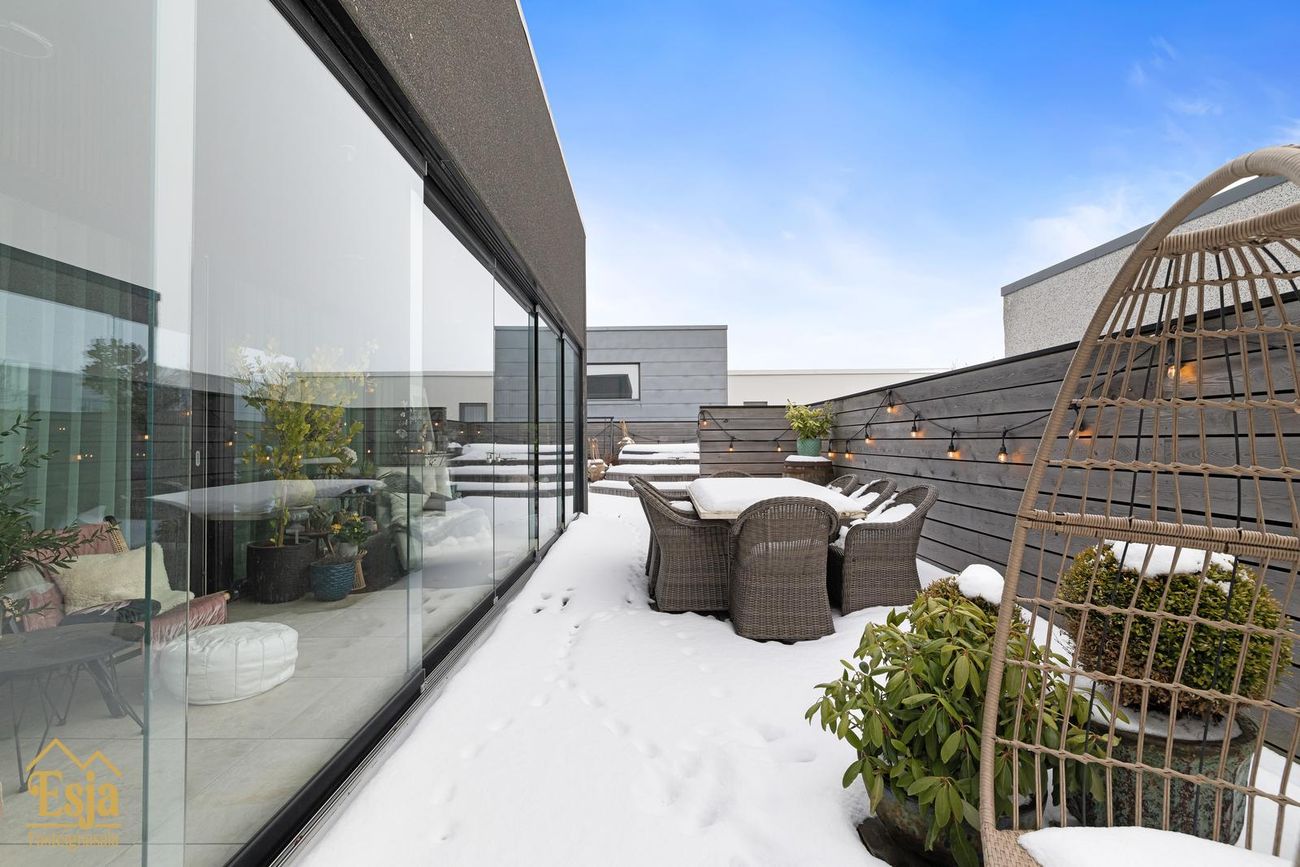 Garðurinn er glæsilegur og fullbúinn, garðstofan klædd náttúrusteini og hljóðvistarplötum, þykkar steinhellur/flísar eru samsvarandi og á palli fyrir framan húsið. Vandaður pallar úr viðhaldsfríu lerki með innbyggðri lýsingu og skjólveggjum skapa framhald af húsinu, þar er heitur pottur og gott útisvæði, lagt hefur verið fyrir útisturtu, 4 fm. útigeymsla fellur inn í skjólvegg fyrir aftan húsið.
