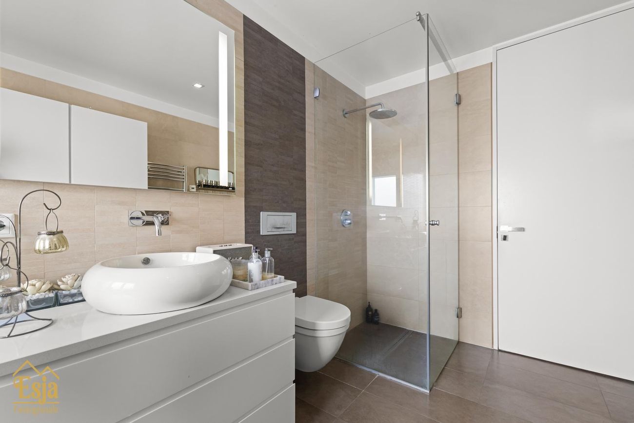 Baðherbergi er í holi/gangi, það er flísalagt með "walk-in" sturtuklefa, upphengdu salerni og innréttingu með handlaug.