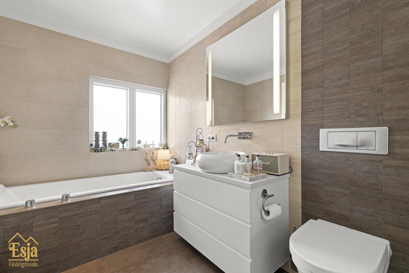 Húsið er á einni hæð með afar góðu skipulagi en þar er forstofa, 4 svefnherbergi, 3 baðherbergi, stórar stofur, garðstofa og eldhús, þvottahús, bakdyra forstofa og innangengt í bílskúr.