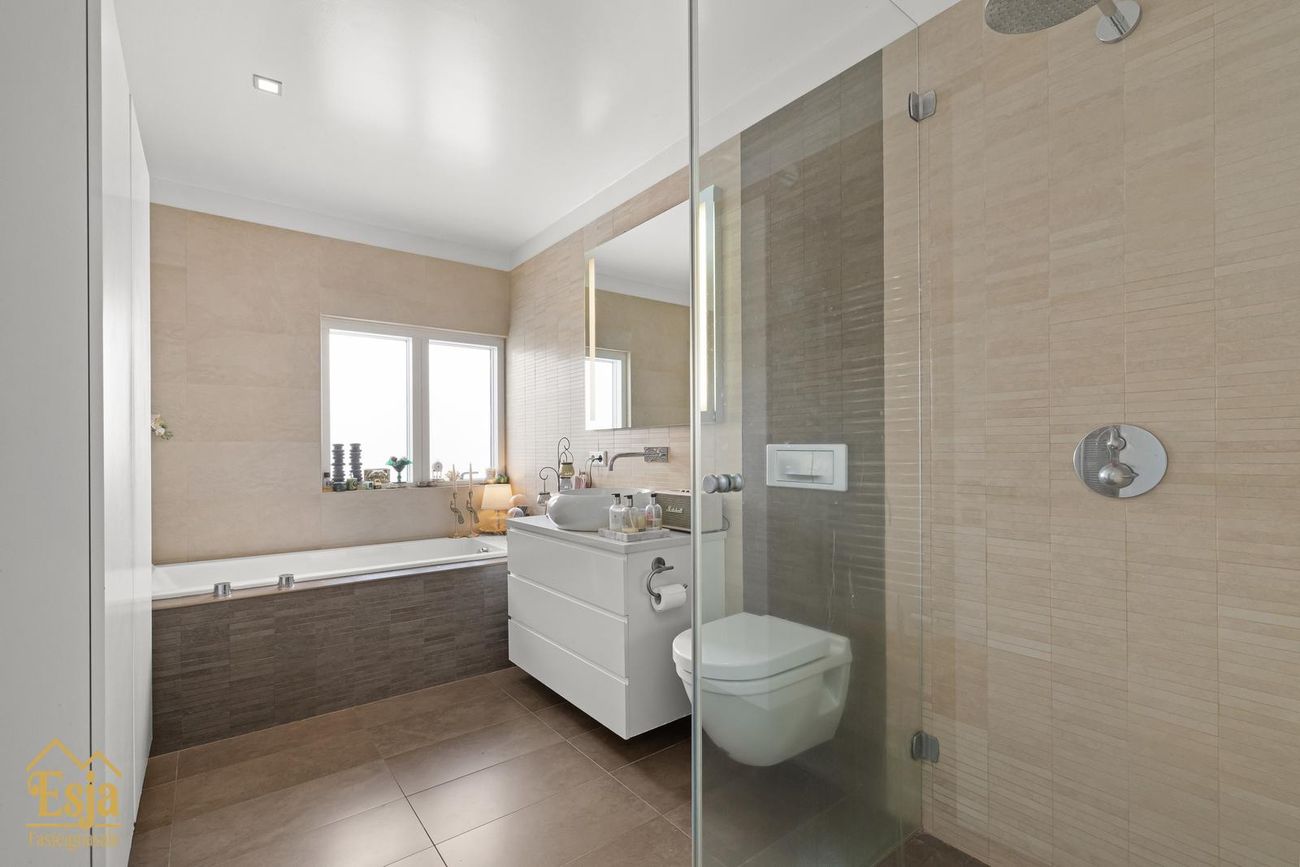 Á svefnherbergisgangi eru tvö barnaherbergi og gott baðherbergi með baðkari og "walk-in" sturtu, innréttingu og glugga með opnanlegu fagi, glæsileg hjónasvíta er innst á ganginum. Þar er svefnherbergi með baðherberbergi með "walk-in" sturtu, upphengdu salerni og innréttingu með handlaug sem og innréttað fataherbergi. Fyrir framan hjónaherbergið er afdrep sem hentar vel sem vinnusvæði/heimaskrifstofa. Fjórða herbergið er staðsett næst forstofunni sem gæti hentað vel fyrir unglinginn. Sjónvarsphol/fjölskyldurými er fyrir framan herbergin og stúkar þannig af stofu og eldhúsrými frá svefnherbergjunum.