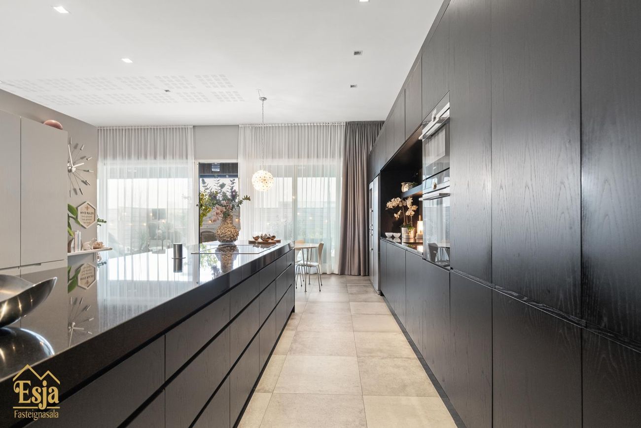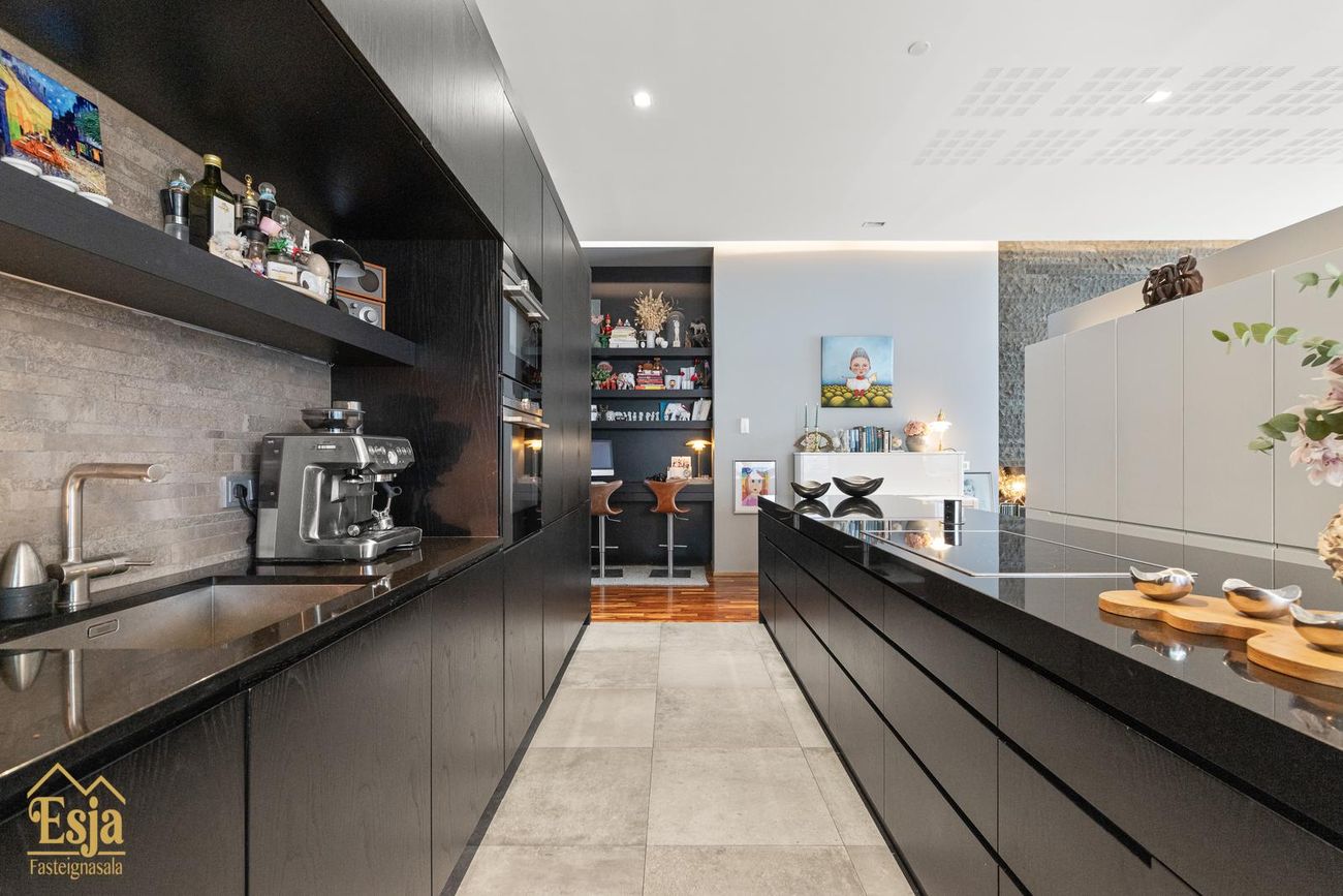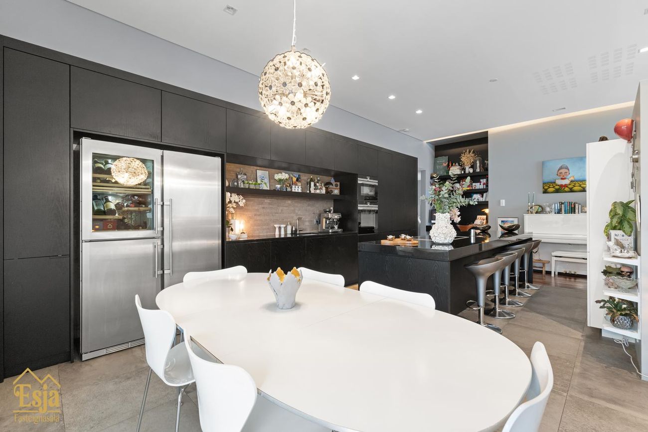 Eldhúsið er veglegt, sérhannaðar innréttingar eru framleiddar af Hegg innréttingasmiðju, granít frá S. Helgasyni og vönduð eldhústæki frá Sie mens. Innrétting þekur heilan vegg, þar er m.a. pláss fyrir tvo ísskápa, innbyggða uppþvottavél, tvo ofna, innbyggður tækjaskápur er með rafmagni og gott geymslu pláss. Stór og glæsileg eyja, klædd graníti er með 80 cm. helluborði, vinnuaðstöðu og aðstöðu fyrir 5-6 til að sitja við er hjarta eldhússins. Léttur veggur milli eldhúss og setustofunnar brýtur rýmið upp. Þá eru innbyggðar hillur og bekkur tilvalið fyrir heima vinnuaðstöðu.
