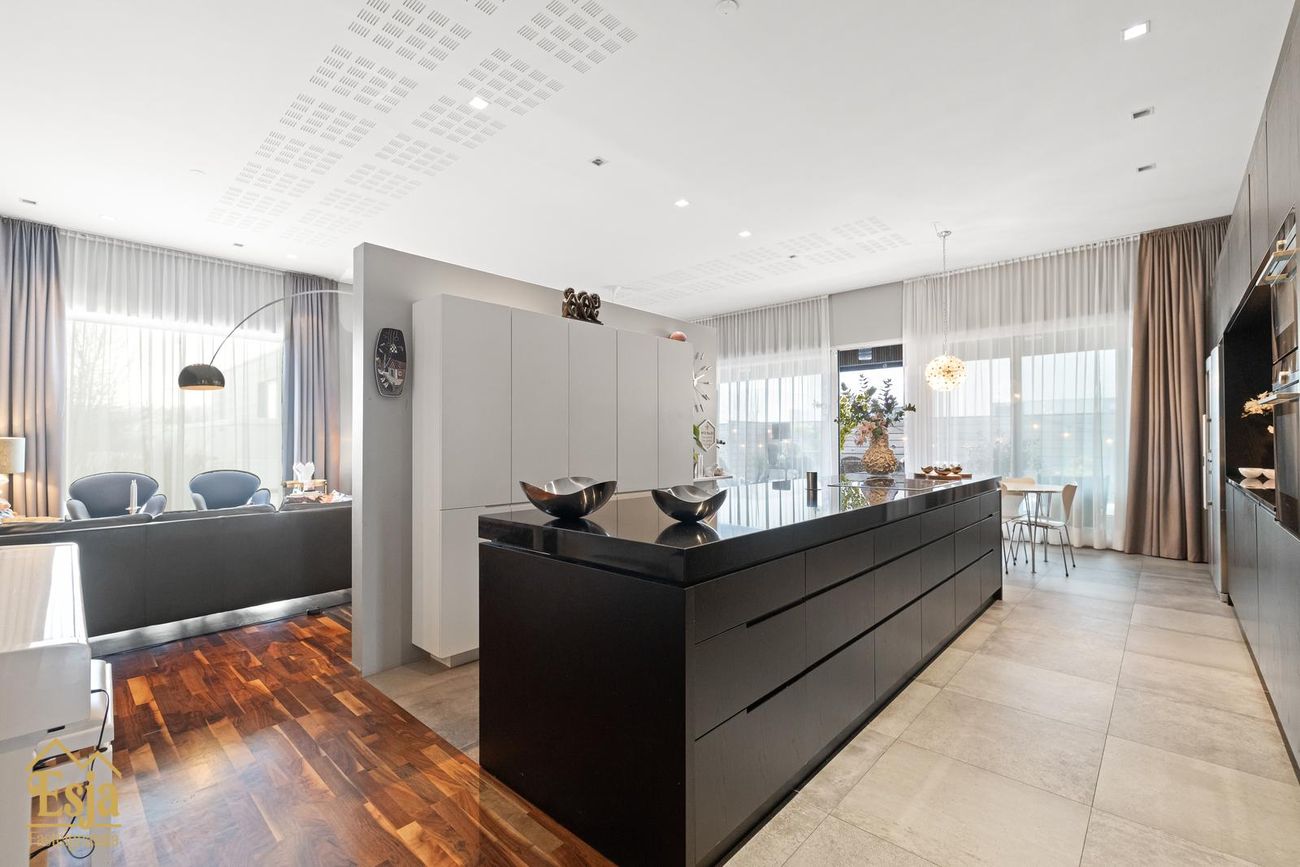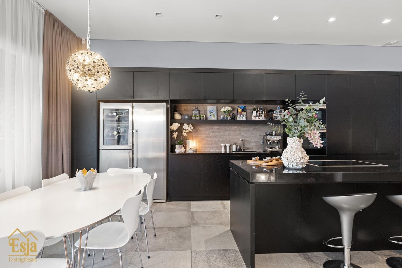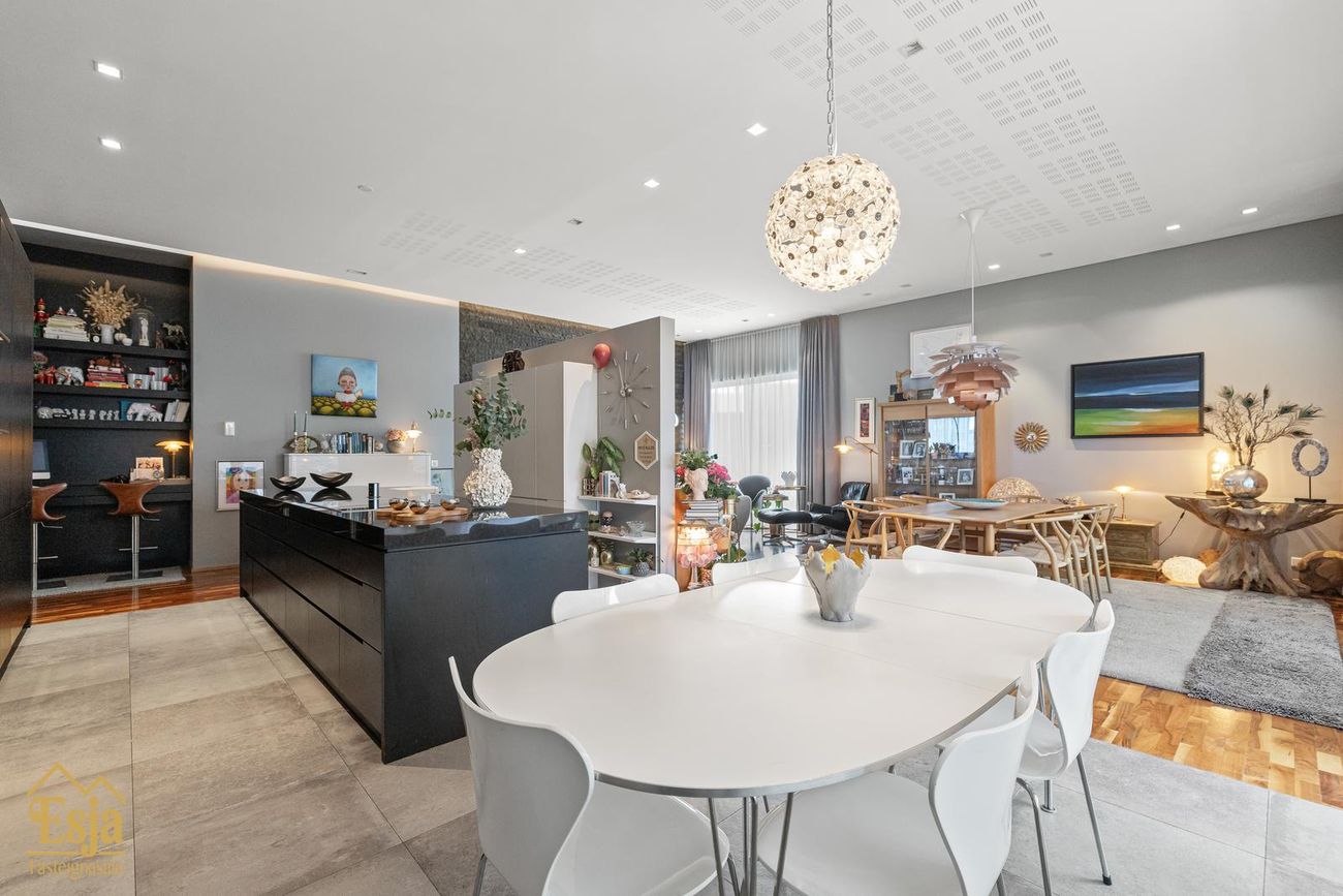 Eldhúsið er veglegt, sérhannaðar innréttingar eru framleiddar af Hegg innréttingasmiðju, granít frá S. Helgasyni og vönduð eldhústæki frá Sie mens. Innrétting þekur heilan vegg, þar er m.a. pláss fyrir tvo ísskápa, innbyggða uppþvottavél, tvo ofna, innbyggður tækjaskápur er með rafmagni og gott geymslu pláss. Stór og glæsileg eyja, klædd graníti er með 80 cm. helluborði, vinnuaðstöðu og aðstöðu fyrir 5-6 til að sitja við er hjarta eldhússins. Léttur veggur milli eldhúss og setustofunnar brýtur rýmið upp. Þá eru innbyggðar hillur og bekkur tilvalið fyrir heima vinnuaðstöðu.