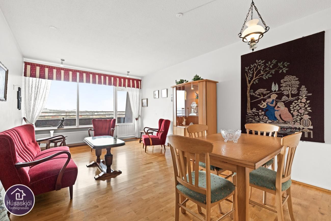 Lýsing eignar: Gengið er inn í forstofu með parketi á gólfi og fataskáp. Stofa með parketi, útgengt á svalir og fallegt útsýni yfir Bláfjöll og Voginn. Eldhús er við hlið stofu, U-laga eldhúsinnrétting, efri og neðri skápar, flísar á milli skápa, gluggi og parket á gólfi. Gangur með parketi. Þvottahús/geymsla innan íbúðar, dúkur á gólfi og hillur. Svefnherbergi er með parketi á gólfi og skápum. Baðherbergi er flísalagt í hólf og gólf með baðkari og innréttingu.