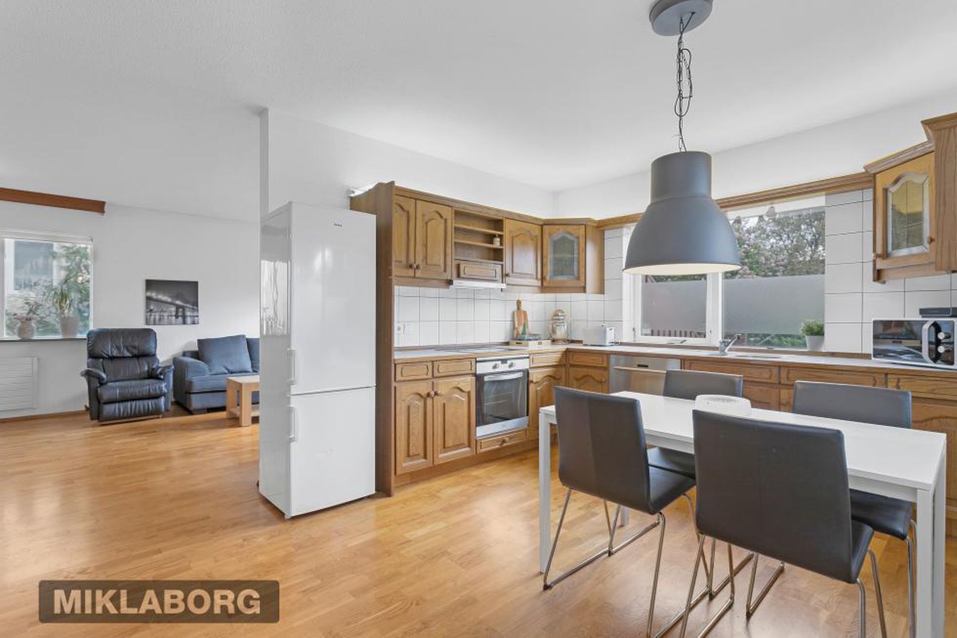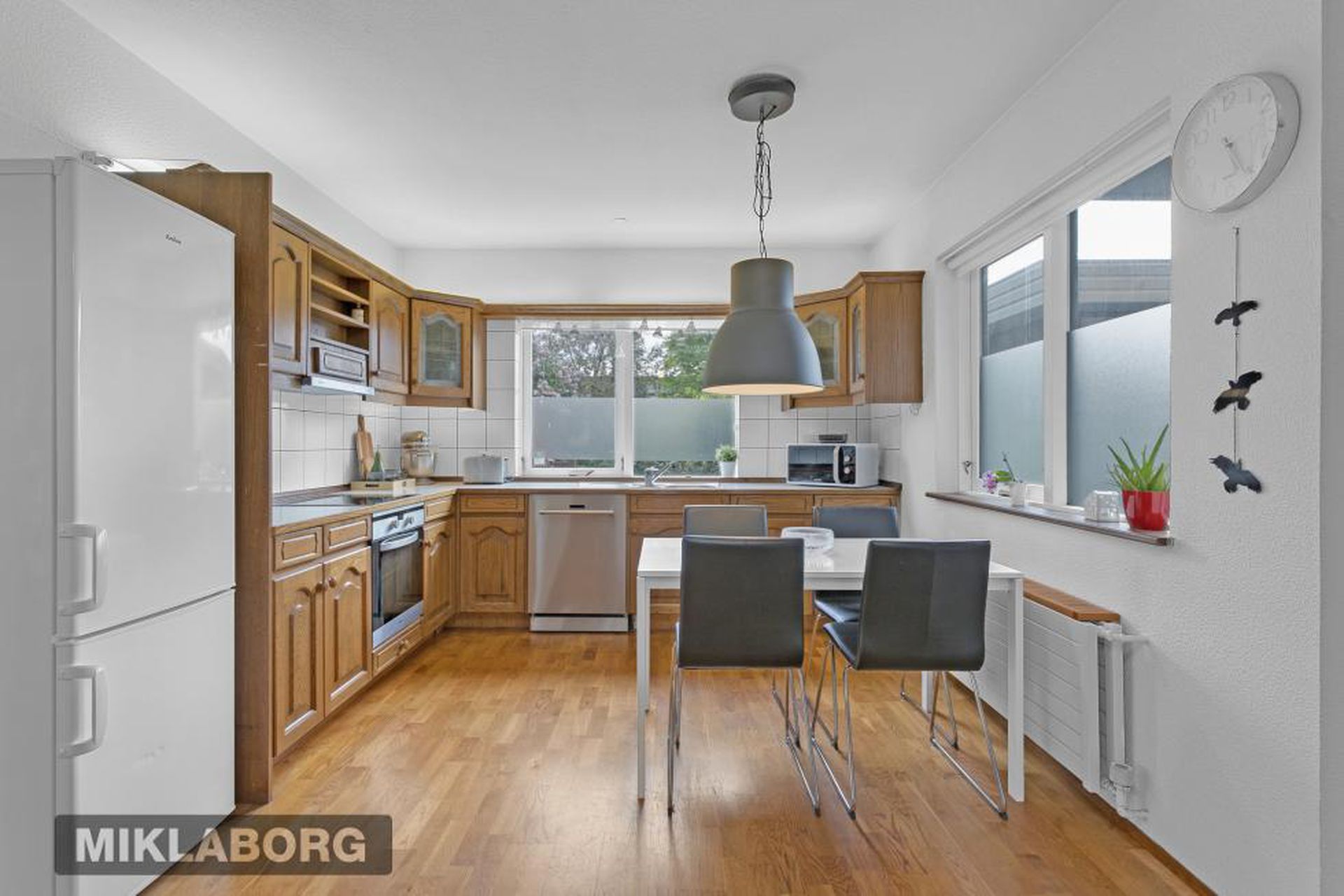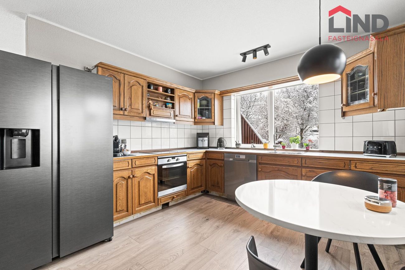 Eldhús: Með harðparketi á gólfi og viðar eldhúsinnréttingu. Gluggar til suðurs og vesturs. Stál bakaraofn, spansuðu helluborð, tengi fyrir uppþvottavél og flísar á milli skápa. Gott pláss fyrir eldhúsborð.
