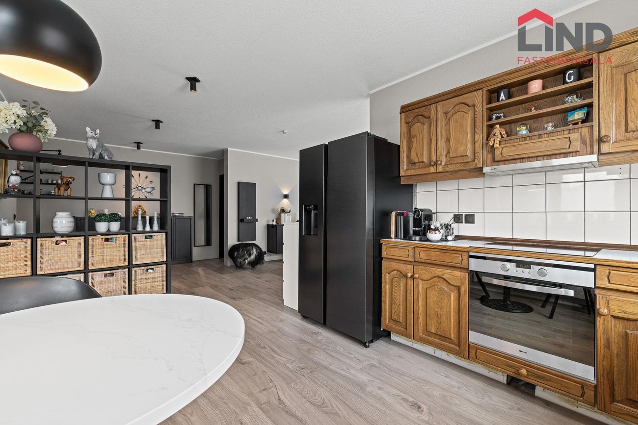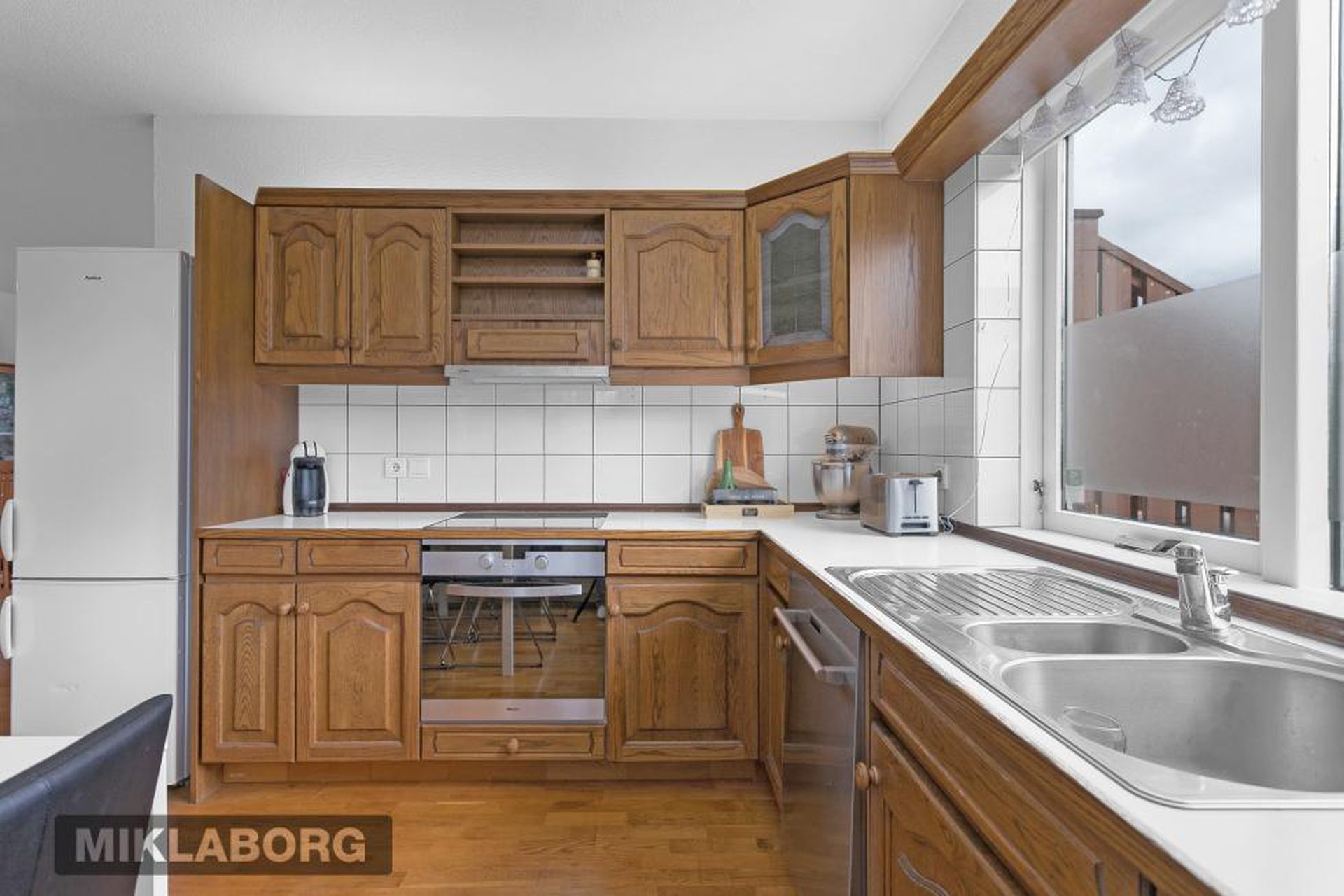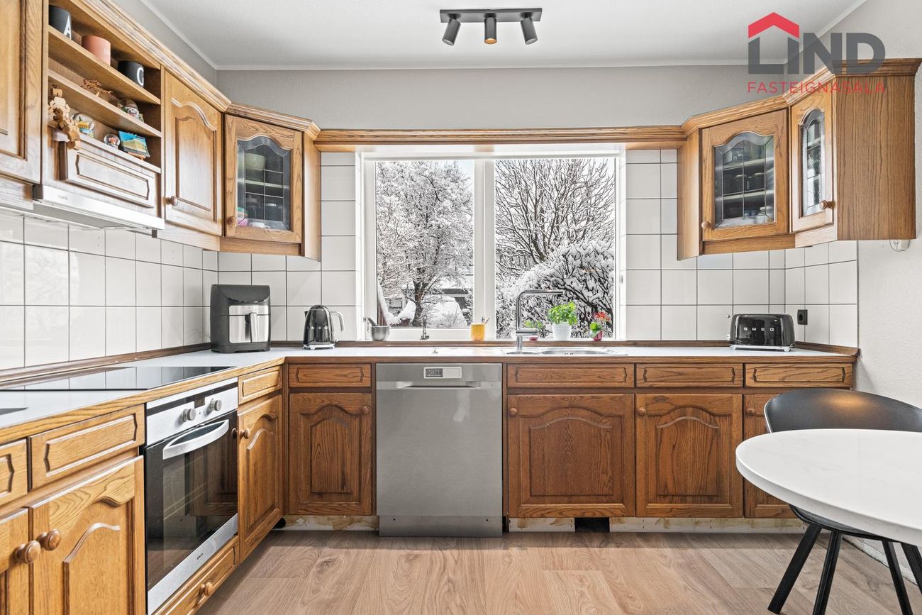 Eldhús: Með harðparketi á gólfi og viðar eldhúsinnréttingu. Gluggar til suðurs og vesturs. Stál bakaraofn, spansuðu helluborð, tengi fyrir uppþvottavél og flísar á milli skápa. Gott pláss fyrir eldhúsborð.