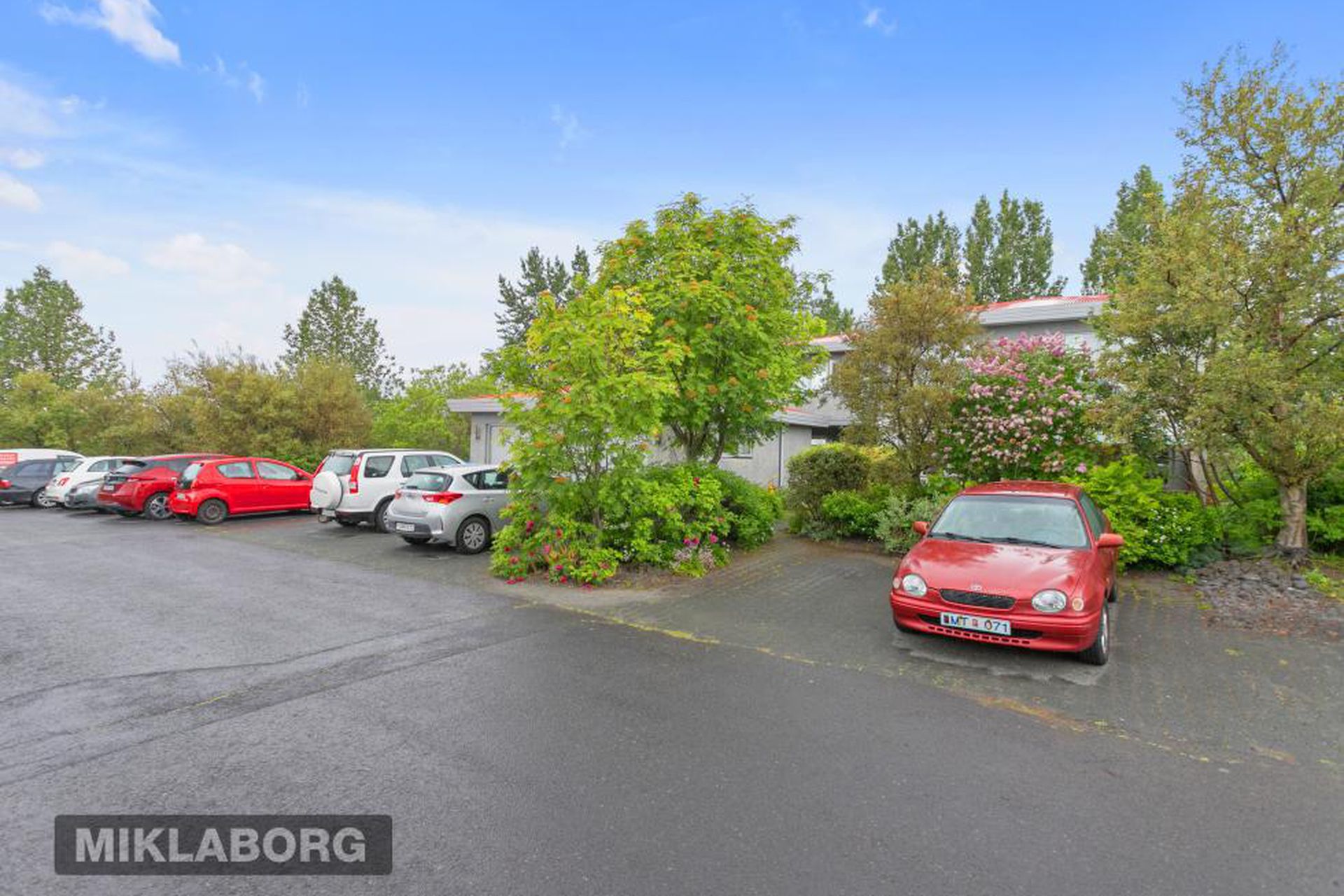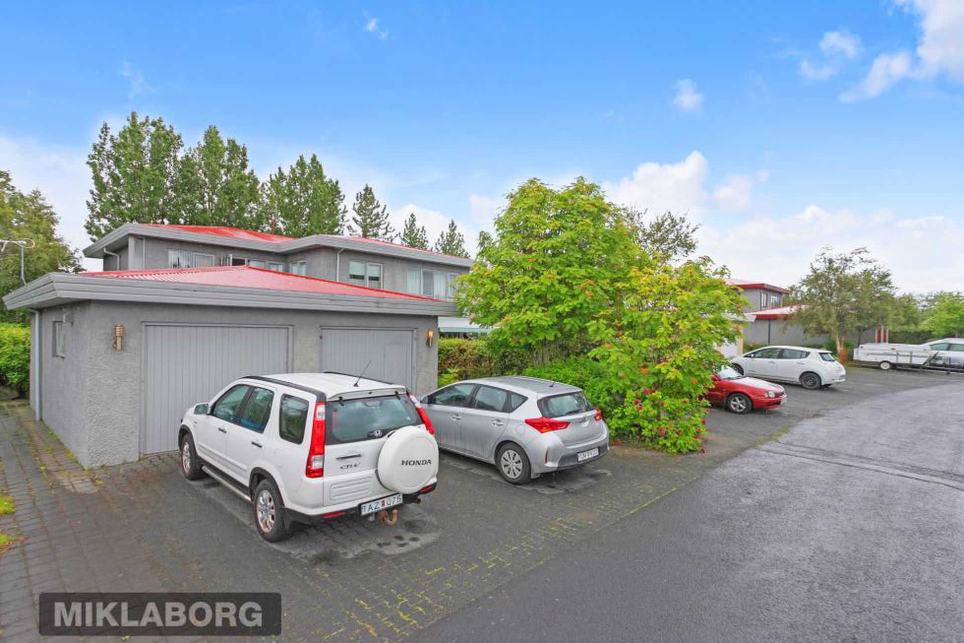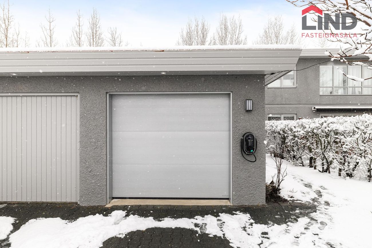 Bílskúr er 26,5 fermetrar að stærð, snyrtilegur og vel við haldinn. Inngangshurð norðan megin á bílskúr (við inngang eignar) og bílastæði fyrir framan bílskúr. Snjóbræðsla er undir bílastæði við bílskúr og stétt að inngangi. Rafhleðsla er við bílskúr.