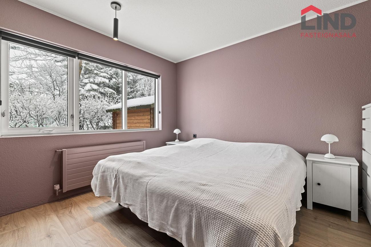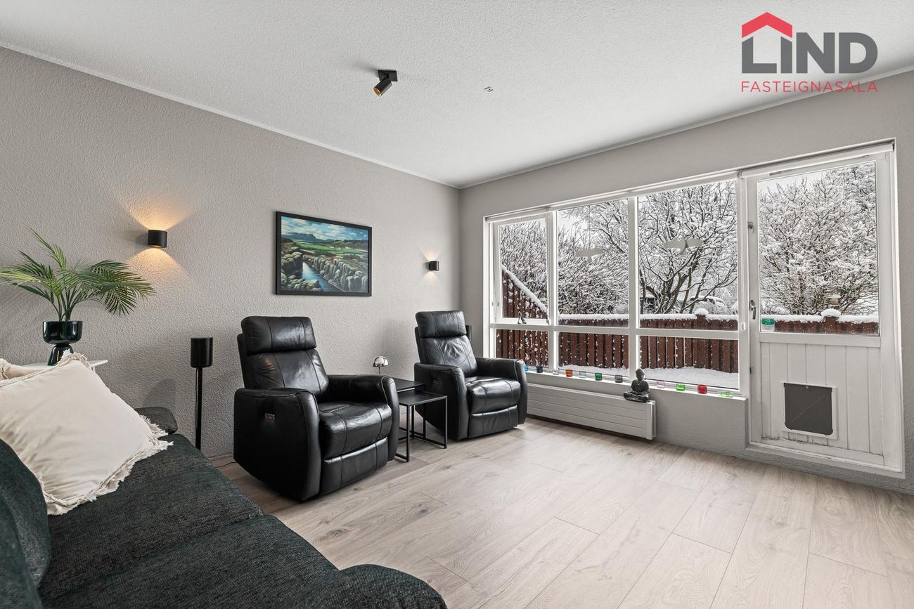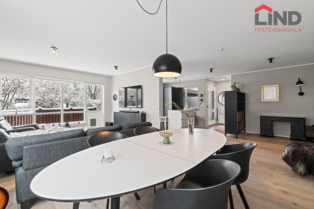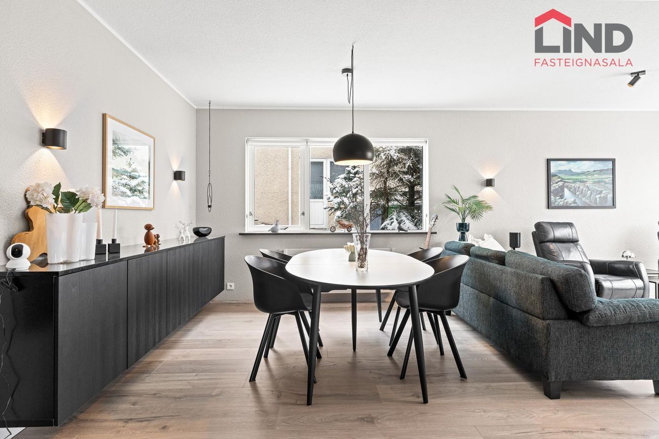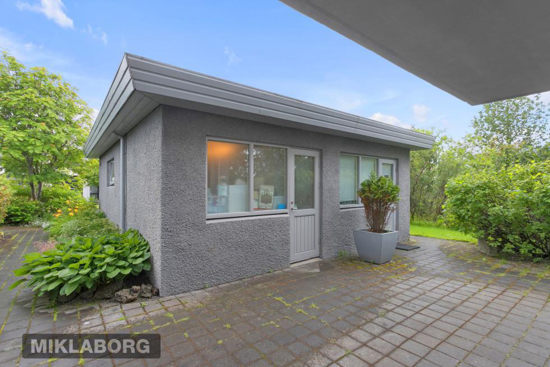 Rúmgott alrými sem skiptist í annars vegar stóra stofu sem rúmar setustofu og borðstofu og hins vegar eldhús með borðplássi. Útgengi úr stofu á rúmgóð verönd til suðurs í skjólgóðum og grónum garði í rólegum botnlanga. Eldhús er opið að hluta við stofu með plássi fyrir eldhúsborð og gluggum til suðurs og vesturs. Glæsilegt endurnýjað baðherbergi með baðkari, sturtu og saunuklefa. Í dag eru tvö svefnherbergi en voru áður þrjú þar sem baðherbergi var stækkað á kostnað eins svefnherbergis. Rúmgott þvottaherbergi með sérinngangi frá vesturshlið hússins. Möguleiki væri að útbúa útleigurými úr þvottaherbergi og einu svefnherbergi með sérinngangi.