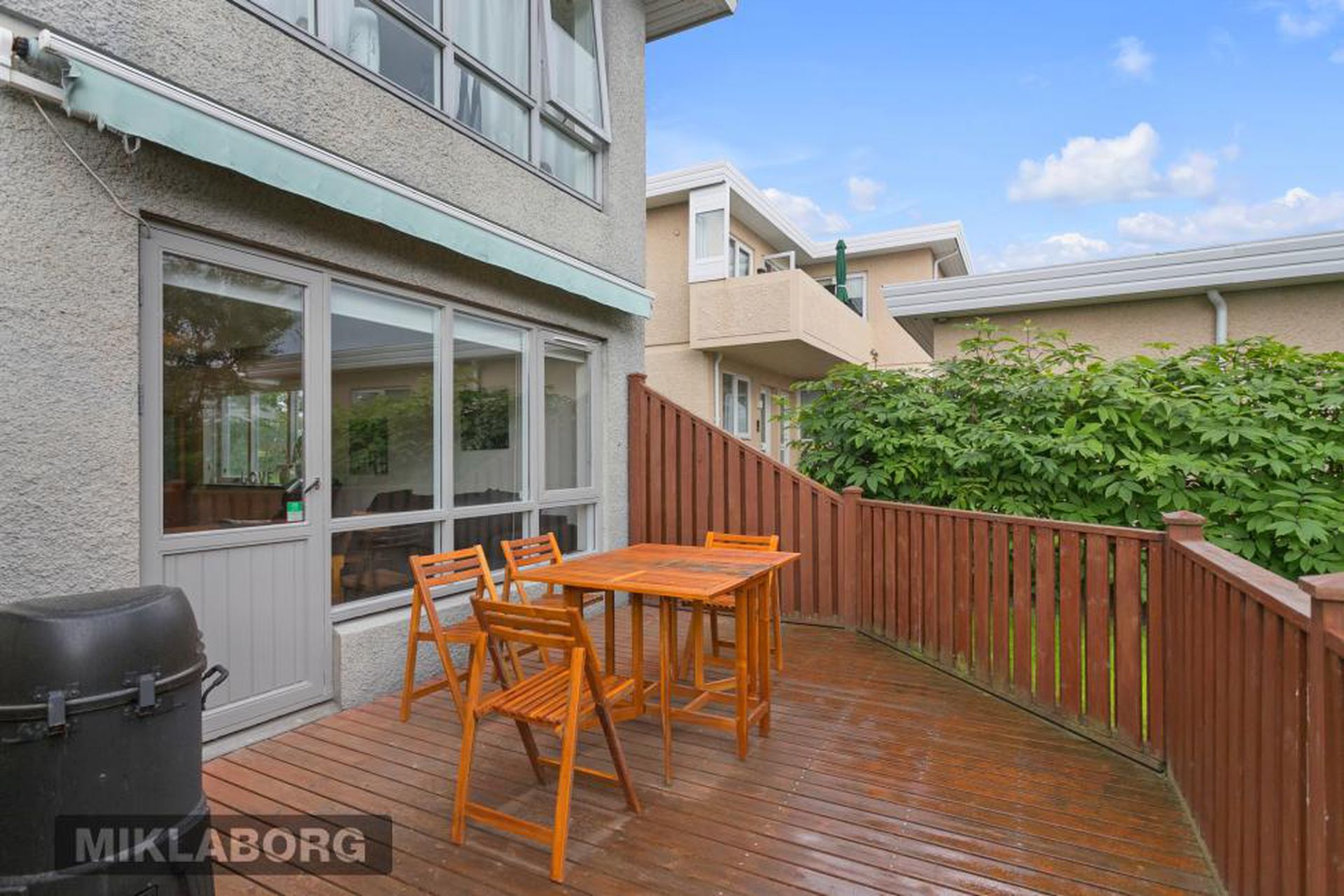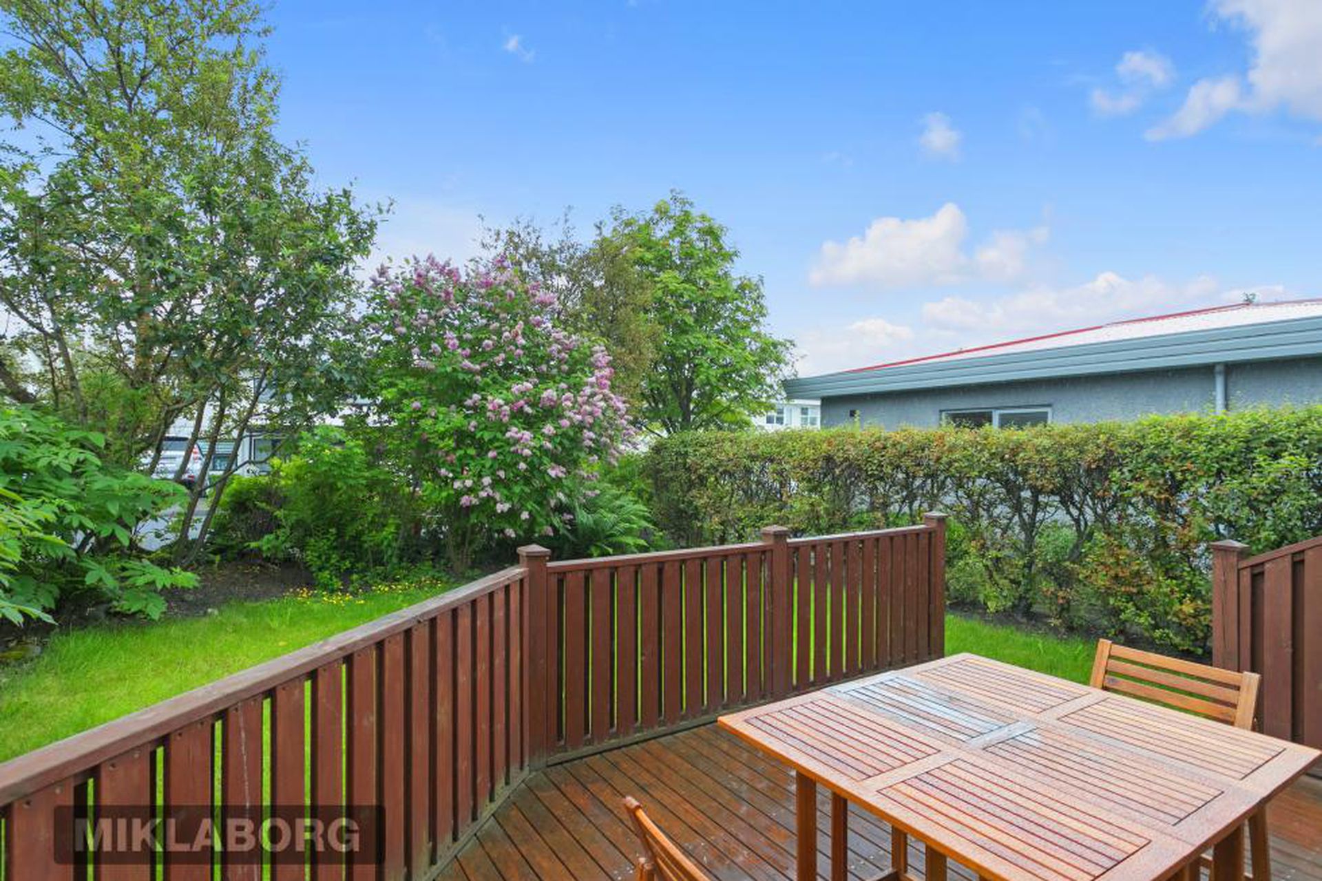 Verönd: Útgengi á rúmgóða viðarverönd til suðurs sem er afgirt að hluta. Viðverönd snýr inn í skjólgóðan og gróin garð.