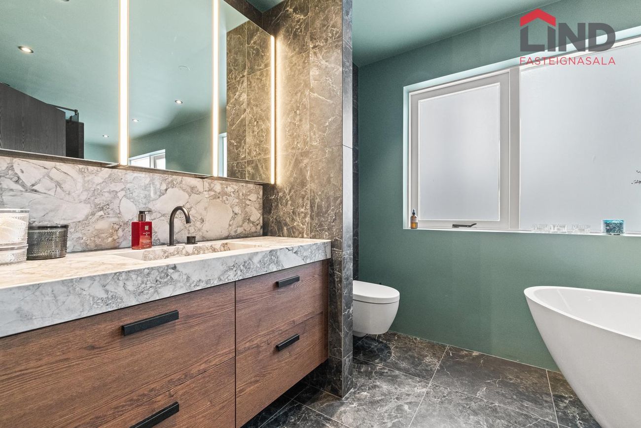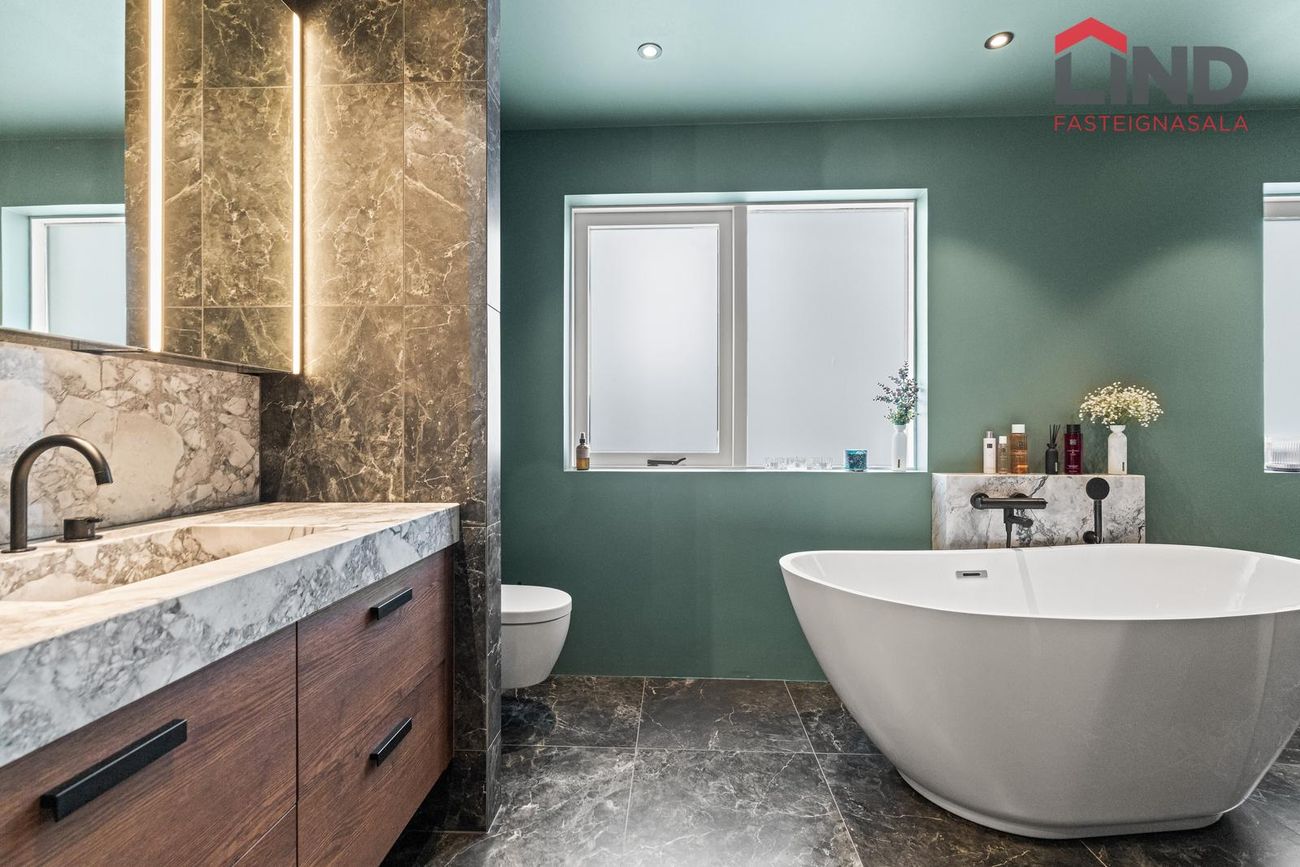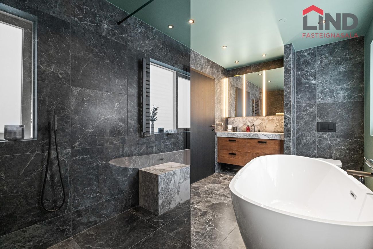 Baðherbergi: Er nýlega endurnýjað á afar glæsilegan máta. Flísar og gólfi og veggjum. Vönduð blöndunartæki frá Tengi. Frístandandi baðkar með innbyggðum blöndunartækjum og flísalögð sturta með innbyggðum blöndunartækum. Falleg baðinnrétting með stein vaski og speglaskáp fyrir ofan með lýsingu. Innfelld lýsing í loftum með dimmer, handklæðaofn og infrared saunaklefi. Gluggar til norðurs.
