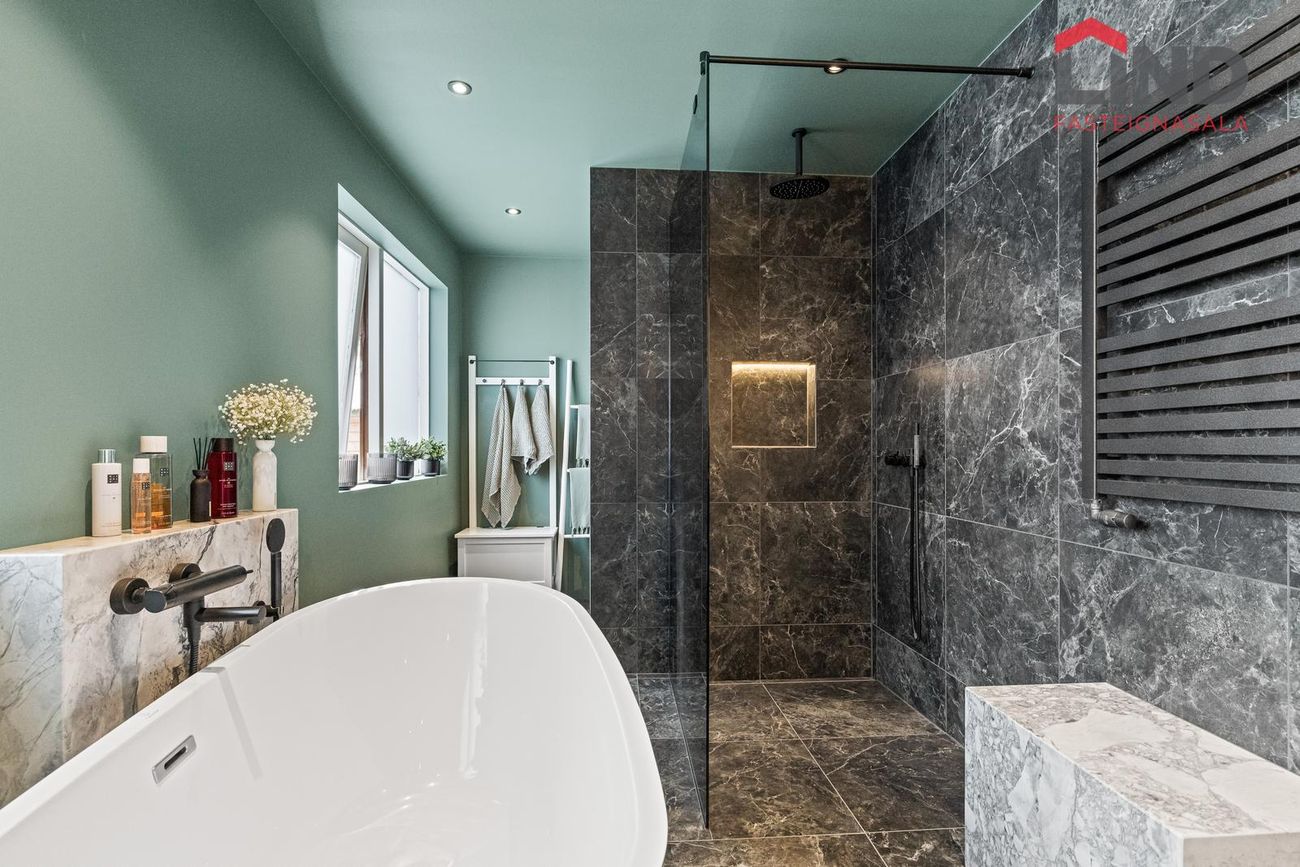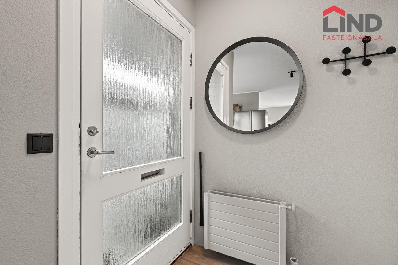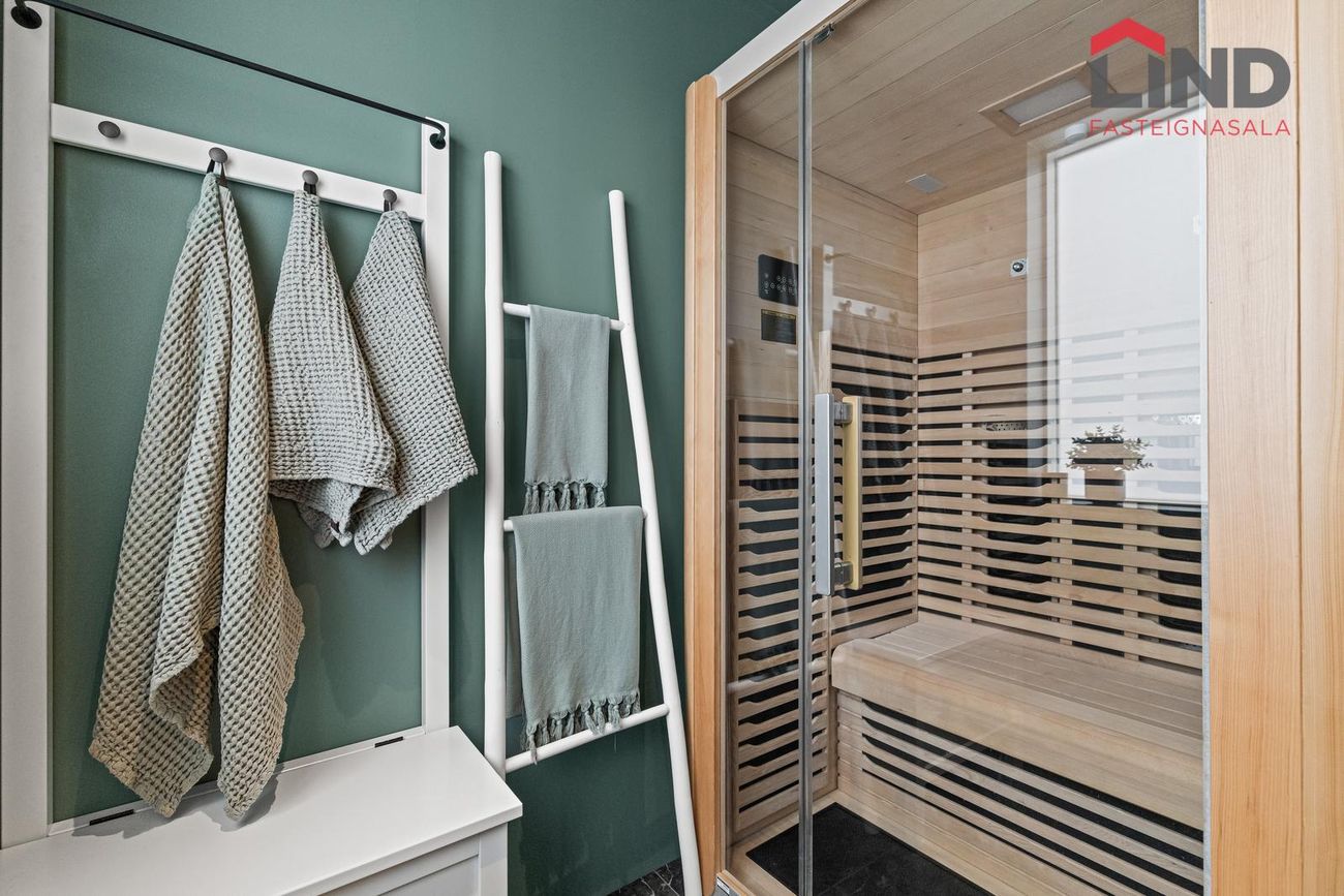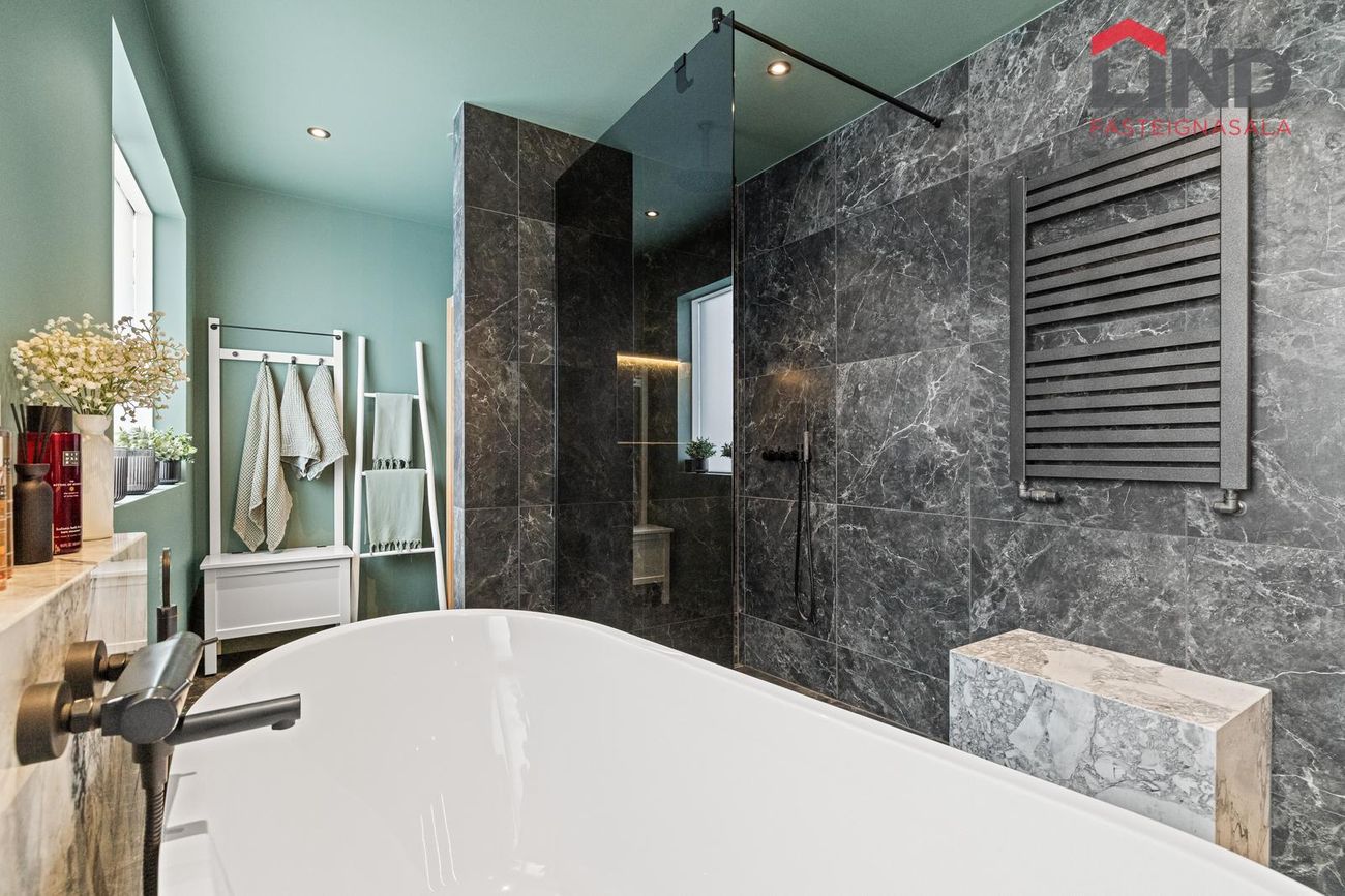 Baðherbergi: Er nýlega endurnýjað á afar glæsilegan máta. Flísar og gólfi og veggjum. Vönduð blöndunartæki frá Tengi. Frístandandi baðkar með innbyggðum blöndunartækjum og flísalögð sturta með innbyggðum blöndunartækum. Falleg baðinnrétting með stein vaski og speglaskáp fyrir ofan með lýsingu. Innfelld lýsing í loftum með dimmer, handklæðaofn og infrared saunaklefi. Gluggar til norðurs.