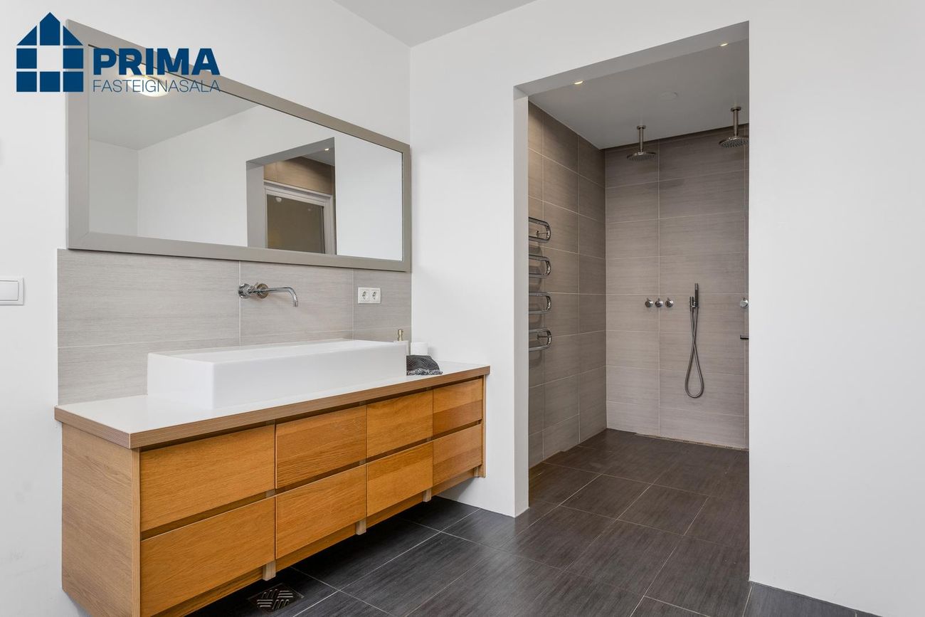 Aðalbaðherbergi með baðkari, tvöfaldri sturtu og gufubaði. Vola blöndunartæki og flísalagt.