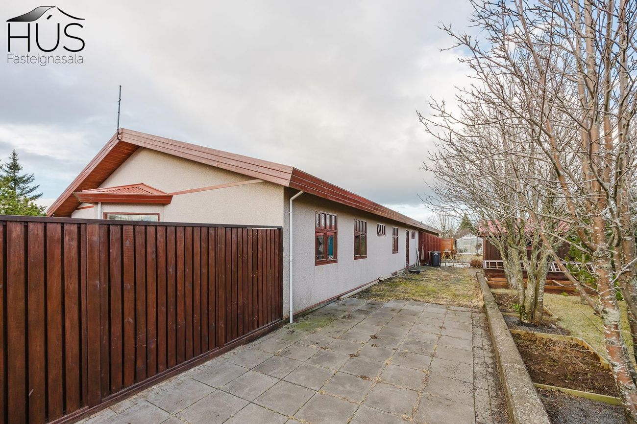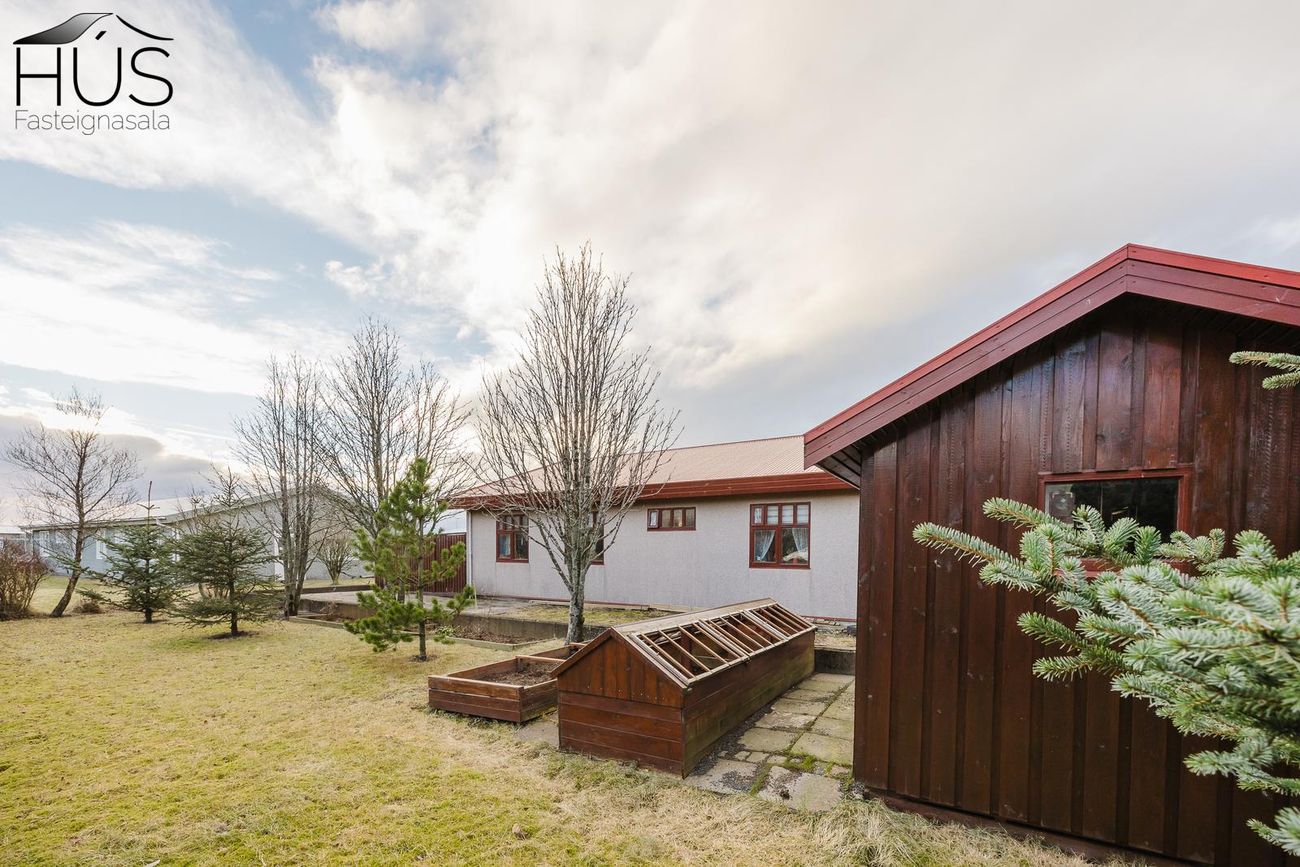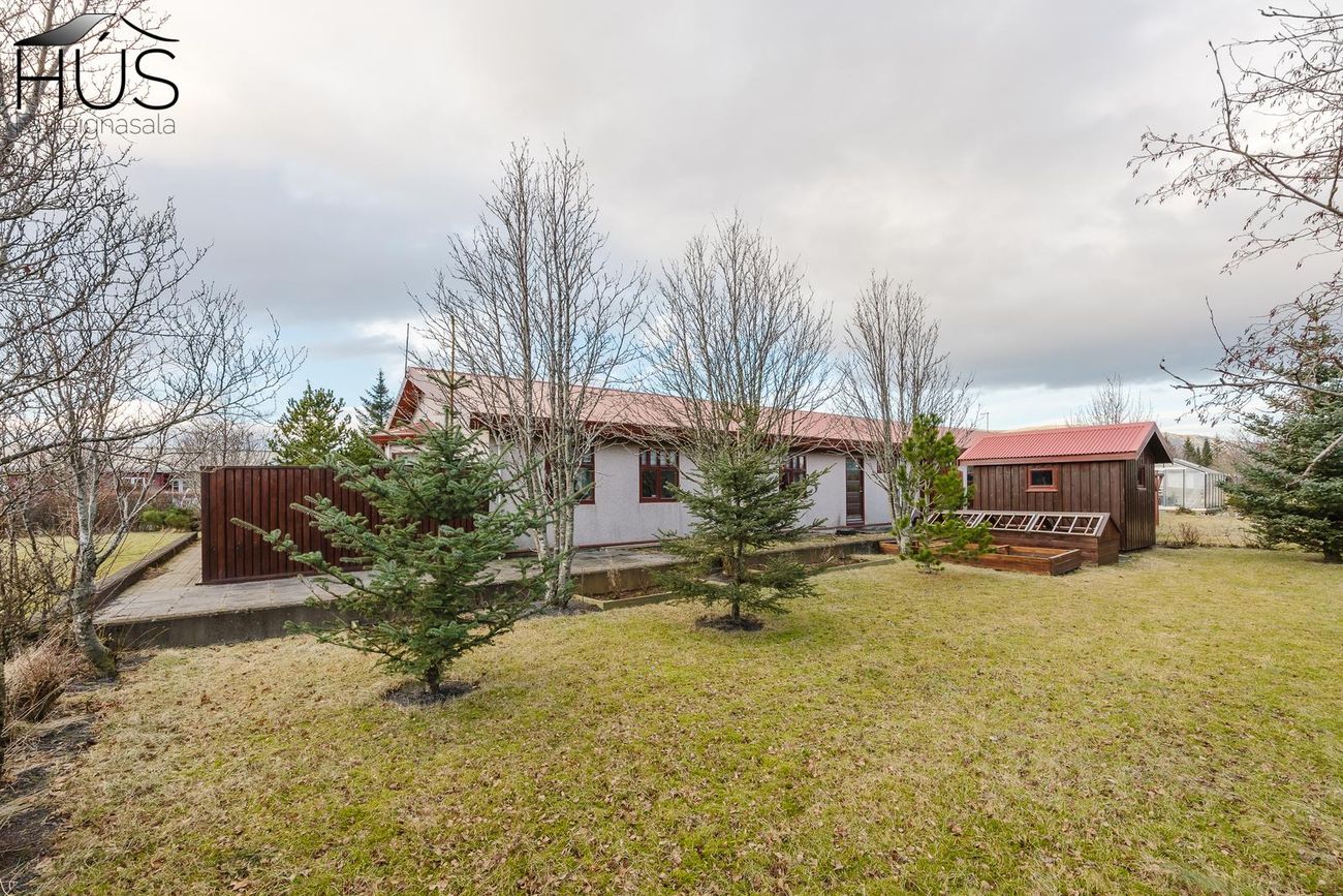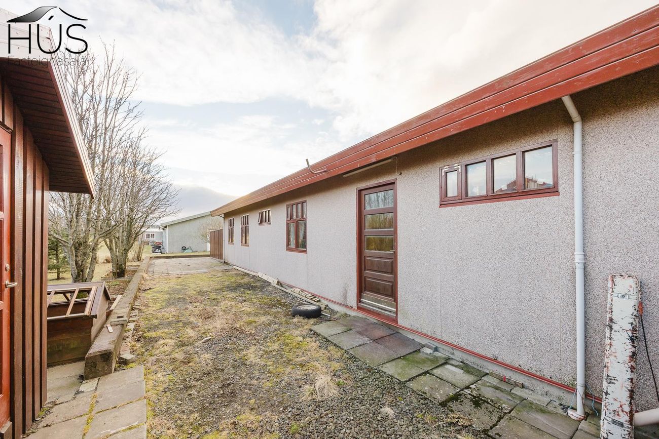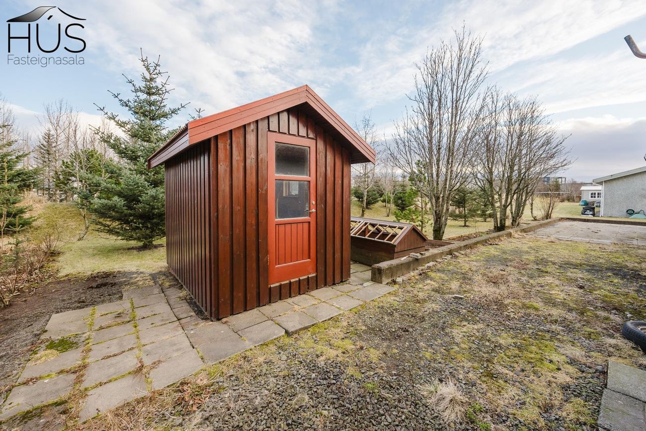 geymsla innst. Gönguhurðir að framan og aftan. Í bakgarði er