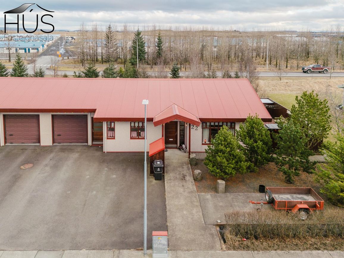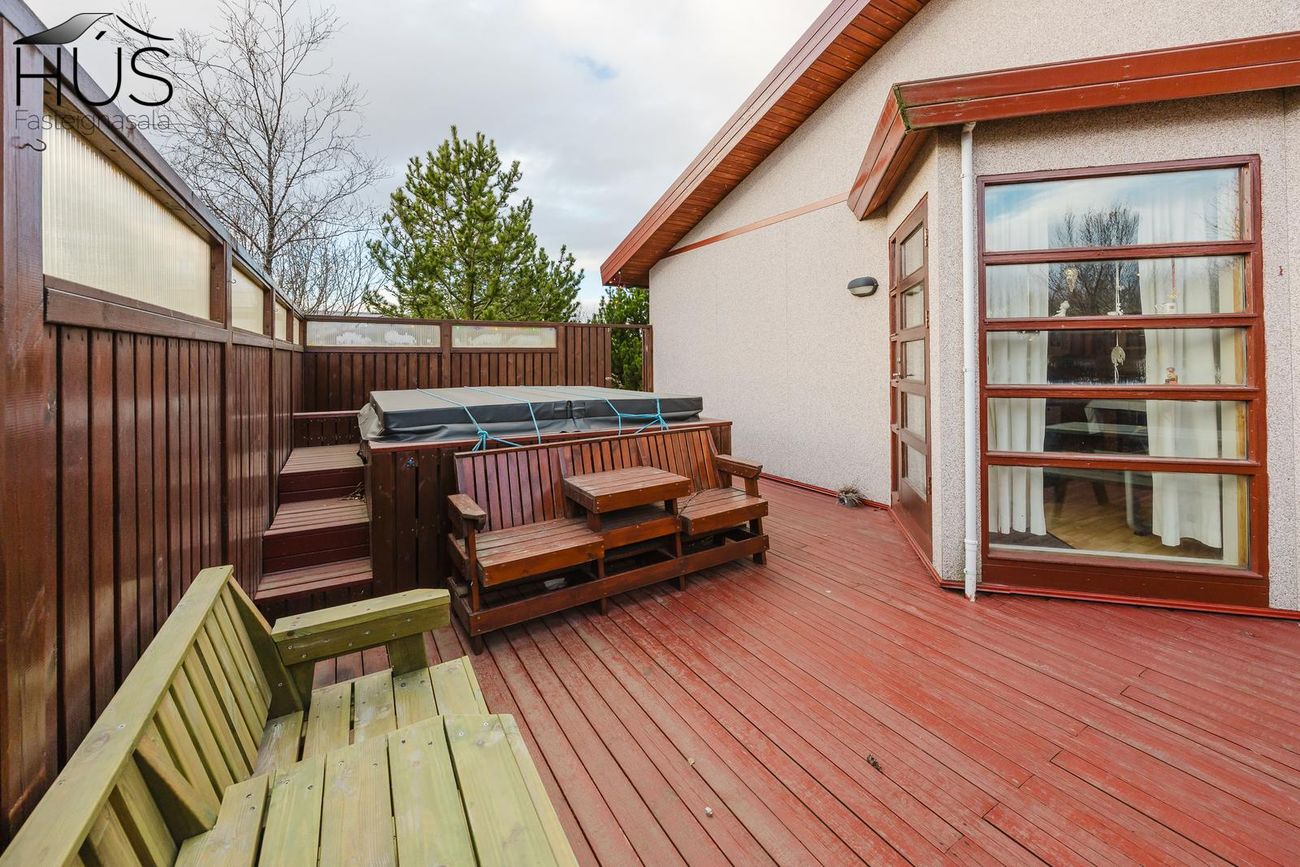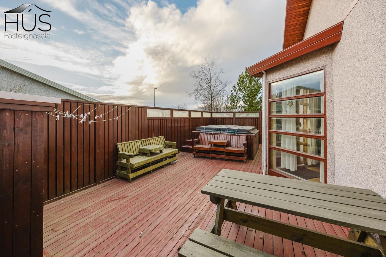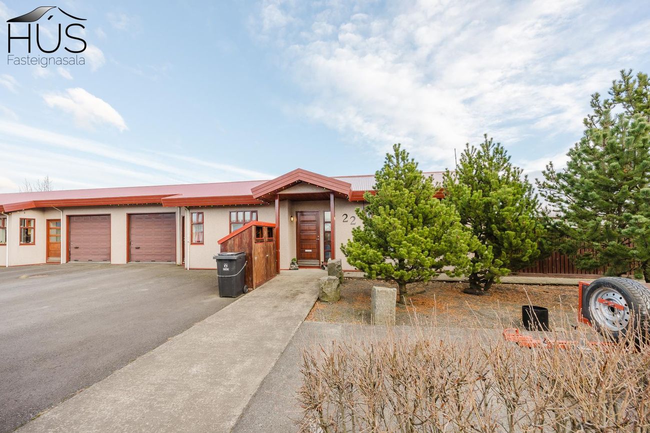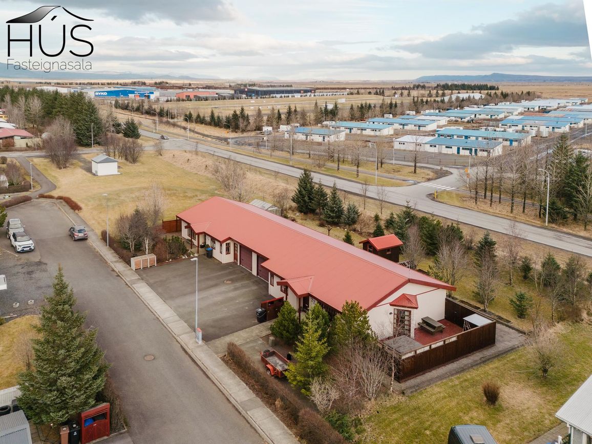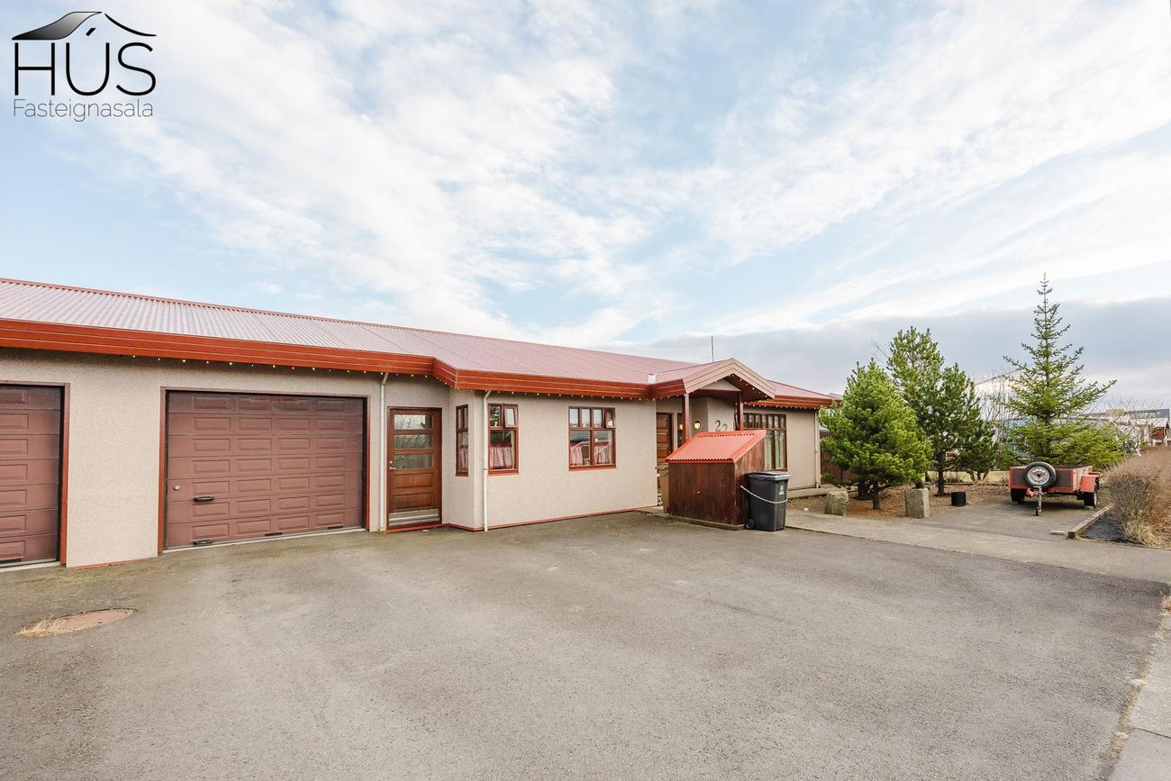 geymsla innst. Gönguhurðir að framan og aftan. Í bakgarði er