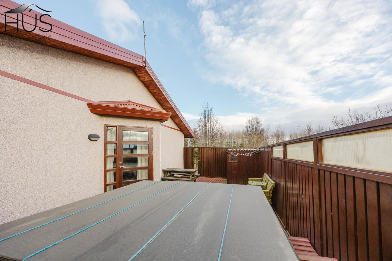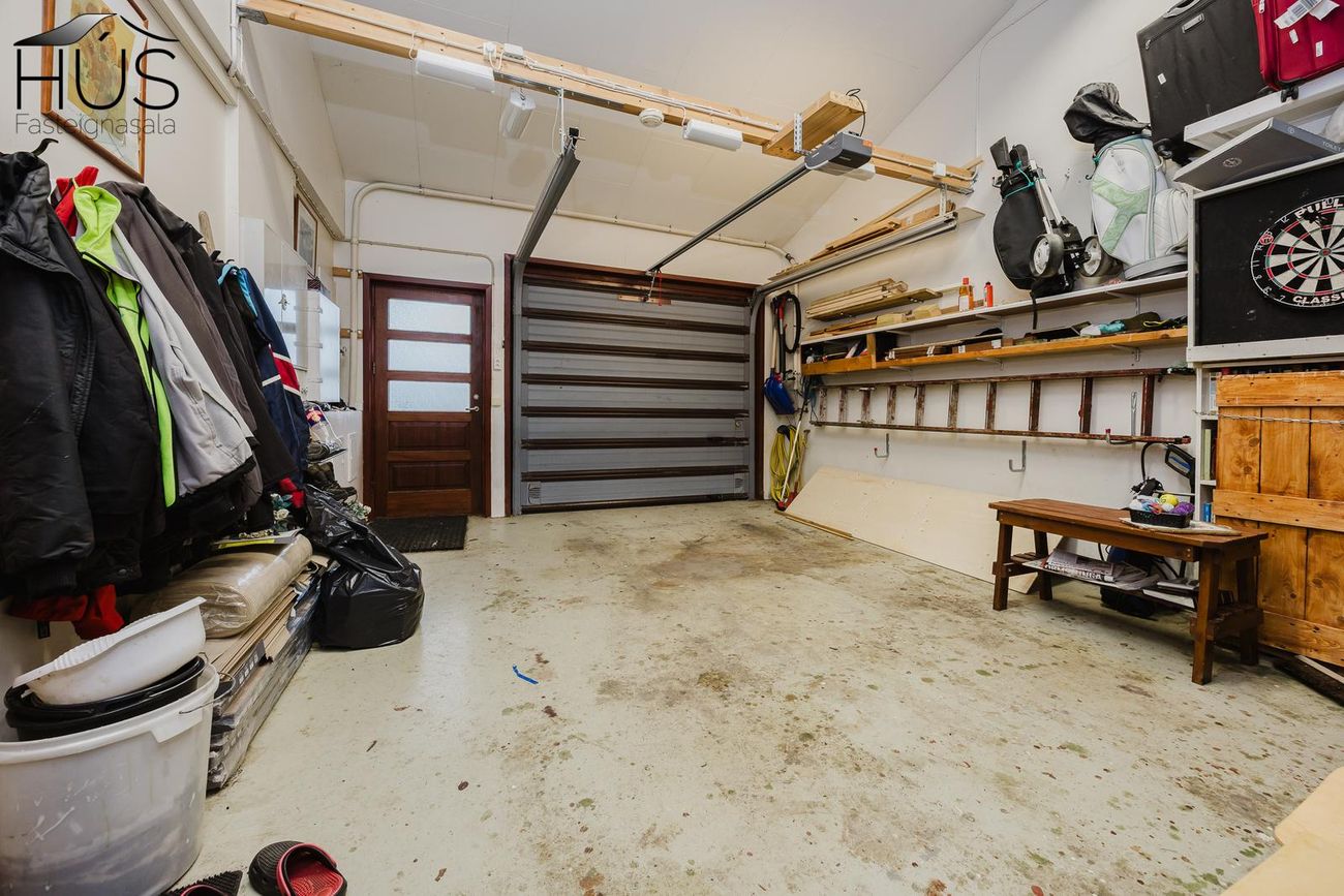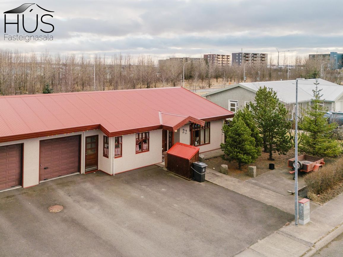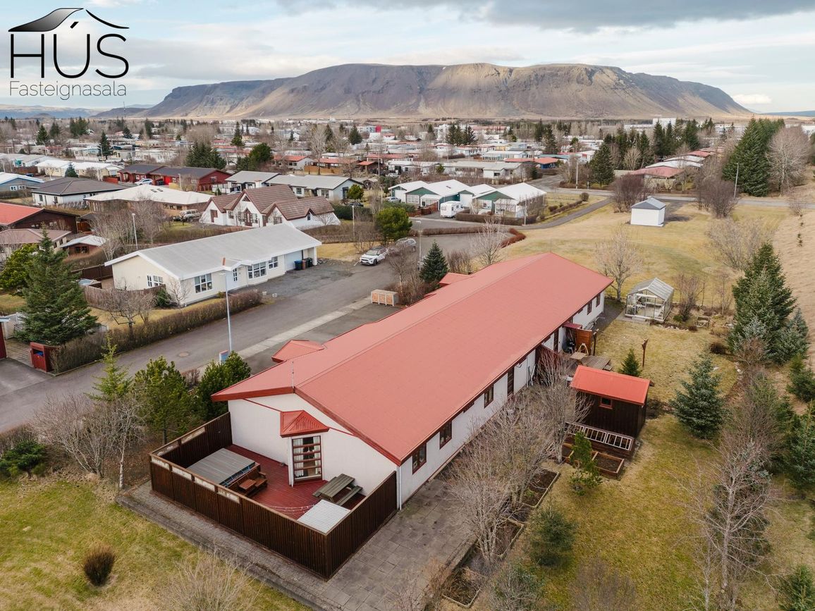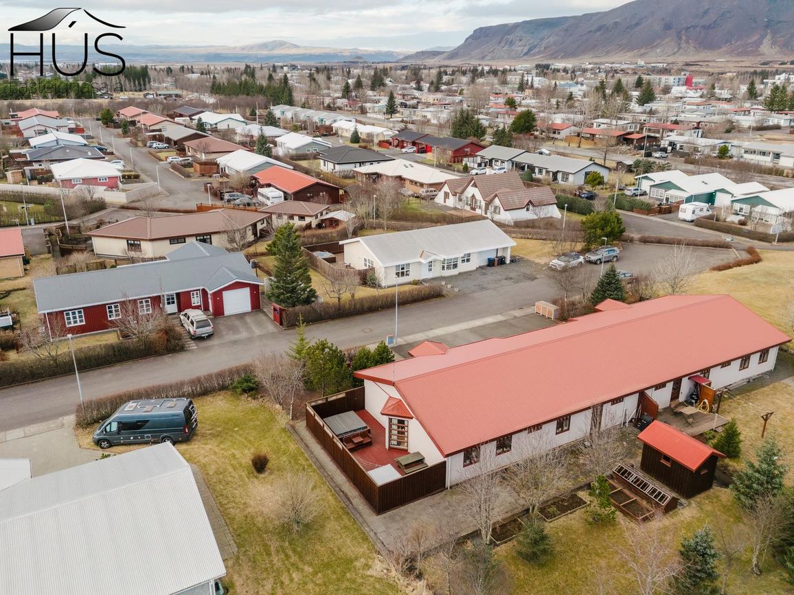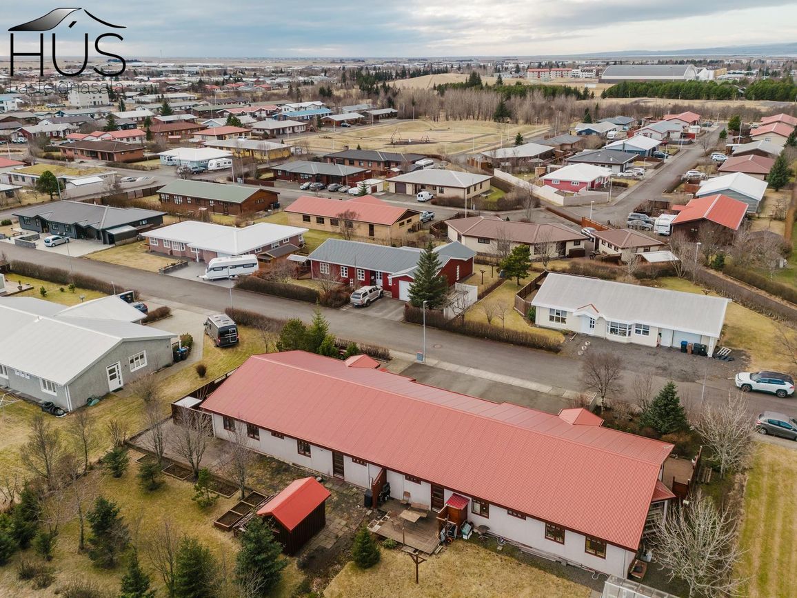 geymsla innst. Gönguhurðir að framan og aftan. Í bakgarði er