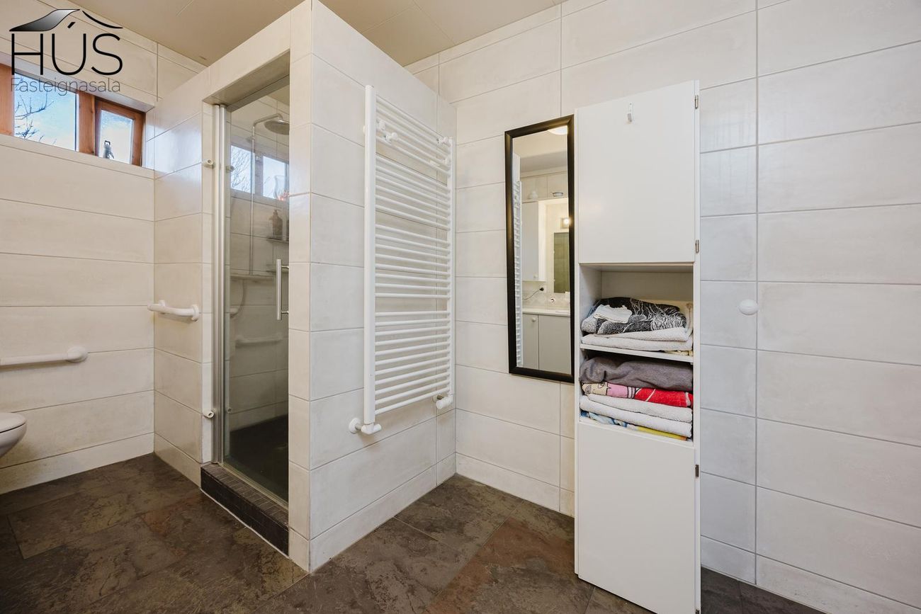 baðherbergið sem er flísalagt, með innréttingu og stórri sturtu.