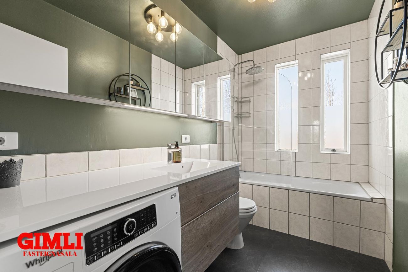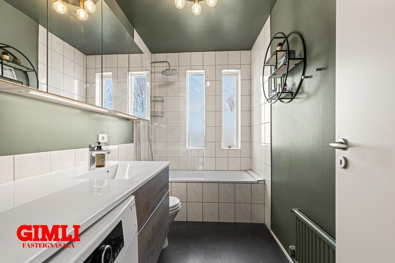 Baðherbergi: Baðkar með sturtuaðstöðu, salerni og handklæðaofni. nýleg innrétting innrétting og góðir speglaskápar. Tengi er fyrir þvottavél á baði. Vínilflísar á gólfi.