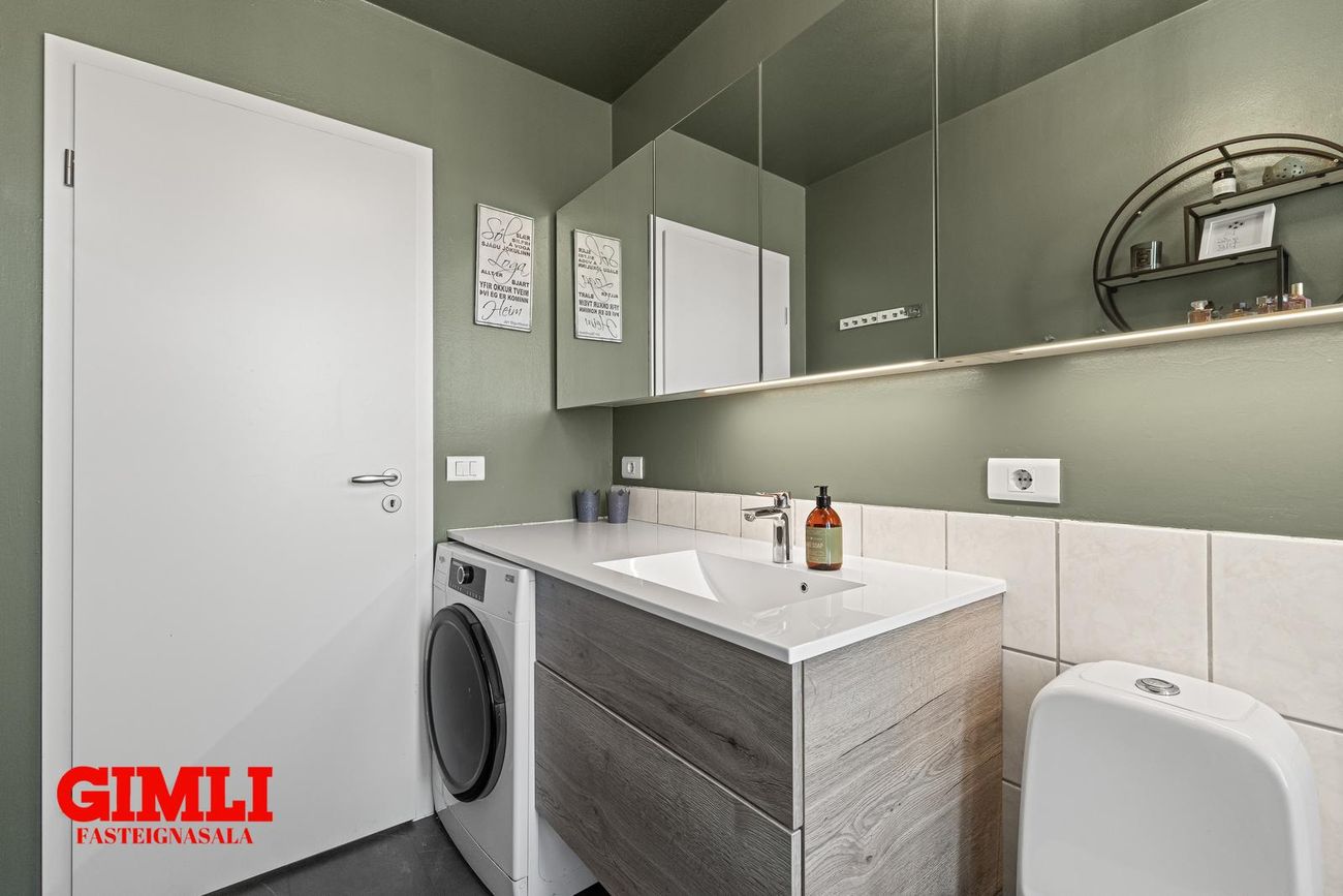 Sameign: Á jarðhæð er sameiginleg hjóla og vagnageymsla ásamt sameiginlegu þvottahúsi.