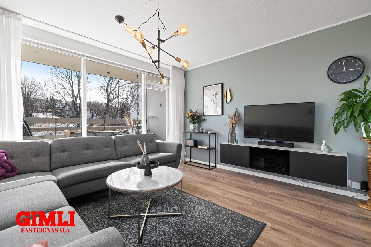 Stofa: Björt og rúmgóð, útgengt á sóríkar svalir, harðparket á gólfi.