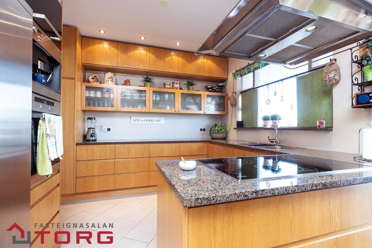 Þvottahús með góðum skápum, tengi fyrir þvottavélar, þvottasnúrur og flísalagt gólf. Gengið beint inn í bílskúr.
