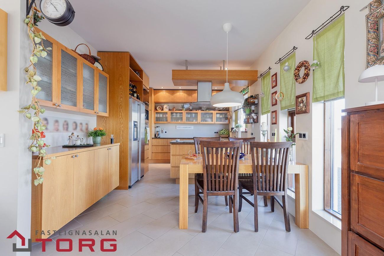 Stór bílskúr með epoxygólfi, rafdrifnum hurðum, hitagrind fyrir heitan pott og innkeyrslu, hillum og skápum. Útganga út á verönd.