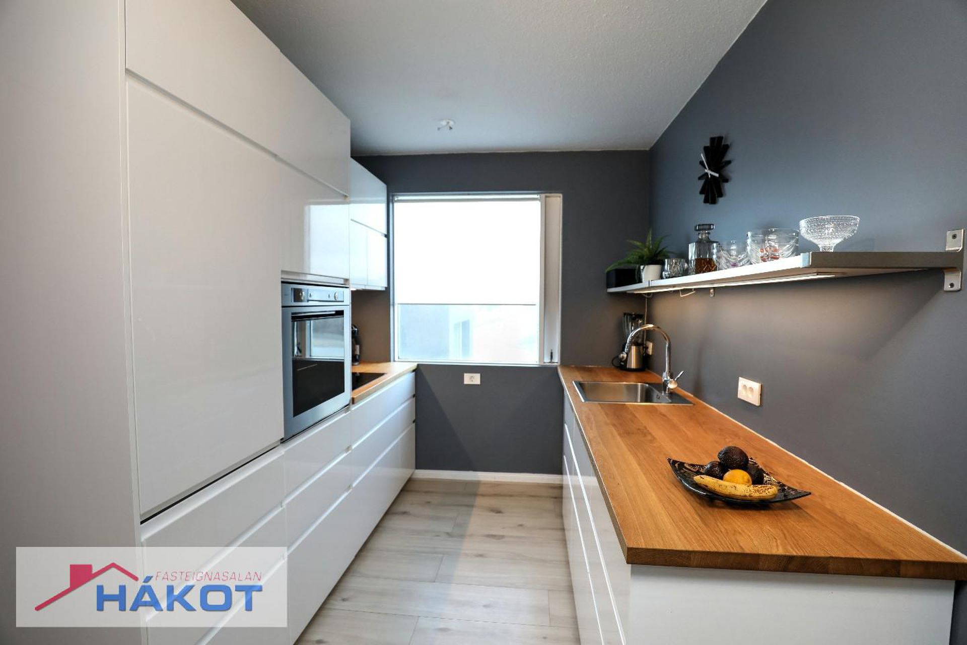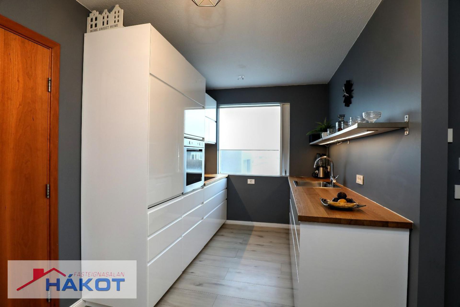 Eldhús parket, hvít innrétting, innbyggður ísskápur, helluborð, ofn, uppþvottavél.
