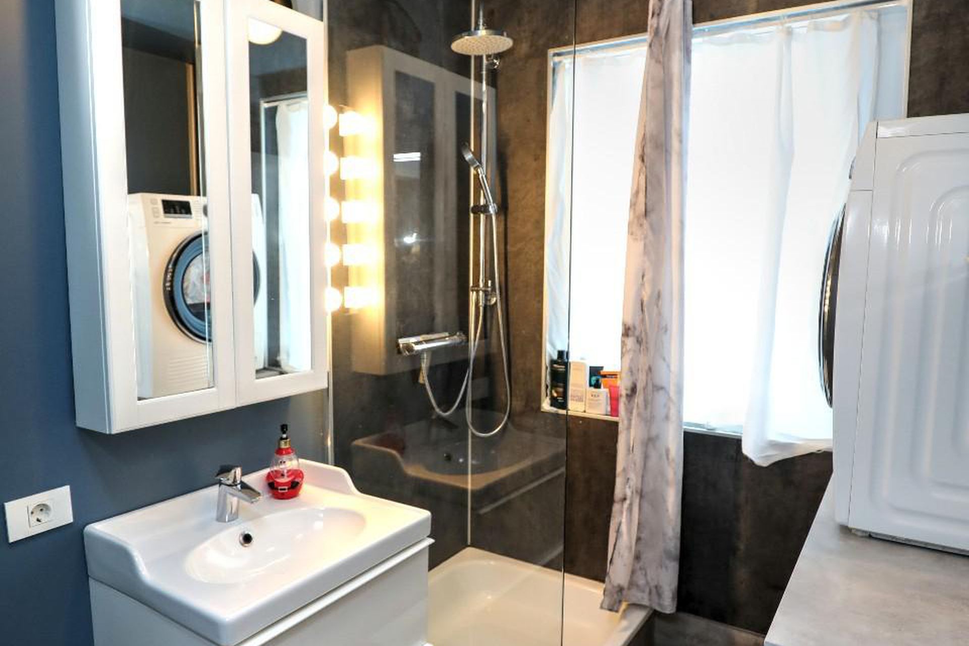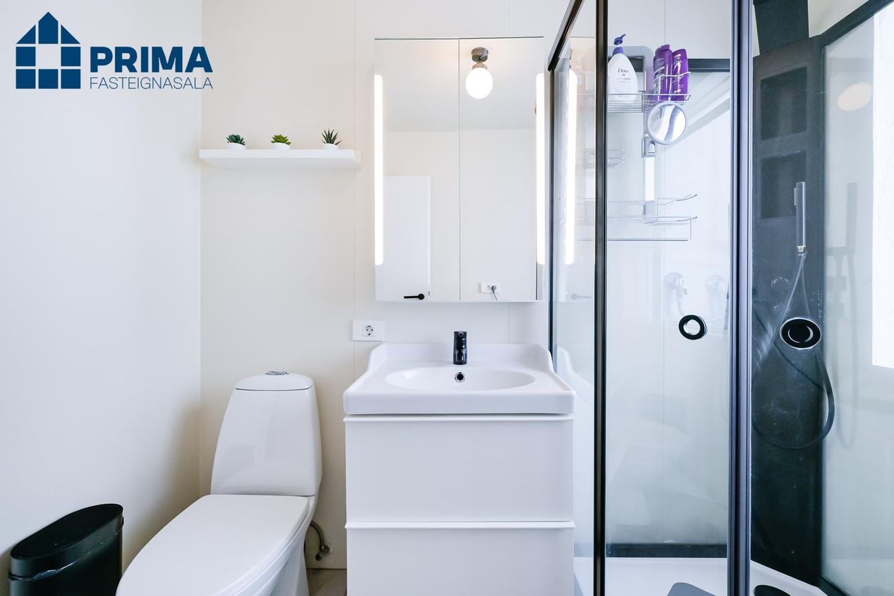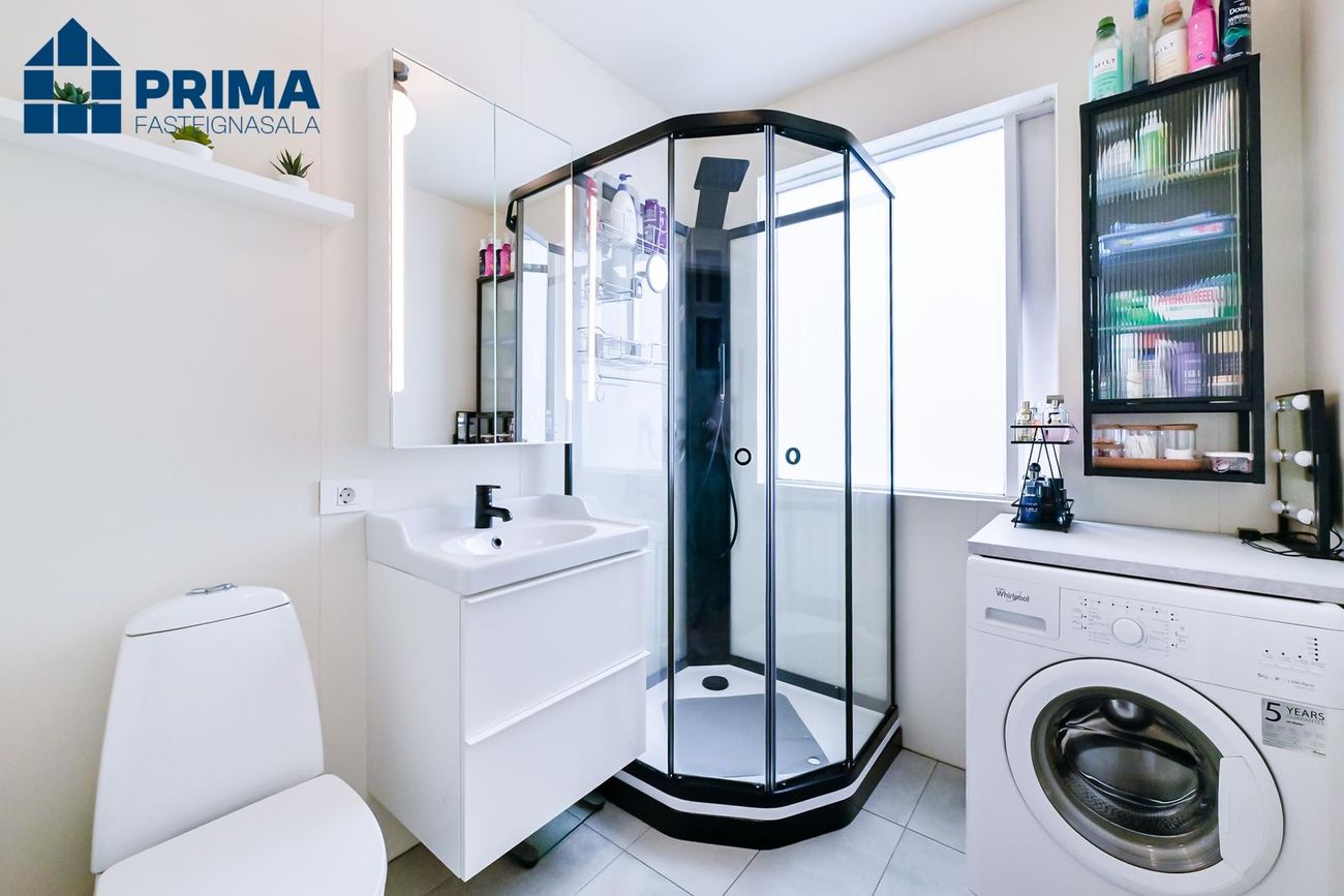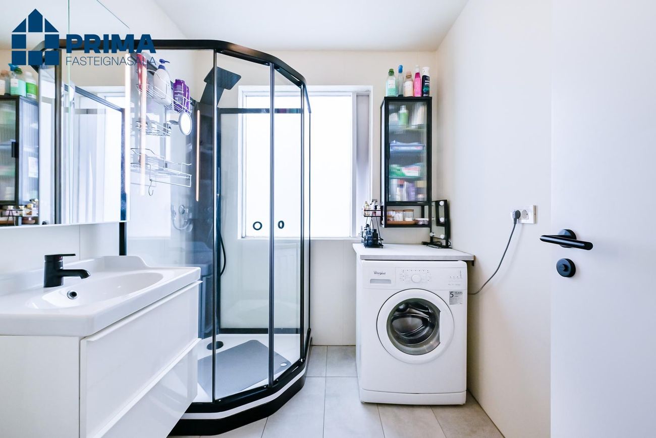 Baðherbergi Nýlega endurnýjað, hvít innrétting, flísar á gólfi, sturtuklefi, tengi f/ þvottavél og þurrkara.