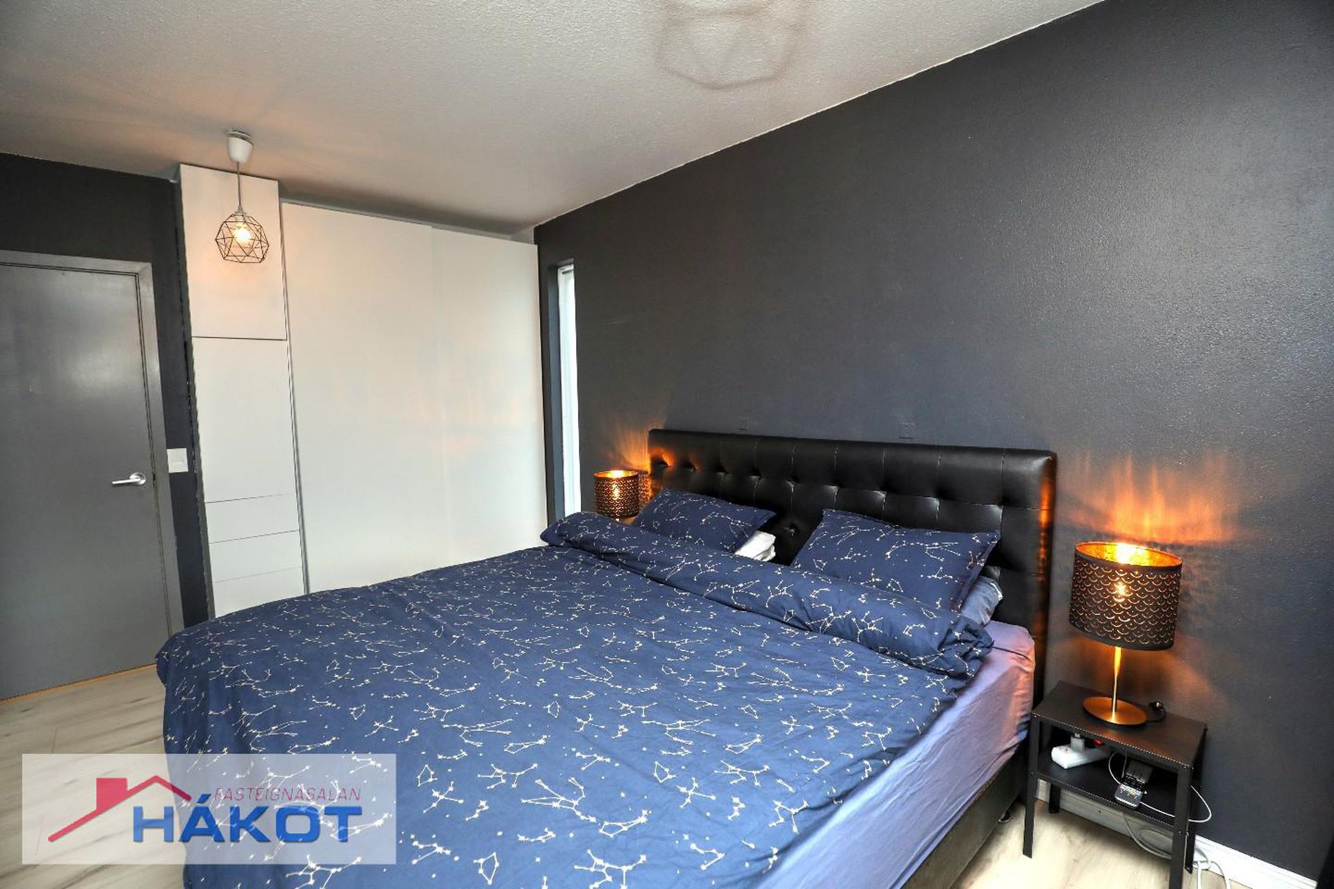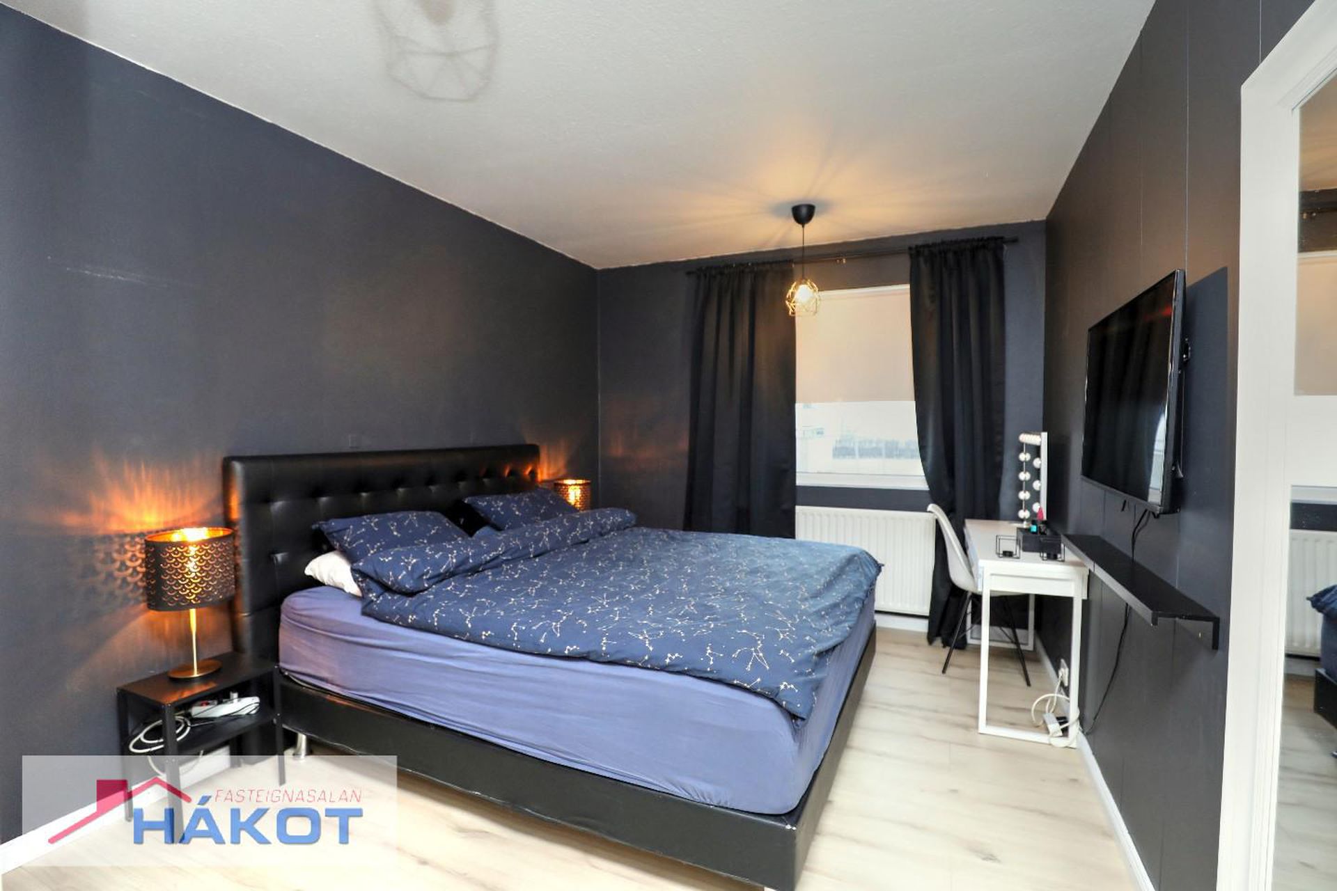 Svefnherbergi rúmgott, parket á gólfi, fataskápar.