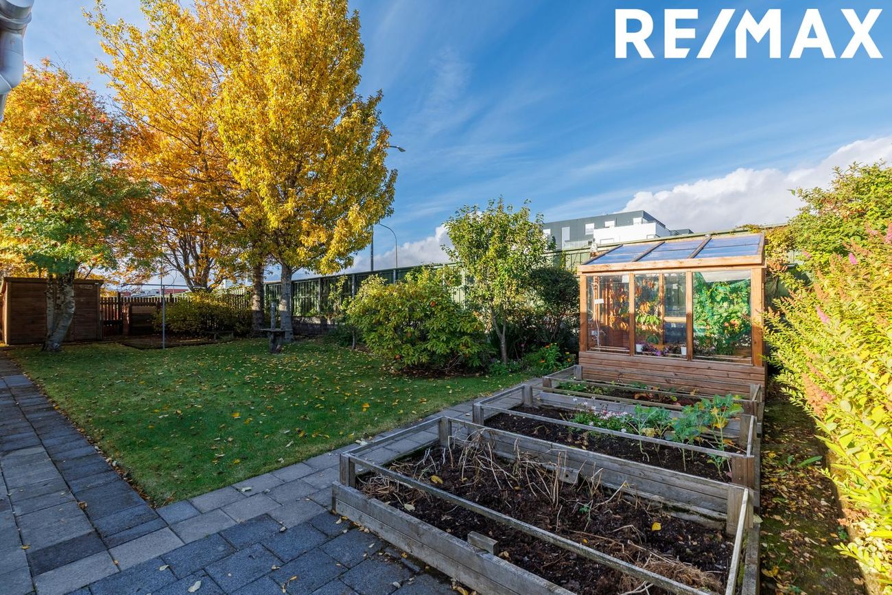 Glæsilegur garður bæði að framan og aftan á fullfrágenginni 805,0 fm lóð. Með timburpalla og tveimur garðskálum.