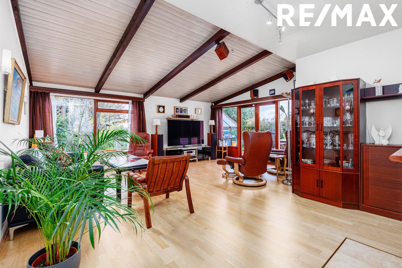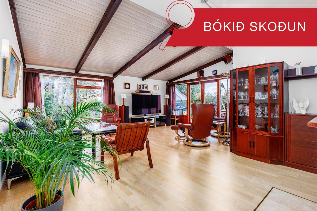 Stofan er í opnu, björtu rými með einstaklega góðri lofthæð. Með parketgólfi og arni. Útgengi út á 24 fm timburverönd.