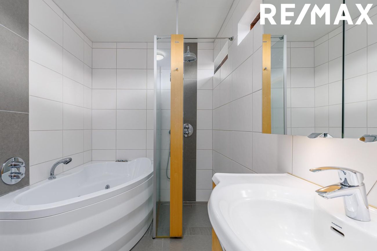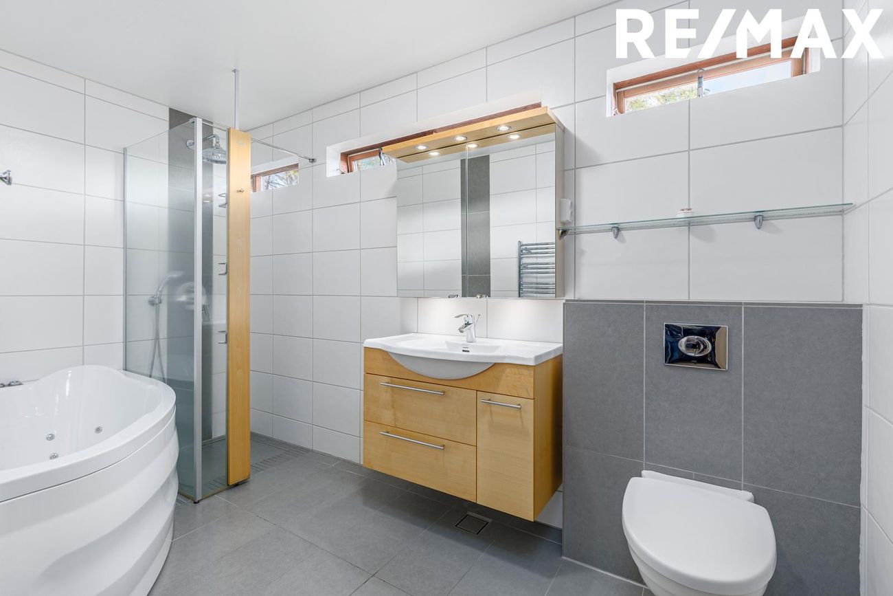 Flísalagt í hólf og gólf. Með walk-in sturtu, hornbaðkari, upphengdu salerni og speglaskáp.