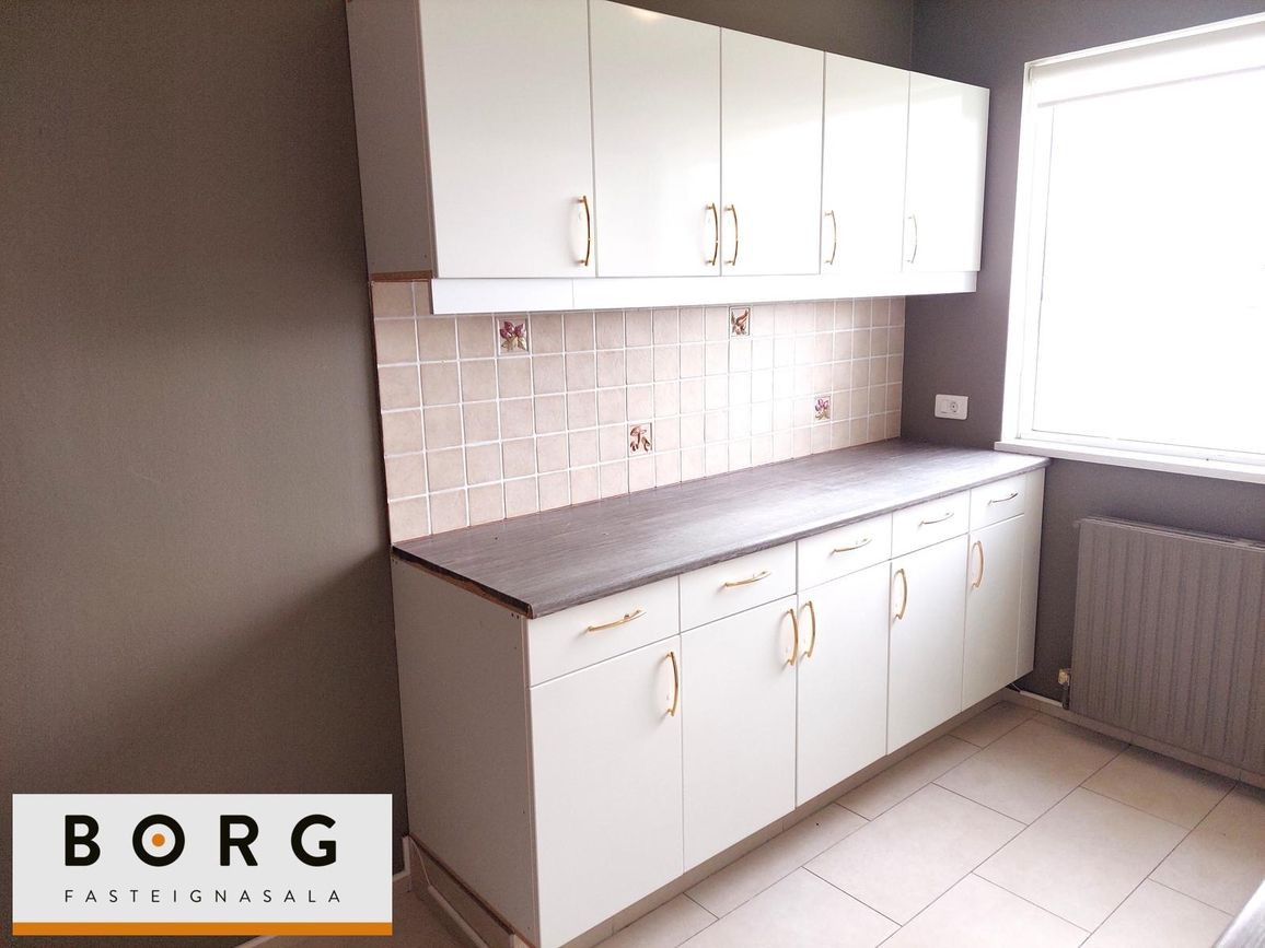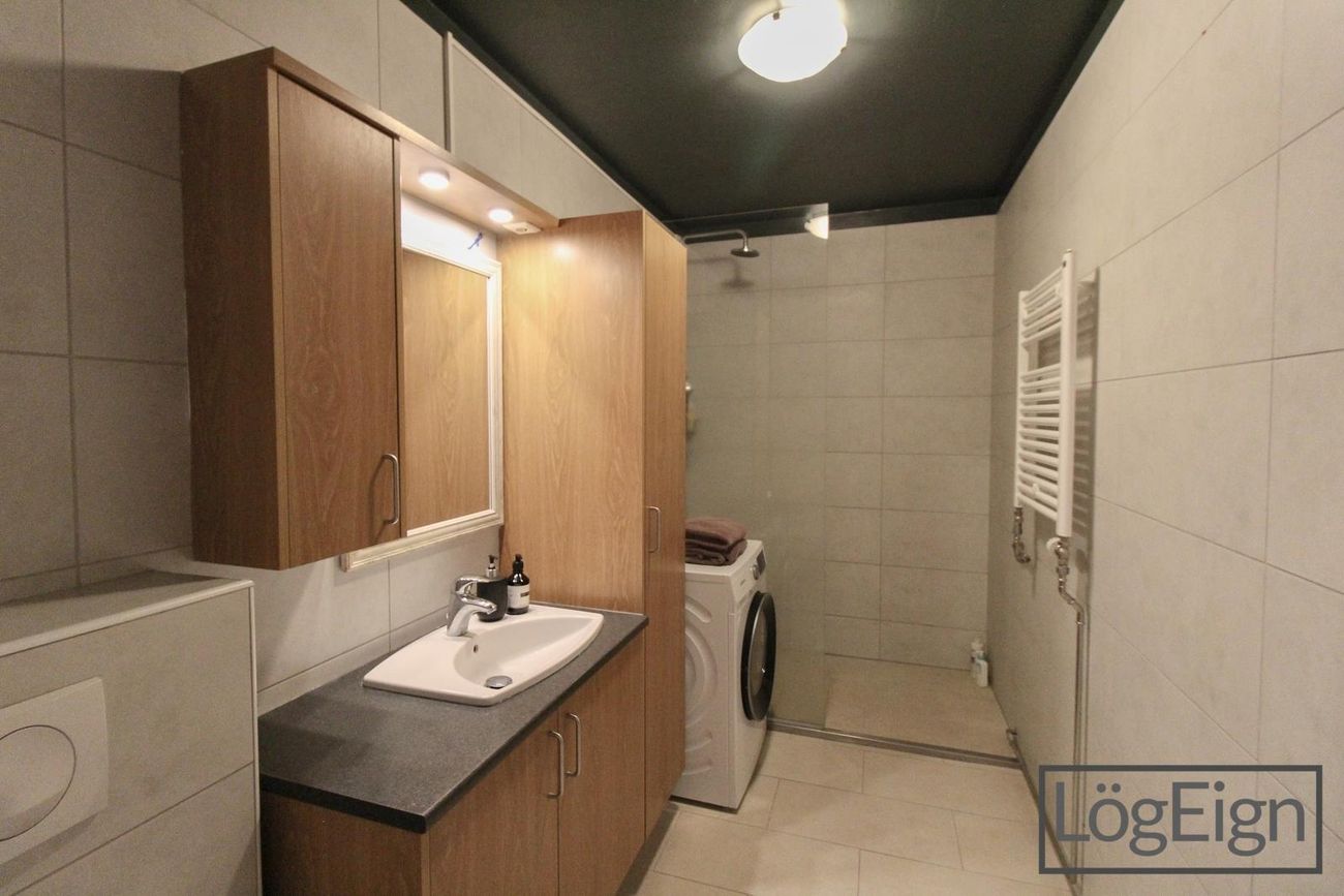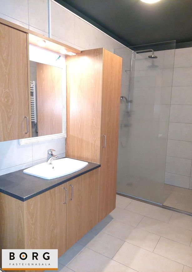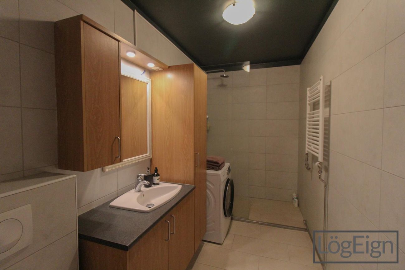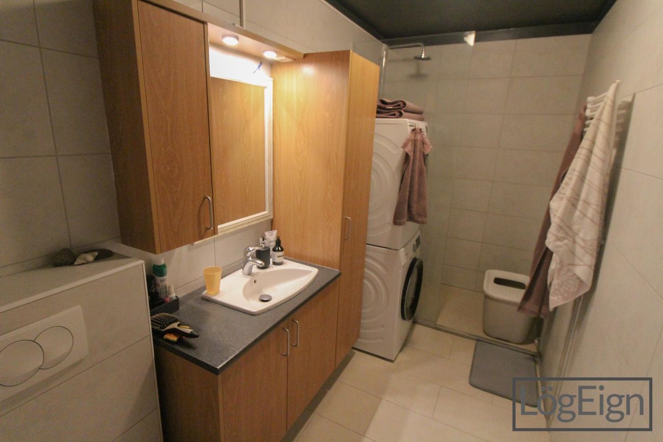 Baðherbergi: hefur verið endurnýjað og er með flísum á gólfi og veggjum, upphengdu klósetti og ágætis innréttingu með efri- og neðri skápum ásamt sturtu og handklæðaofn. Tengi fyrir þvottavél og þurrkara er inn á baðherberginu.