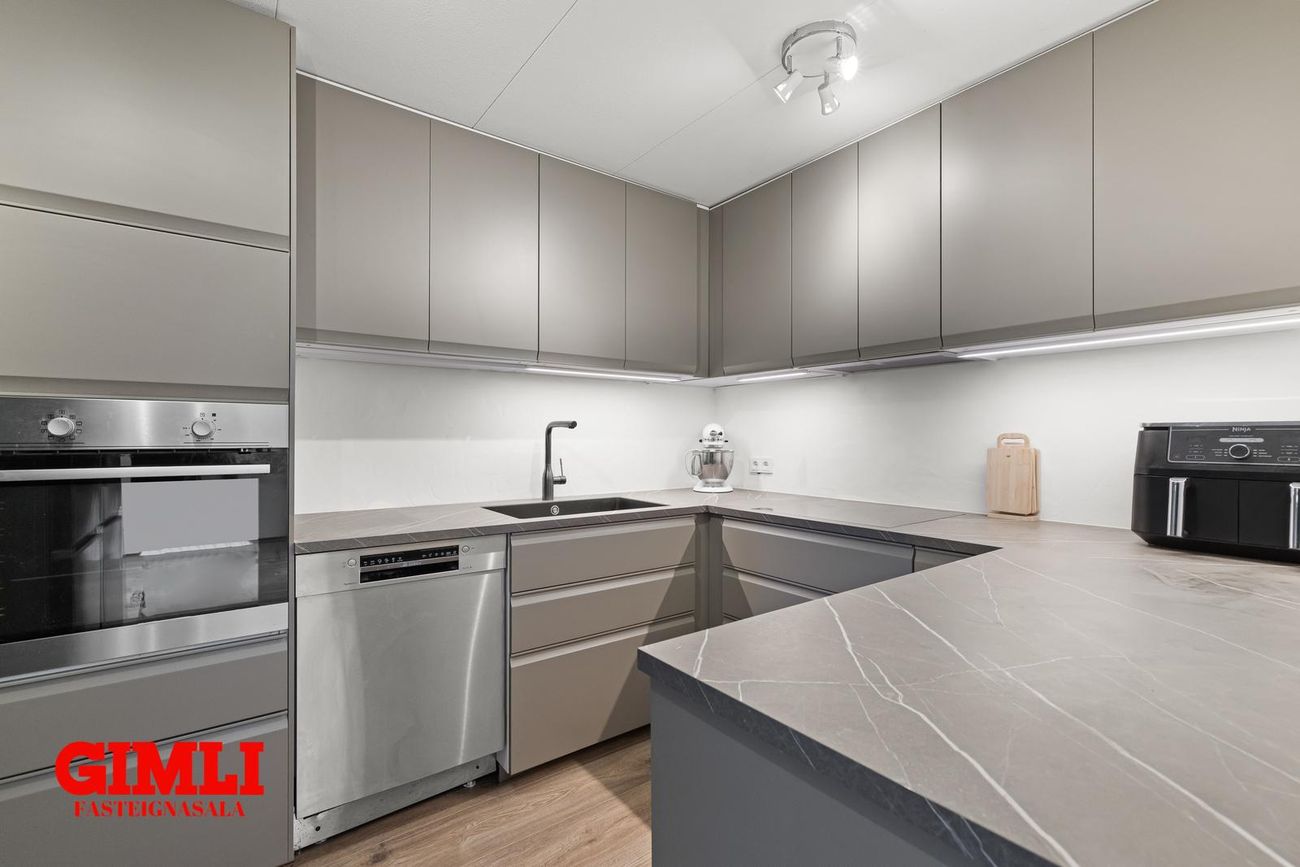 Eldhús: Falleg eldhúsinnrétting með góðu skápaplássi, gólfhita, ofn í vinnuhæð, innfeldum span helluborði og tengi fyrir uppþvottavél.