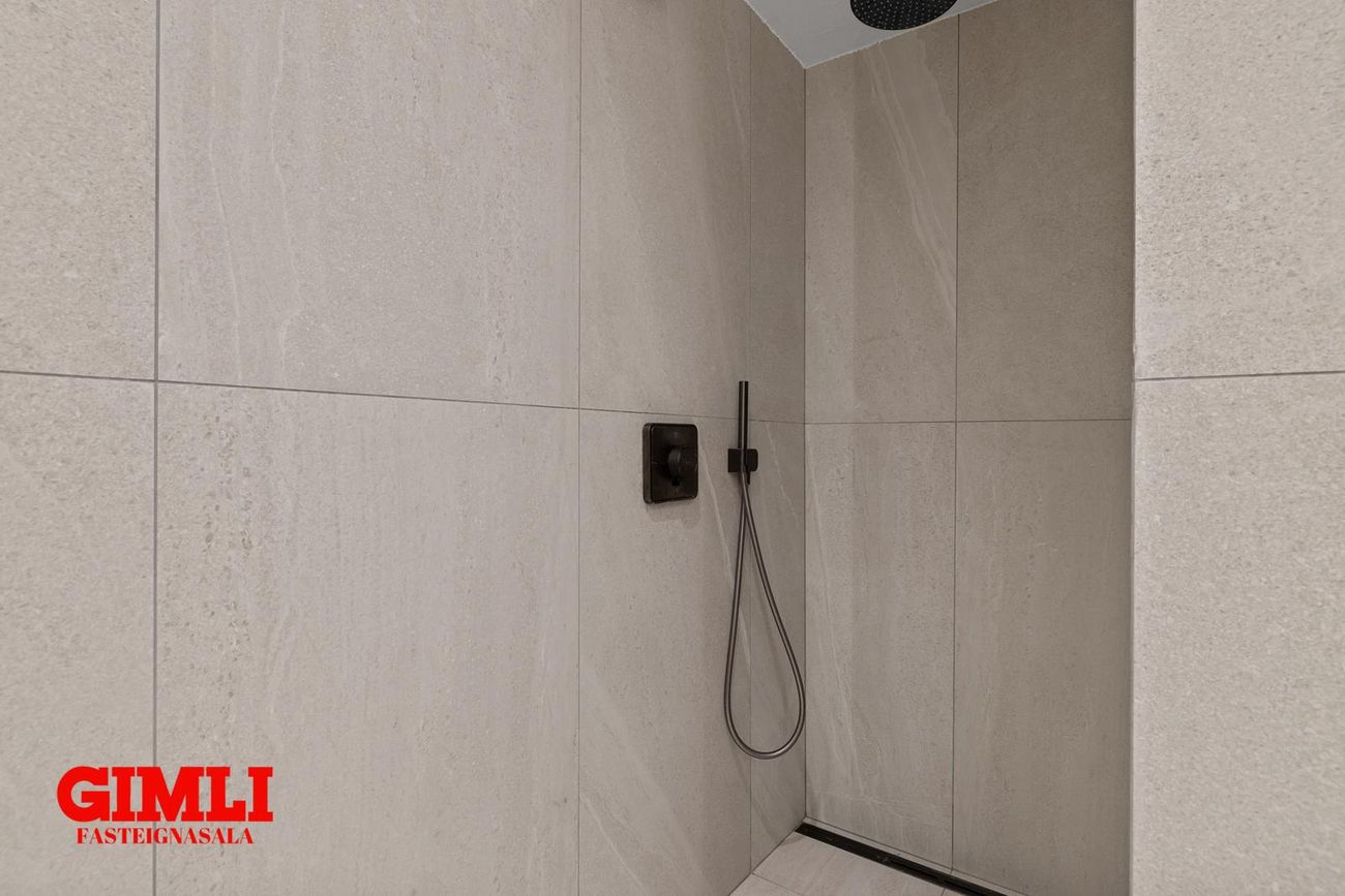 Baðherbergi: Flísalagt í hólf og gólf, gólfhiti, veggfast salerni, falleg innrétting, speglaskápur, walk-in sturta með innbyggðum blöndunartækjum.