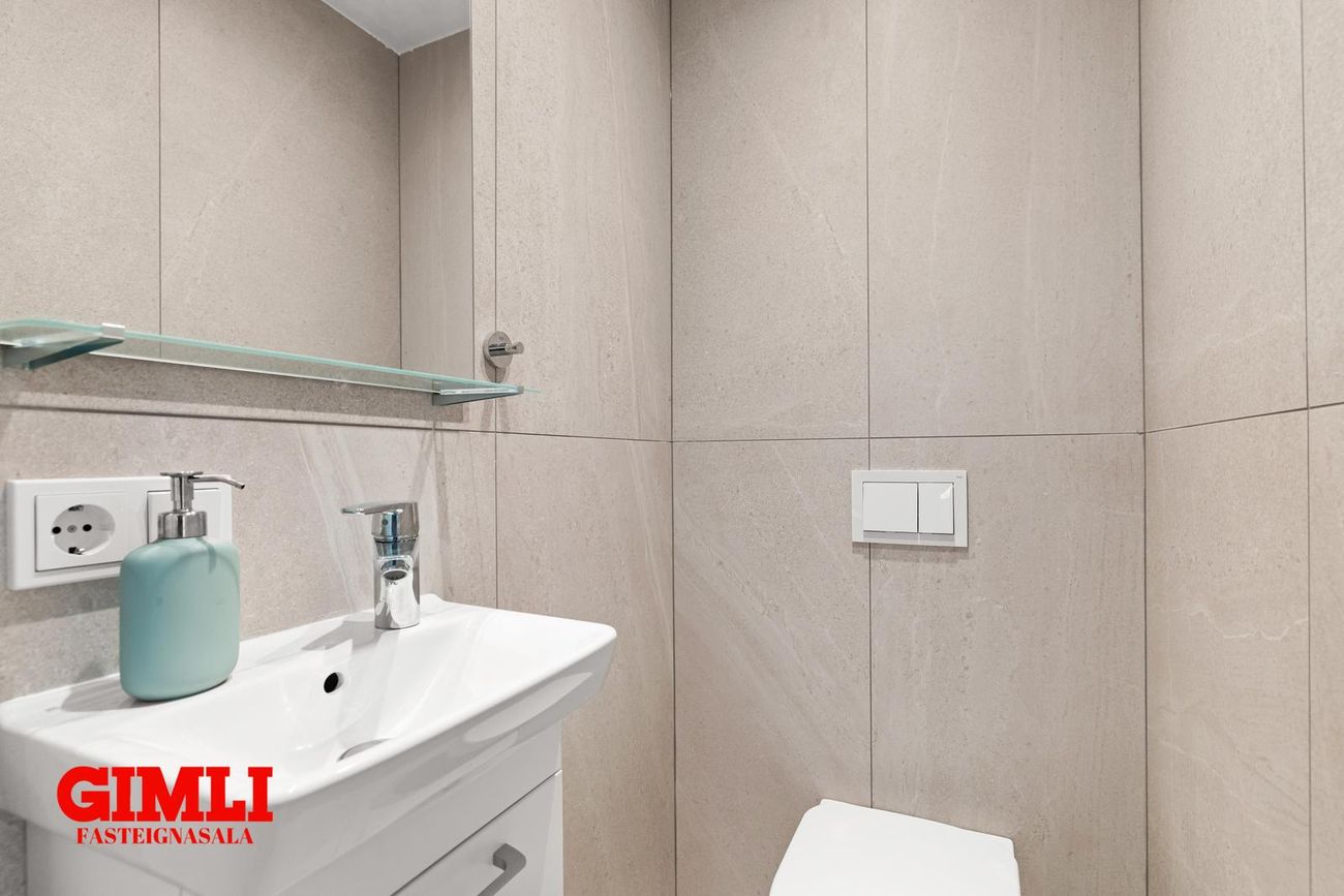 Gestasalerni: Flísalagt í hólf og gólf, gólfhiti, veggfast salerni og hvít innrétting.