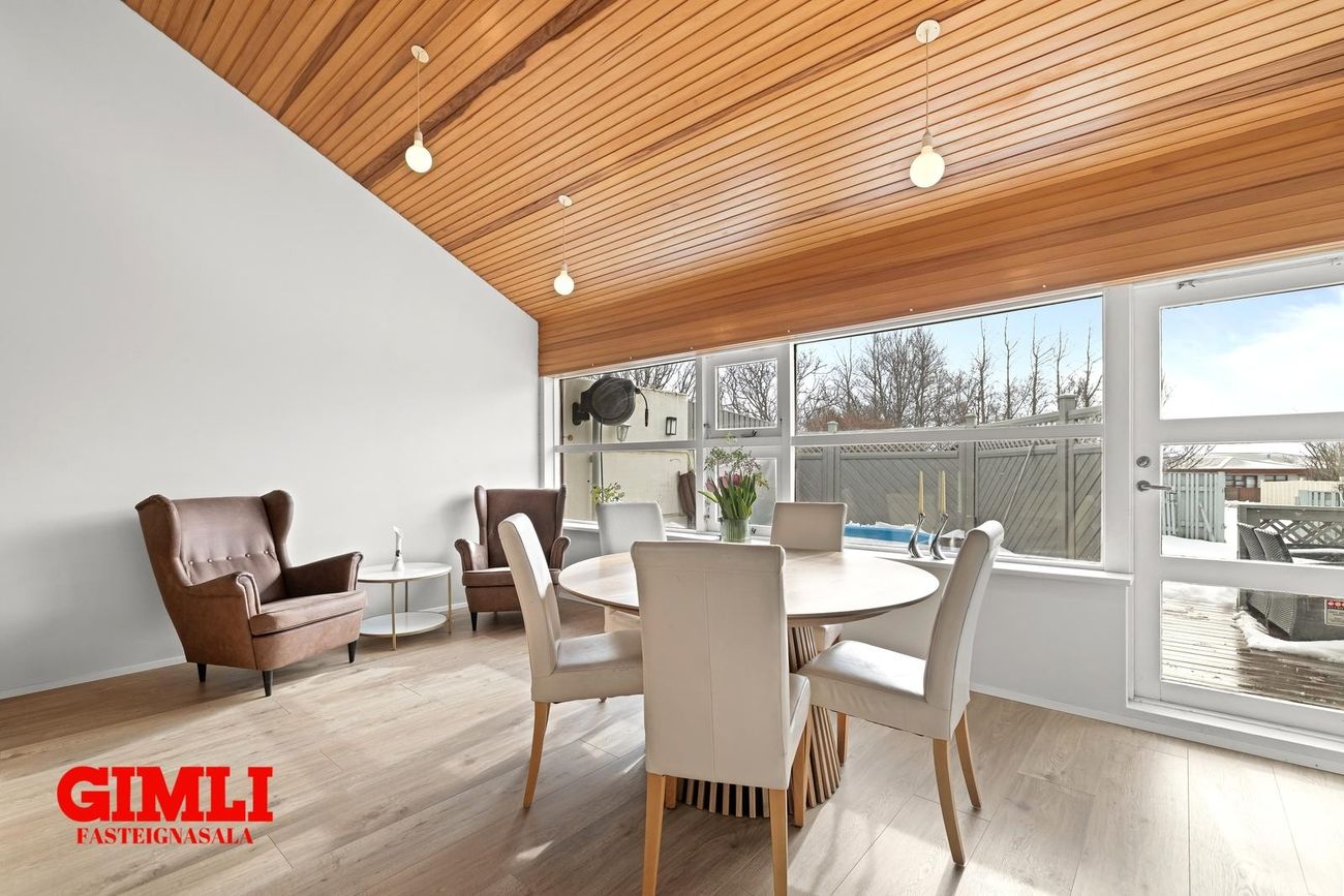 Stofa/borðstofa: Rúmgóð og björt með harðparketi á gólfi, gólfhita, aukinni lofthæð og útgengi út á sólríka timburverönd með heitum potti. Fyrir framan veröndina er rótgróinn garður.