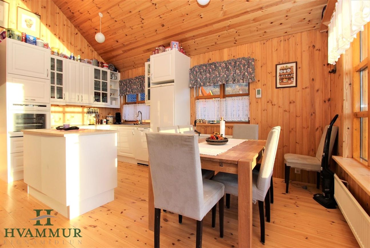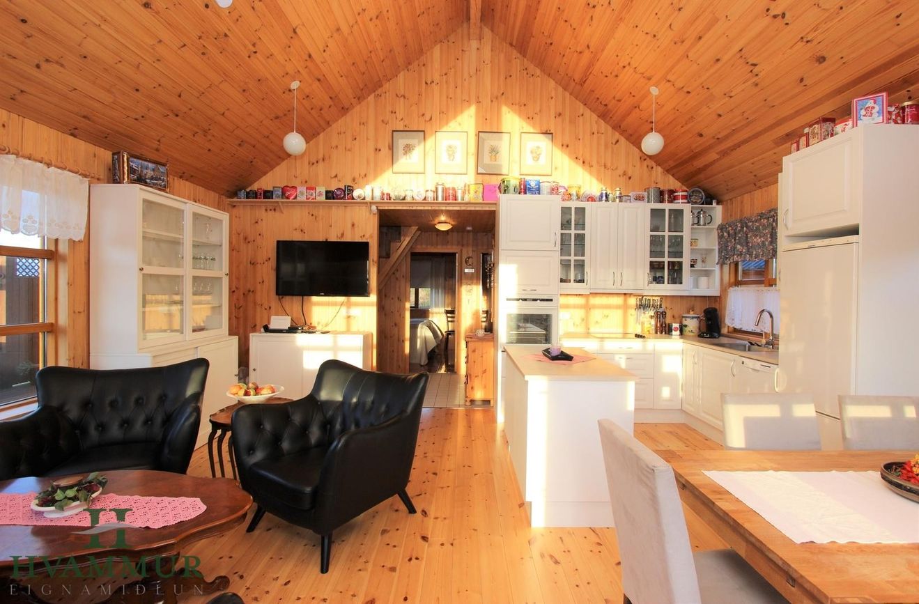 Eldhús og stofa eru í einu opnu alrými hvar loftin eru tekin upp. Gólffjalir eru á gólfum, ljós innrétting frá Freeform og útgangur á verönd til suðurs.