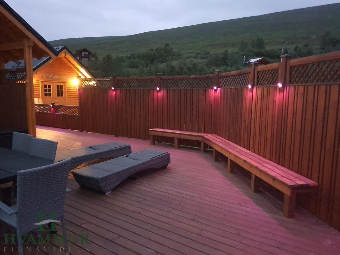 Í húsinu er öryggiskerfi og sólpallinum er góð lýsing.