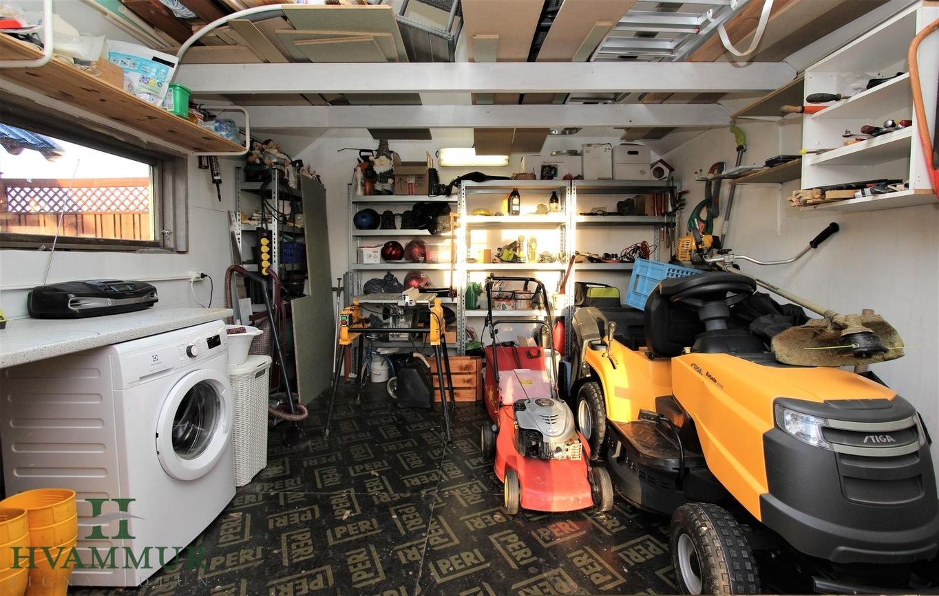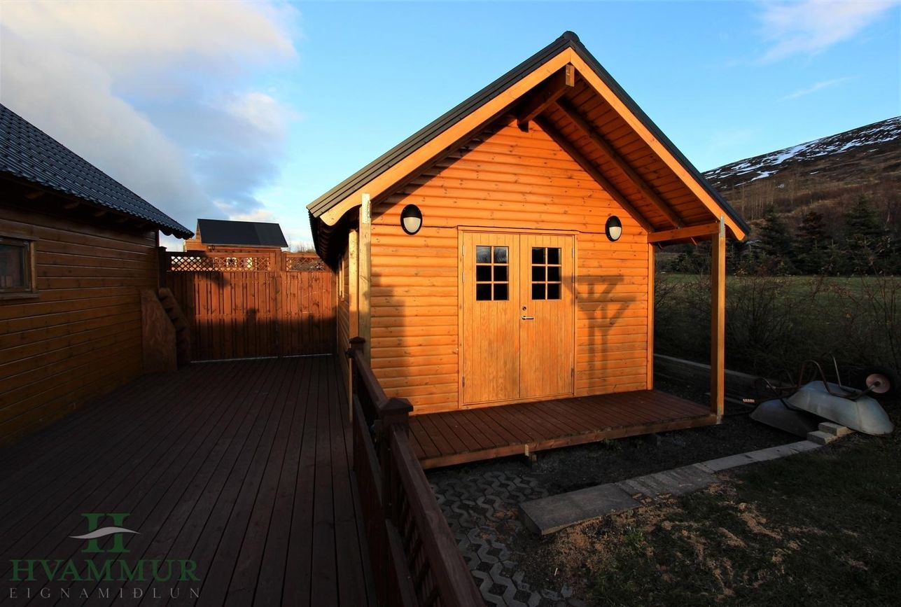 Geymsluhús á lóð er einangrað og upphitað og tengist pallinum umhverfis húsið.