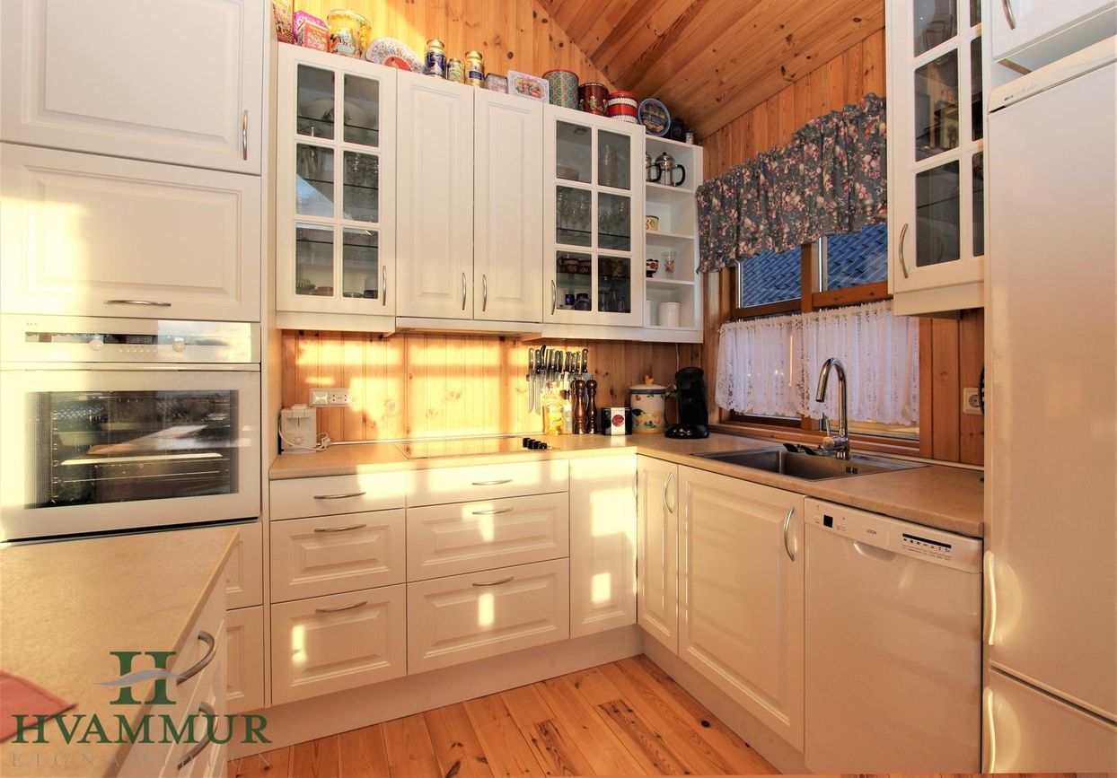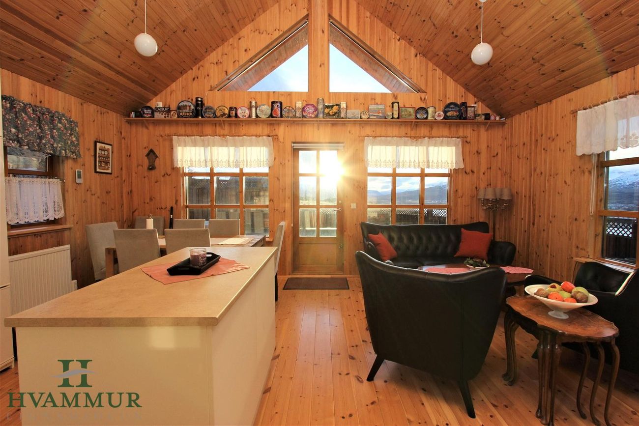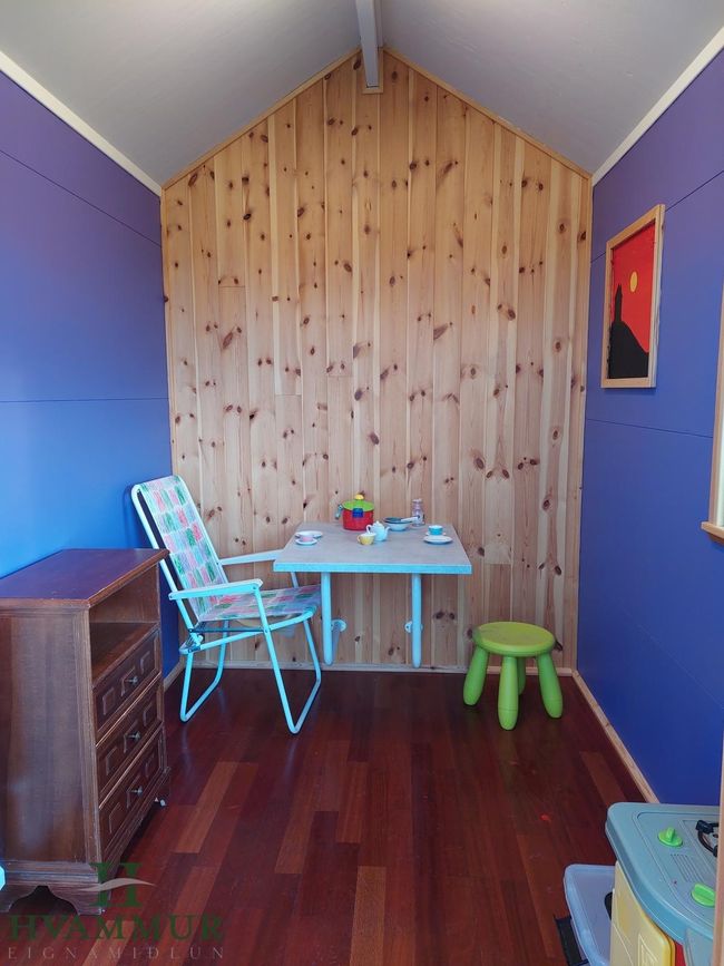 Húsið skiptist í forstofu, eldhús og stofu í einu alrými, tvö svefnherbergi, baðherbergi og lokað svefnloft auk geymsluskúrs og krakkahúss/gestahúss.Forstofa er með flísum á gólfi og úr henni er stigi upp á svefnloftið.