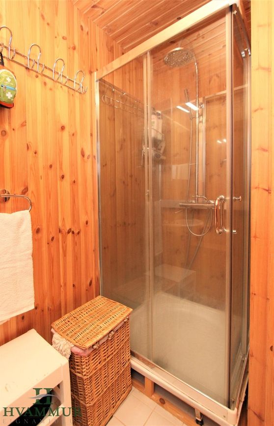 Baðherbergi er með flísum á gólfi og sturtuklefa. Opnanlegur gluggi er á baðherberginu.