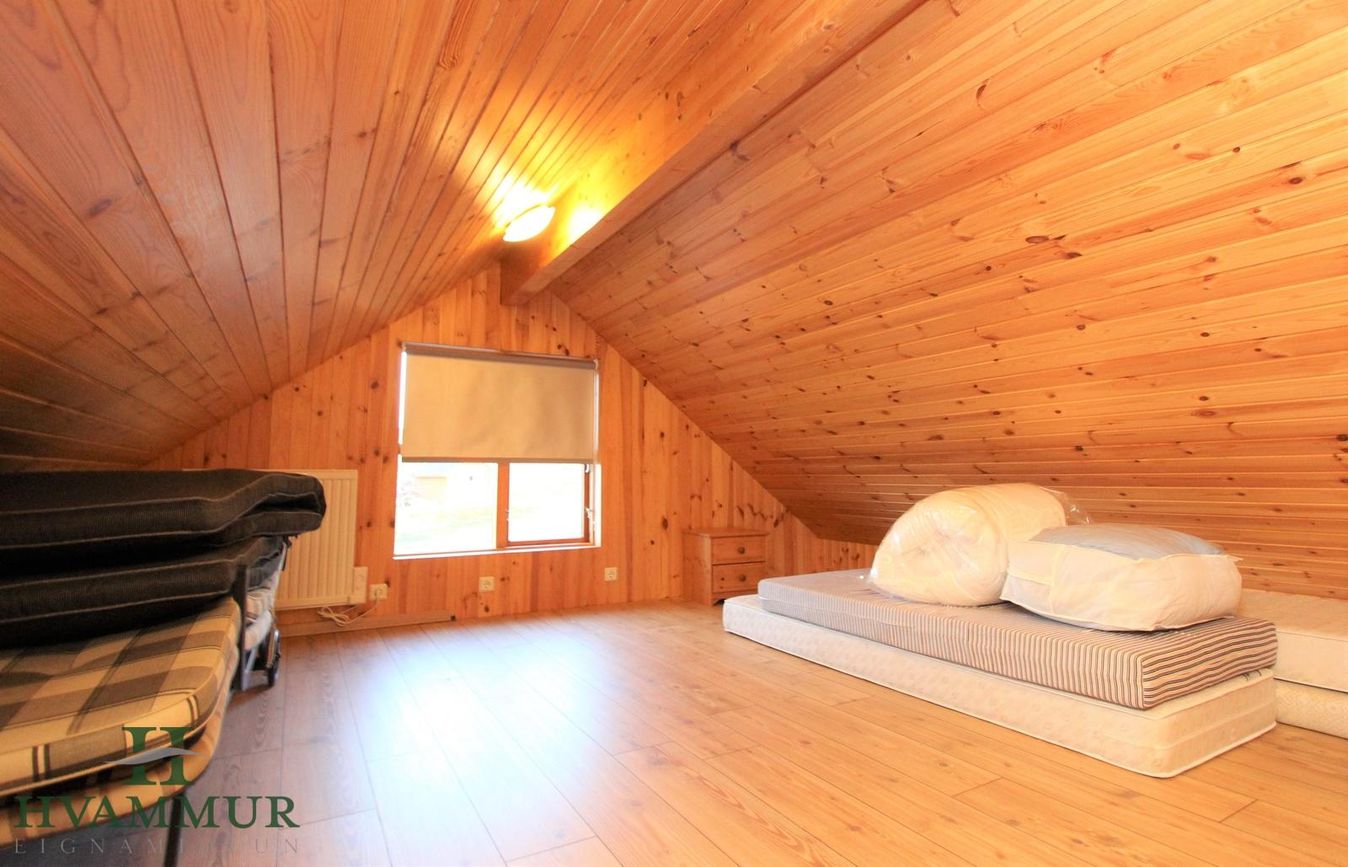 Svefnloft er rúmgott og lokað, með harðparketi á gólfi.