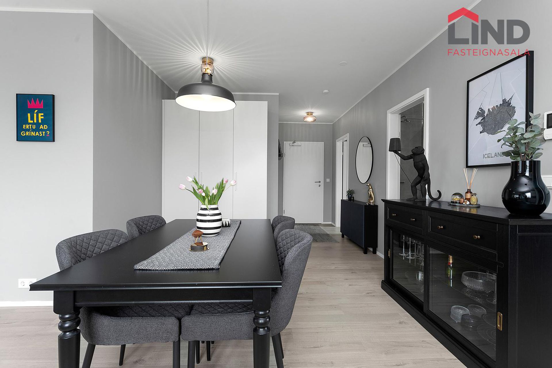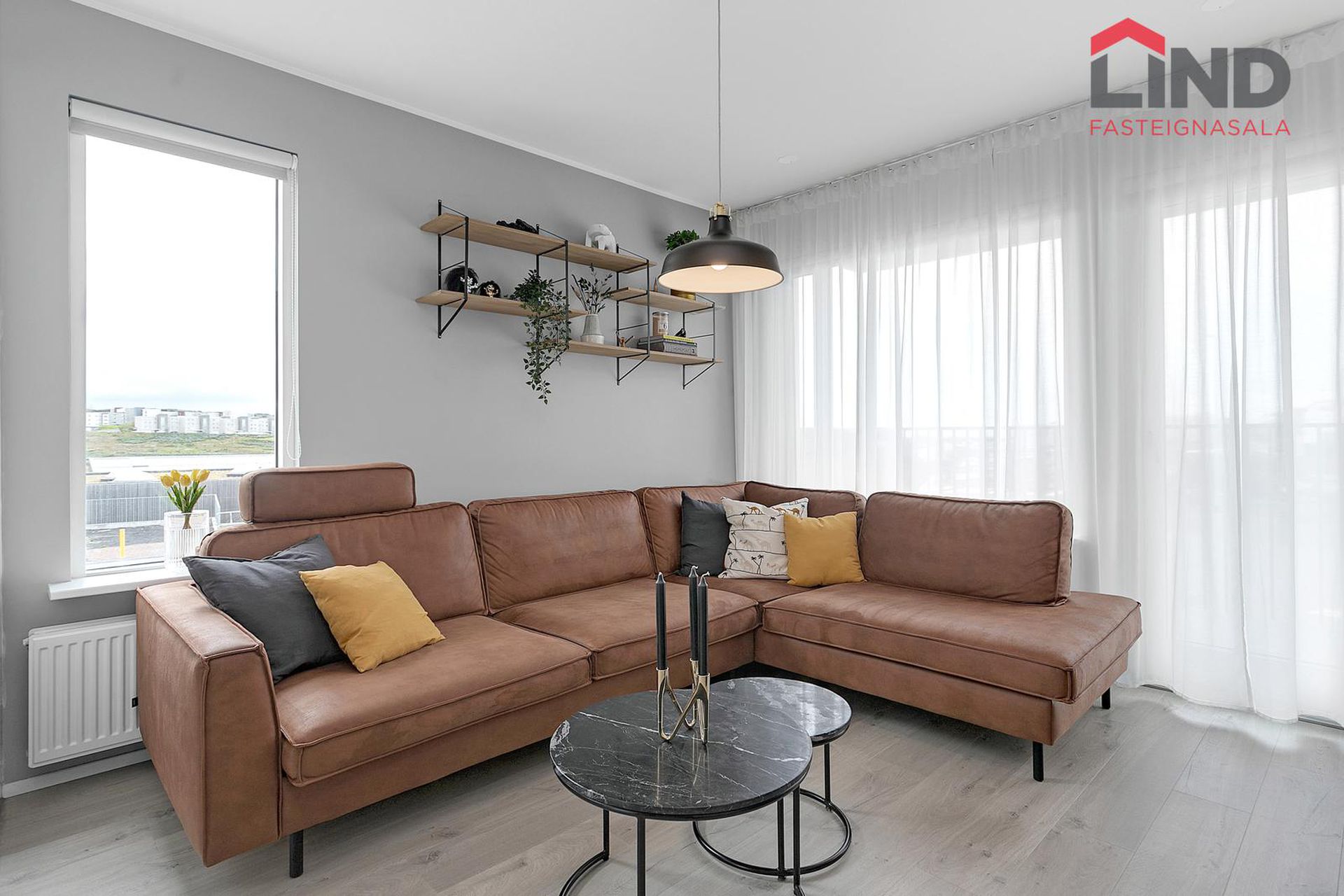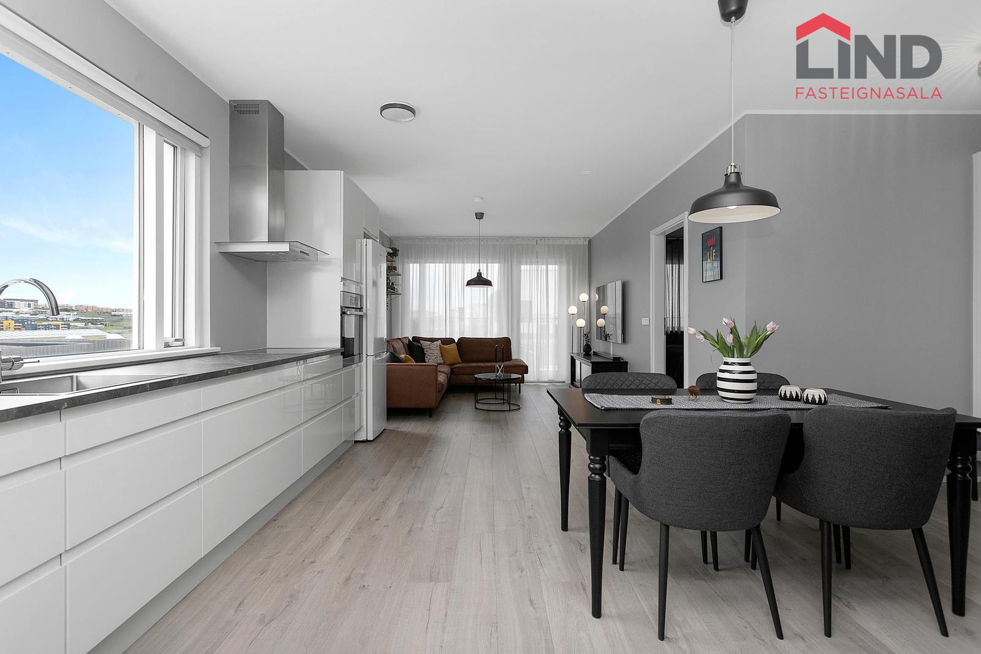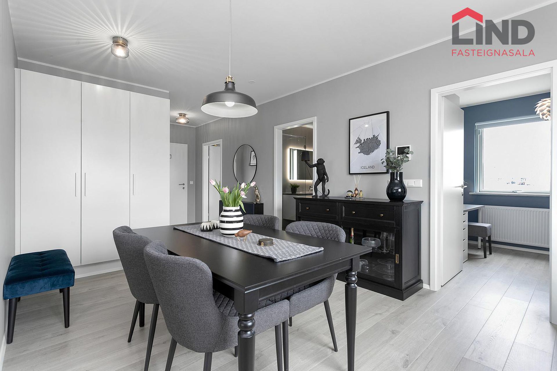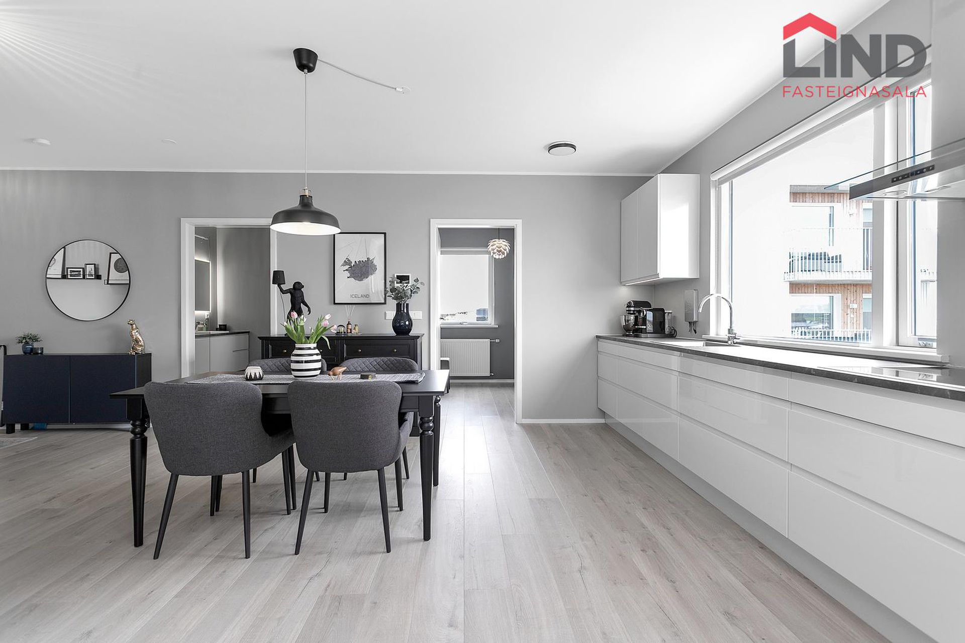 Í forstofu eru fataskápar og parket á gólfi. Til vinstri er skráð geymsla innan íbúðar, björt með stórum glugga sem hægt er að nota sem skrifstofu eða barnaherbergi. Frá Forstofu er gengið inn í alrými eignar. Þar er fallegt eldhús. Hvít innrétting með innbyggðri uppþvottavél og gert ráð fyrir ísskáp í innréttingu. Parket á gólfi. Stofa og borðstofa einnig í alrými eignar. Parket á gólfi. Þaðan er útgengt út á vestur svalir. Við hlið stofu er rúmgott og bjart hjónaherbergi. Parket á gólfi og fataskápar. Bjart barnaherbergi við hlið eldhúss. Parket á gólfi og einfaldur fataskápur. Fallegt baðherbergi með sturtu, upphengdu WC, hvítri innréttingu með upplýstum spegli fyrir ofan skolvask. Gert er ráð fyrir þvottavél og þurrkara inná baðherbergi.