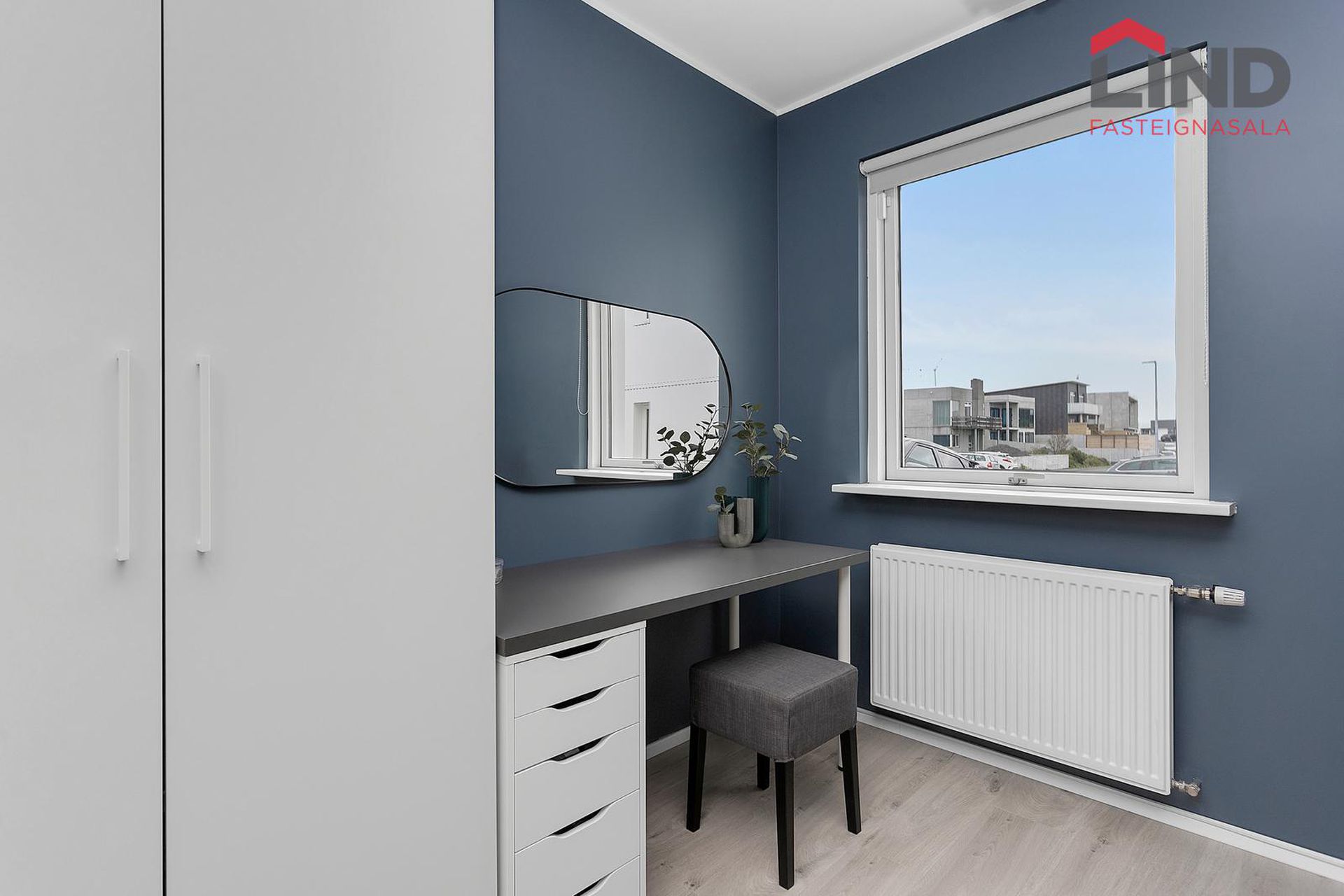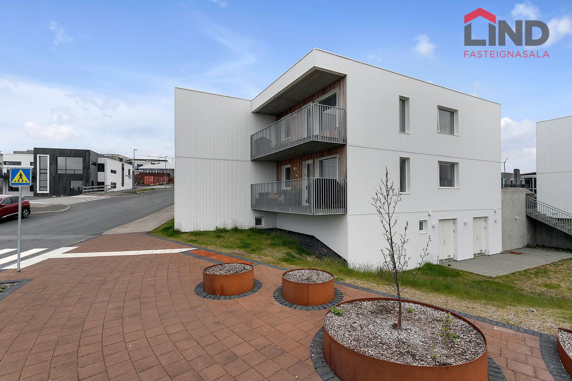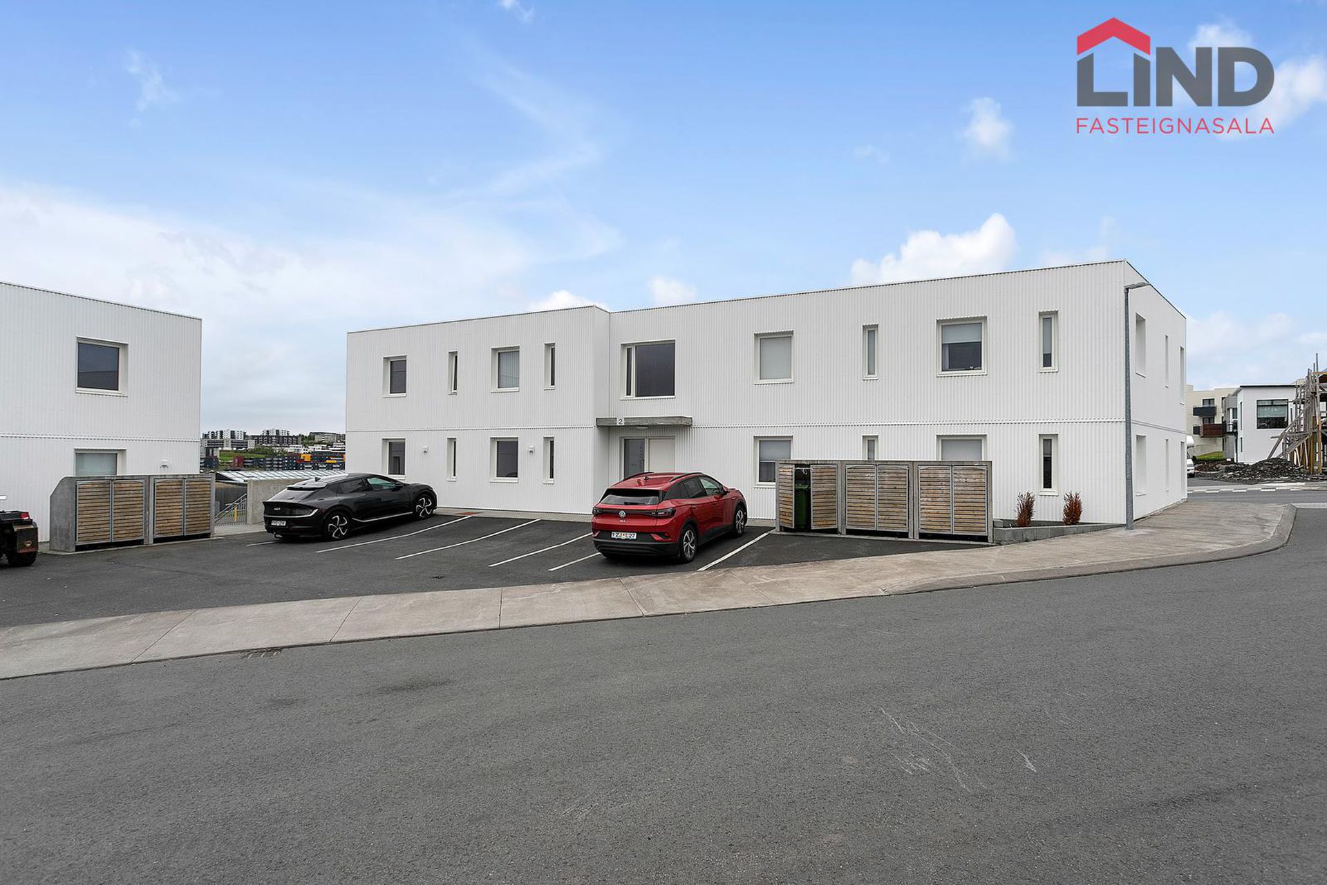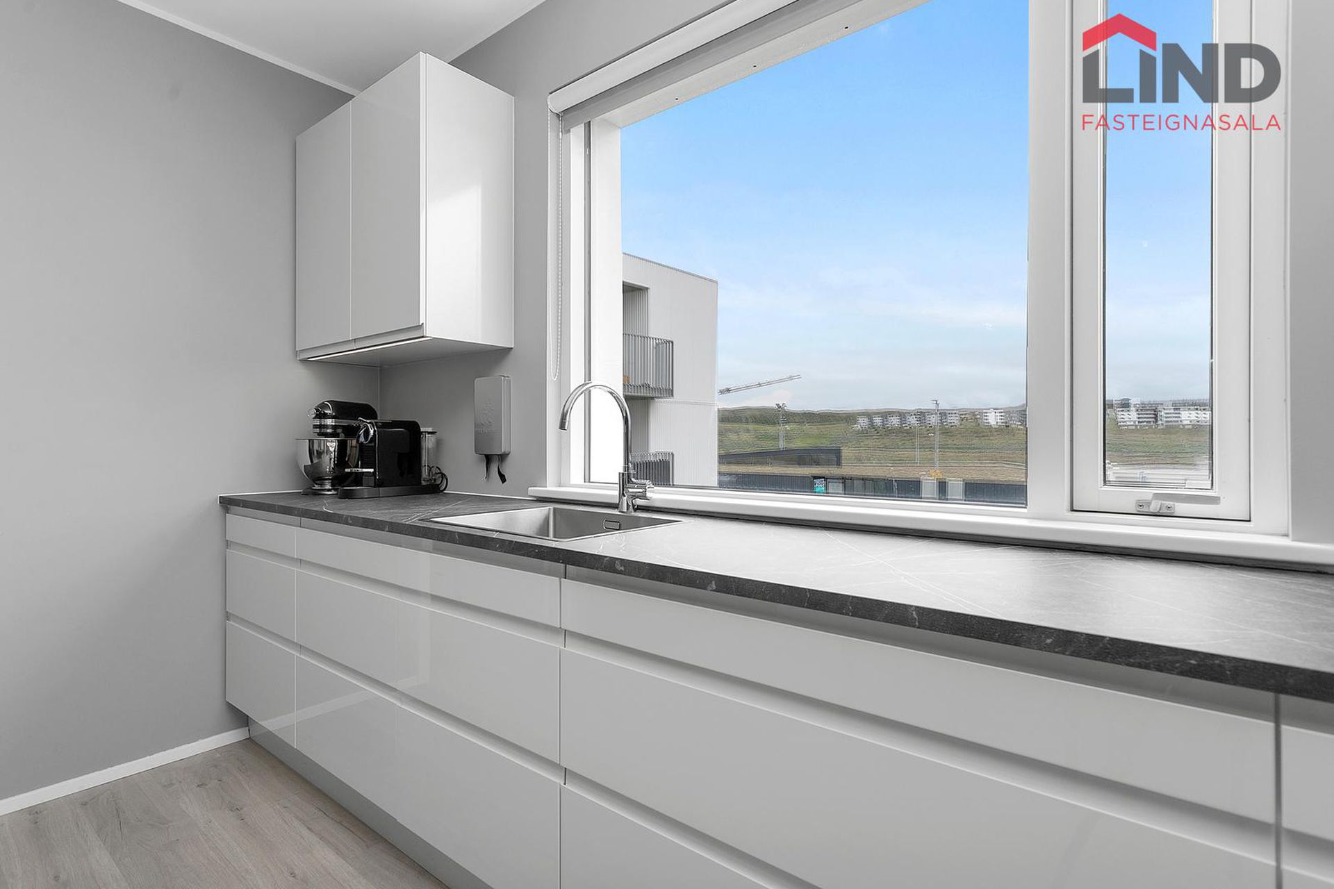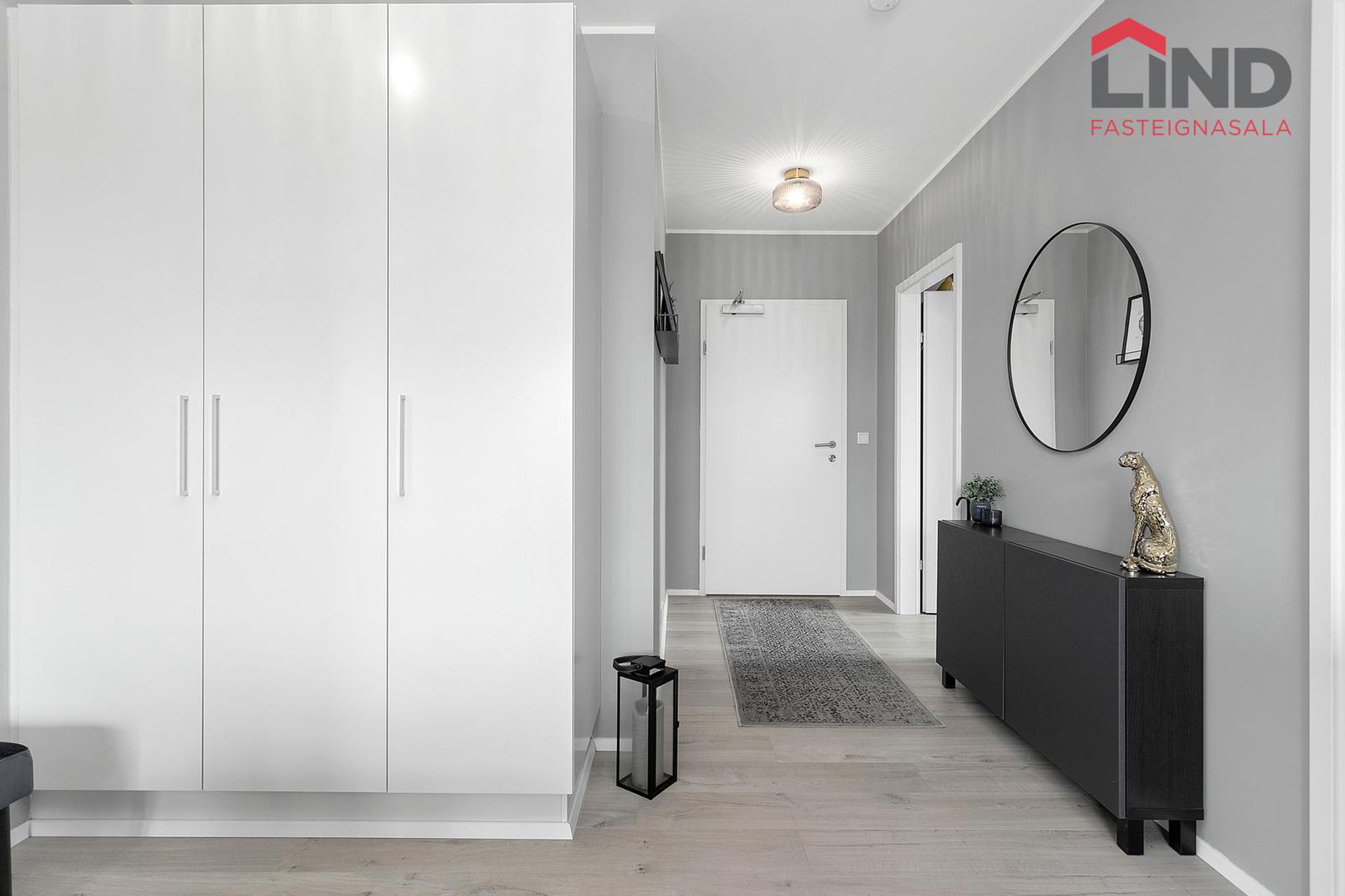 Í forstofu eru fataskápar og parket á gólfi. Til vinstri er skráð geymsla innan íbúðar, björt með stórum glugga sem hægt er að nota sem skrifstofu eða barnaherbergi. Frá Forstofu er gengið inn í alrými eignar. Þar er fallegt eldhús. Hvít innrétting með innbyggðri uppþvottavél og gert ráð fyrir ísskáp í innréttingu. Parket á gólfi. Stofa og borðstofa einnig í alrými eignar. Parket á gólfi. Þaðan er útgengt út á vestur svalir. Við hlið stofu er rúmgott og bjart hjónaherbergi. Parket á gólfi og fataskápar. Bjart barnaherbergi við hlið eldhúss. Parket á gólfi og einfaldur fataskápur. Fallegt baðherbergi með sturtu, upphengdu WC, hvítri innréttingu með upplýstum spegli fyrir ofan skolvask. Gert er ráð fyrir þvottavél og þurrkara inná baðherbergi.
